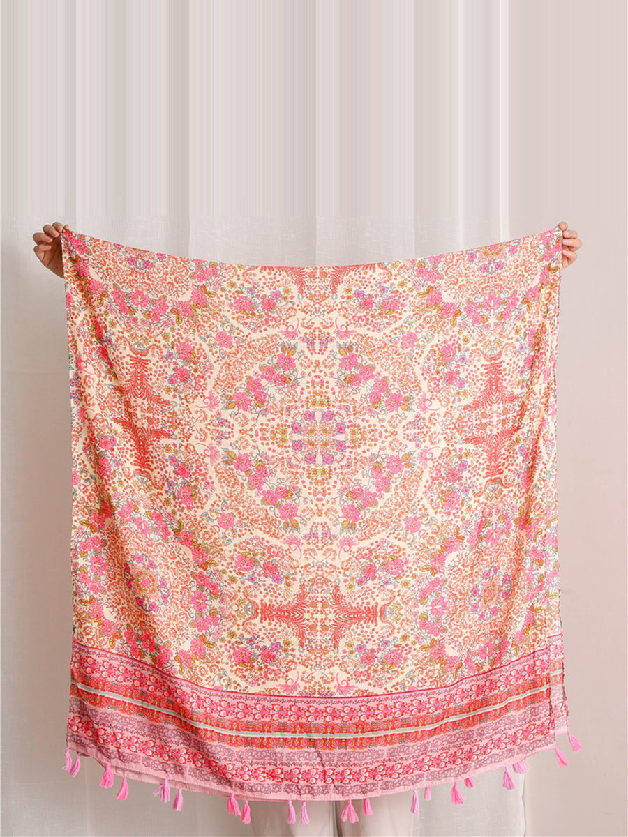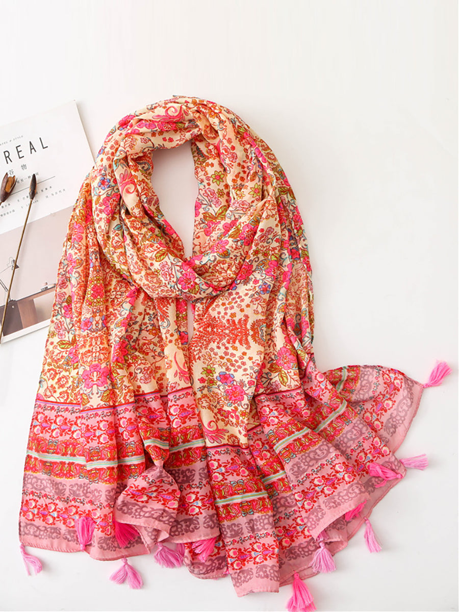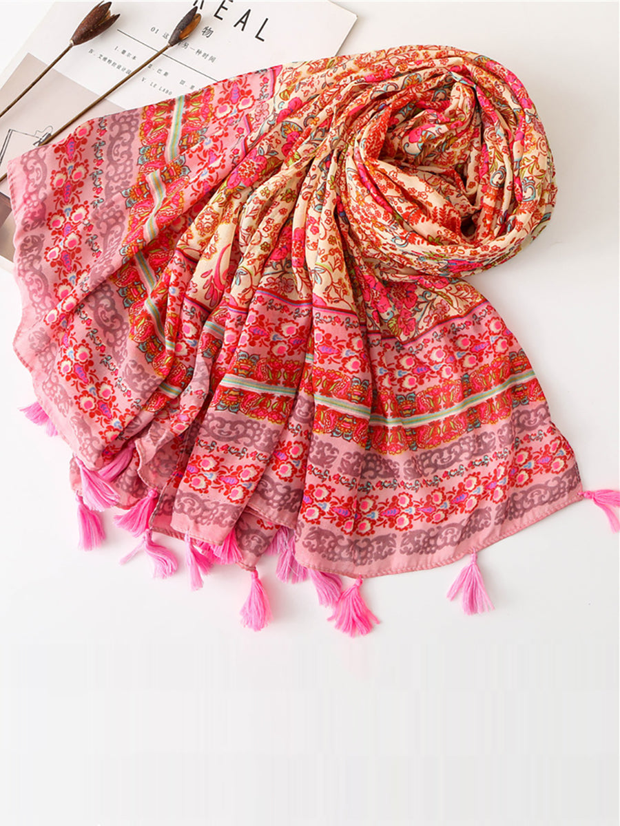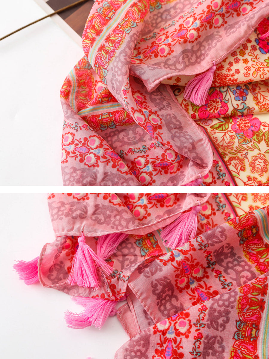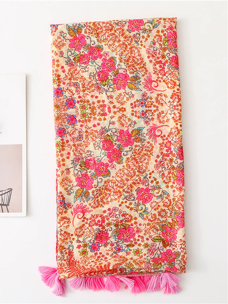 Women Ethnic Style Cotton Floral Tassel Scarf
