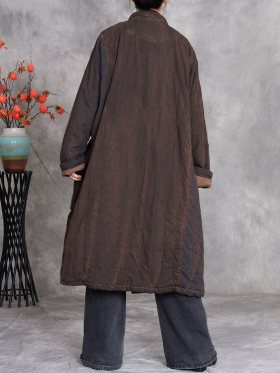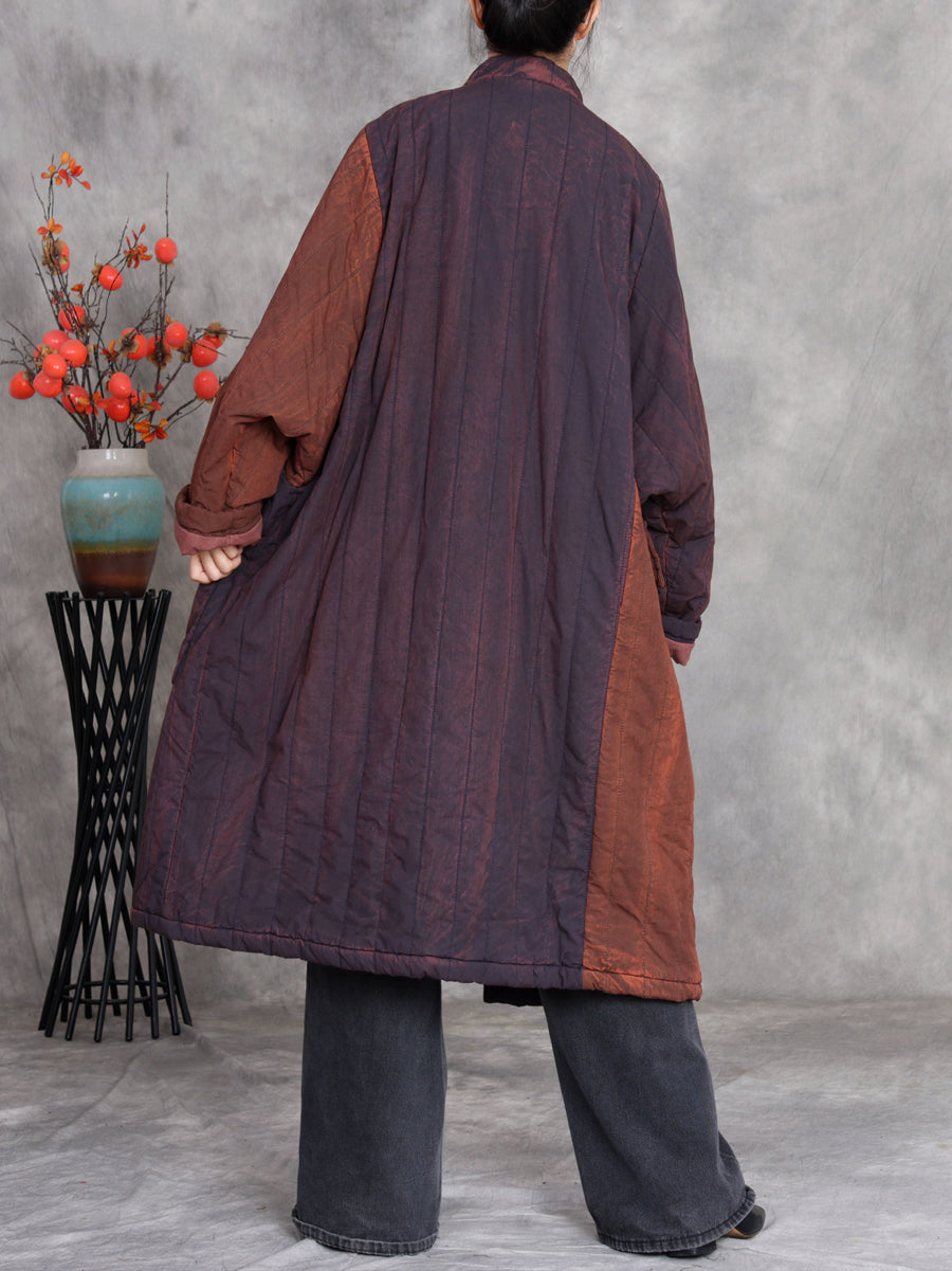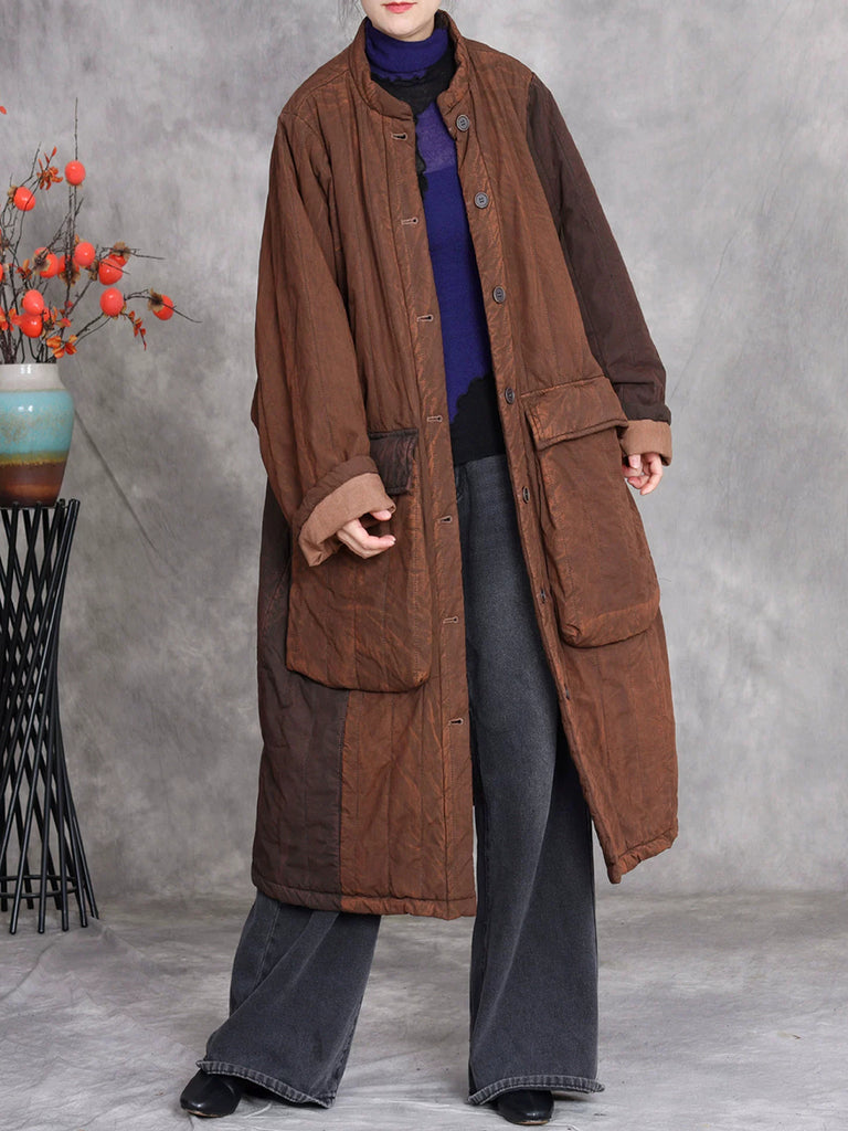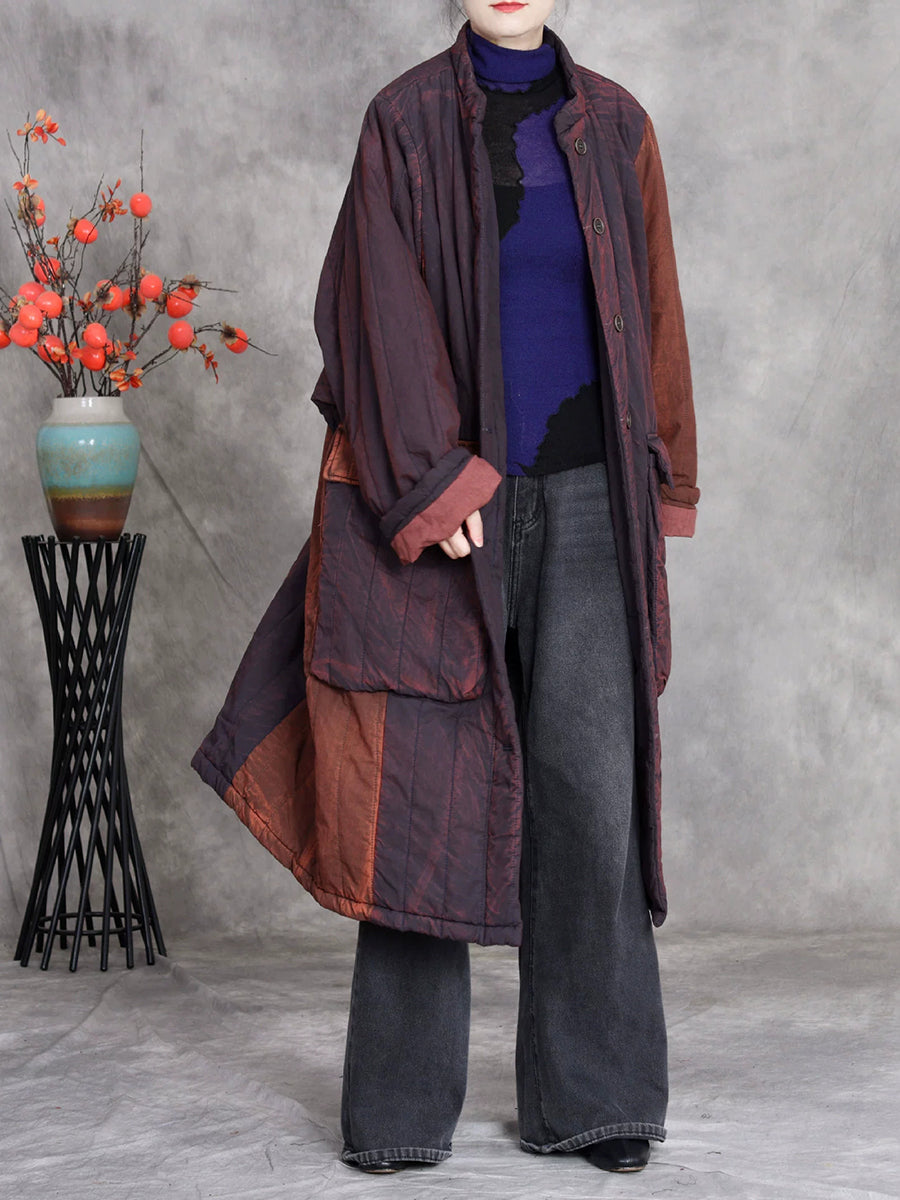 Women Retro Winter Colorblock Stand Collar Padded Coat