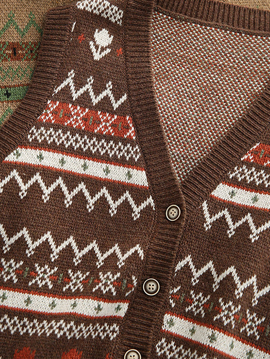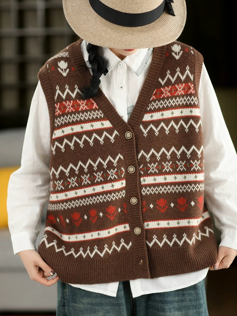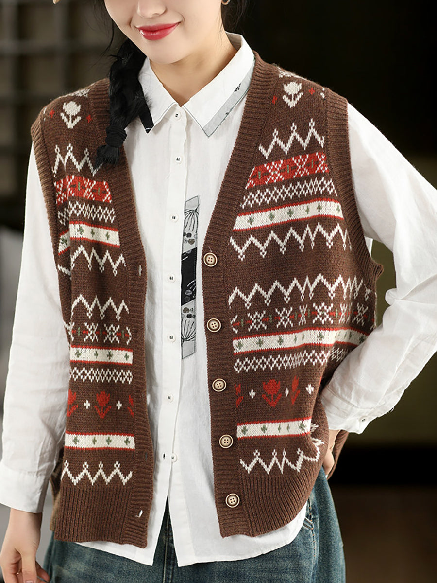 Women Spring Retro Jacquard V-Neck Vest