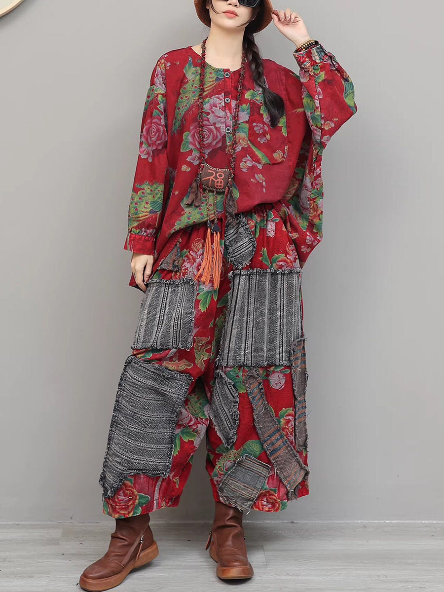 Women Spring Vintage Flower Patchwork O-Neck Suits