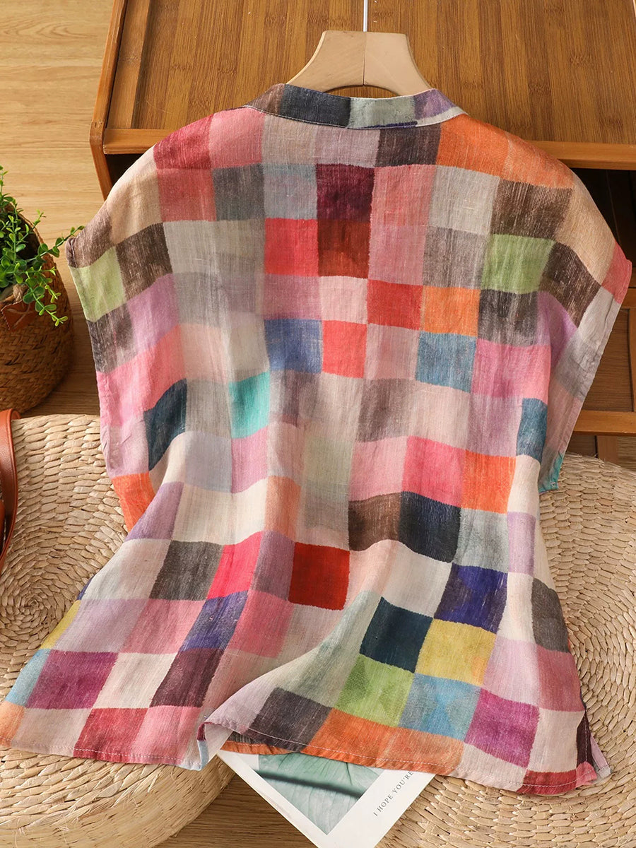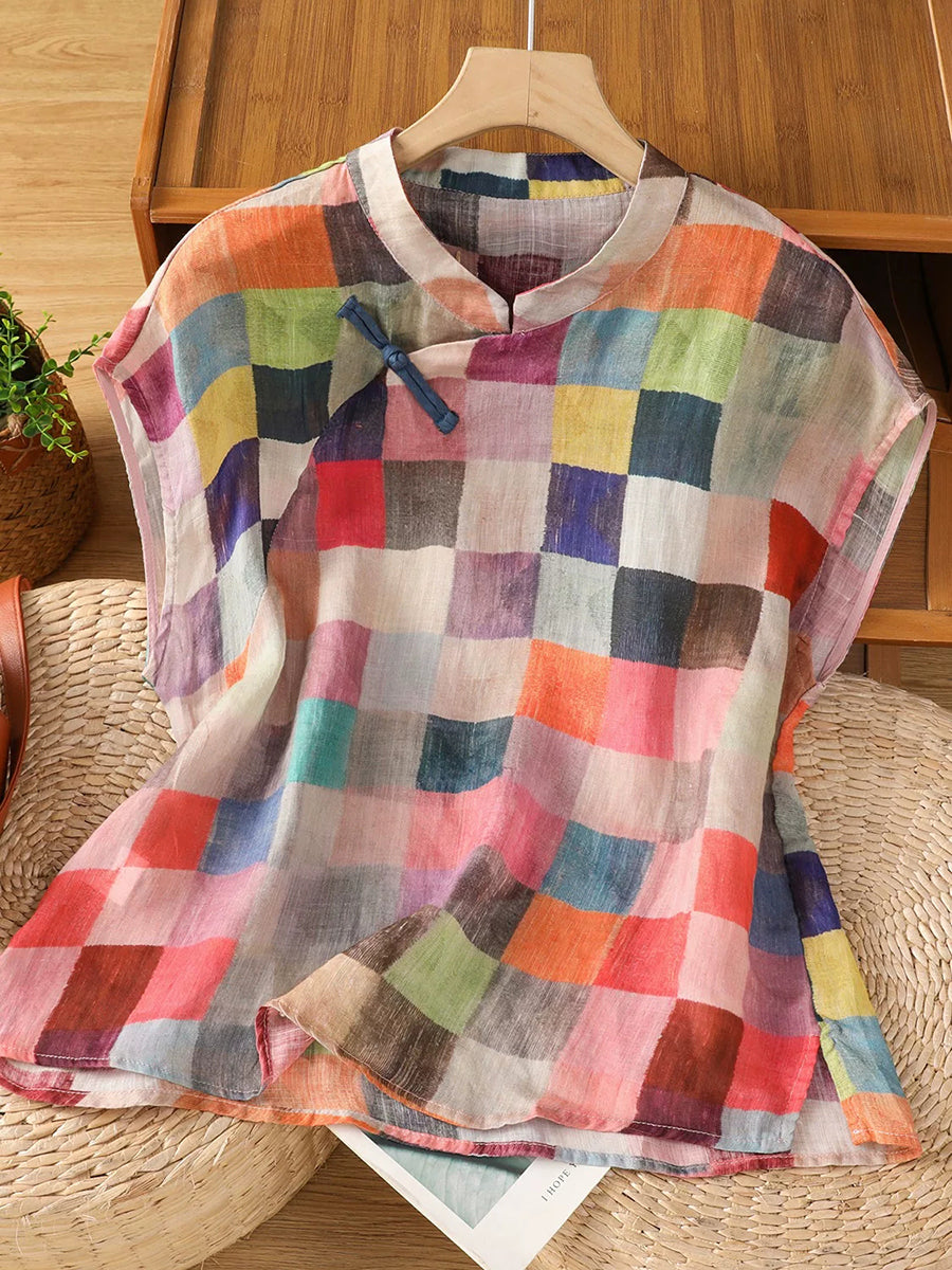 Women Summer Ethnic Plaid Stand Collar Blouse