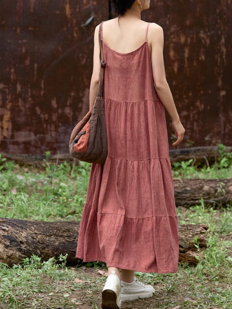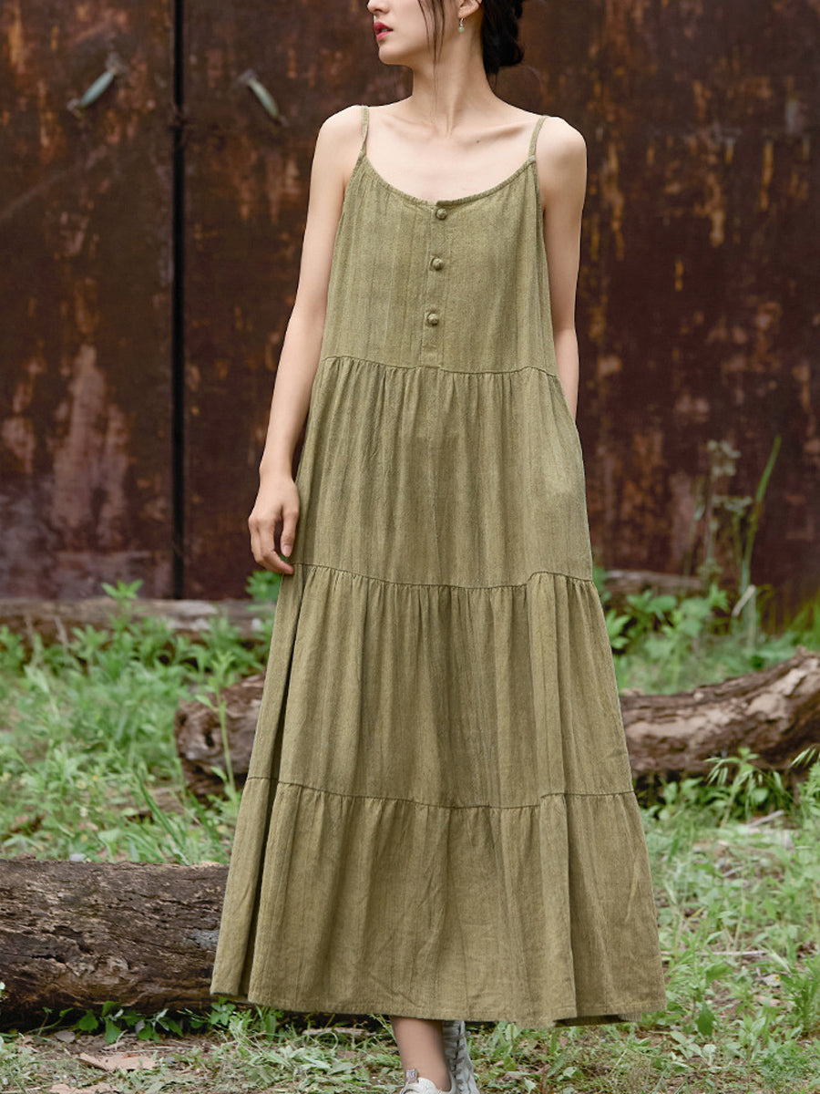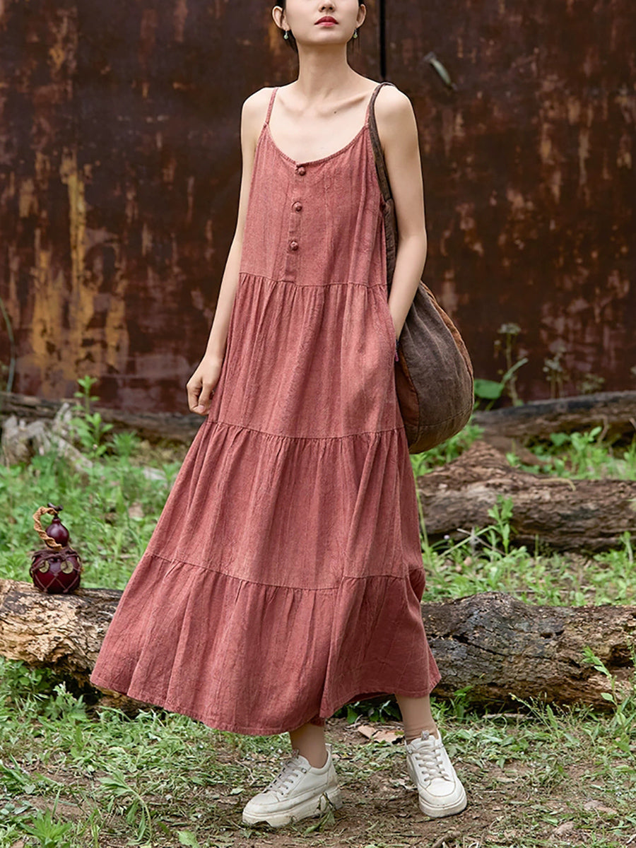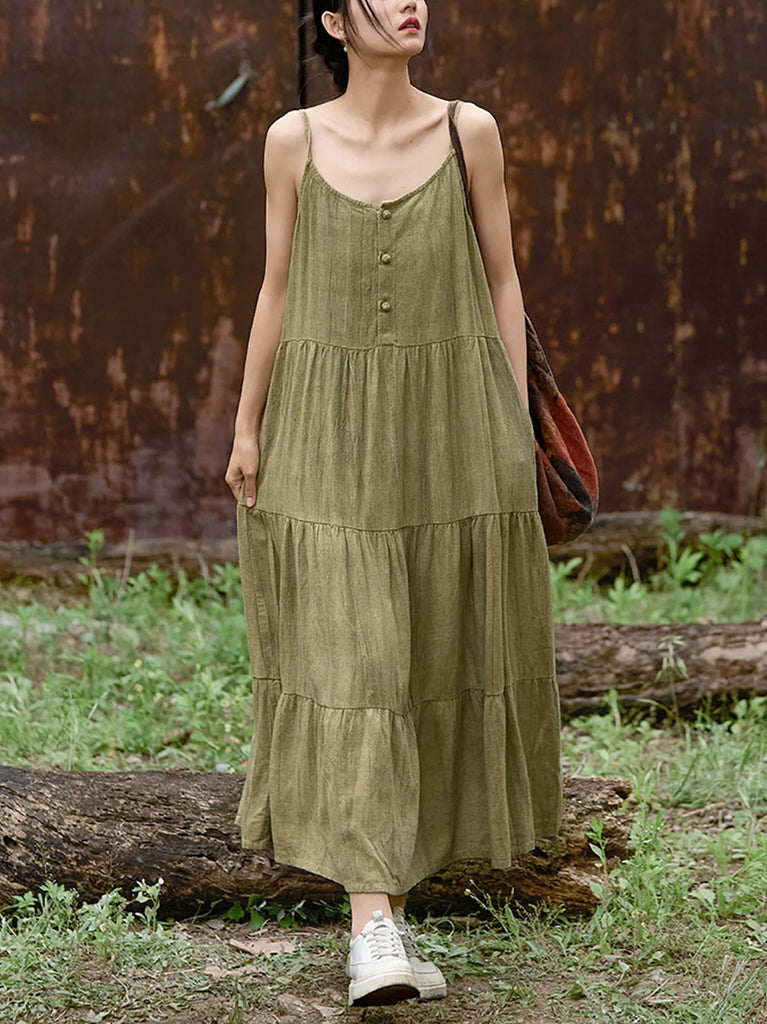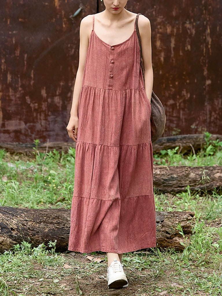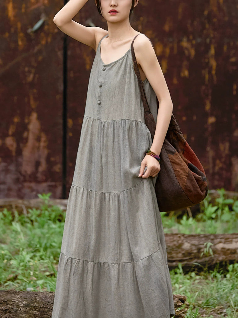Women Summer Pure Color O-Neck Linen Maxi Vest Dress