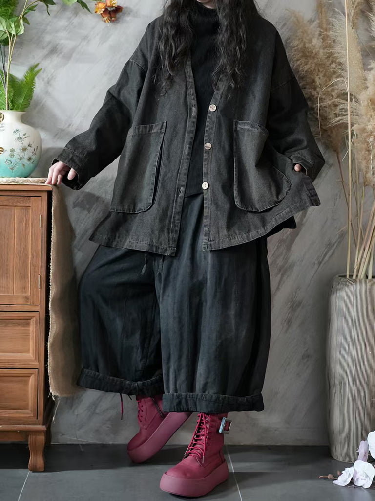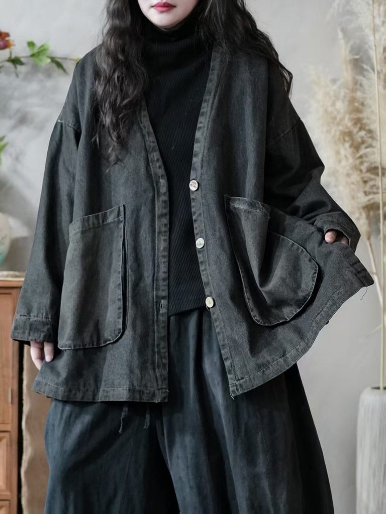Women Vintage Autumn Pure Color Denim V-Neck Coat