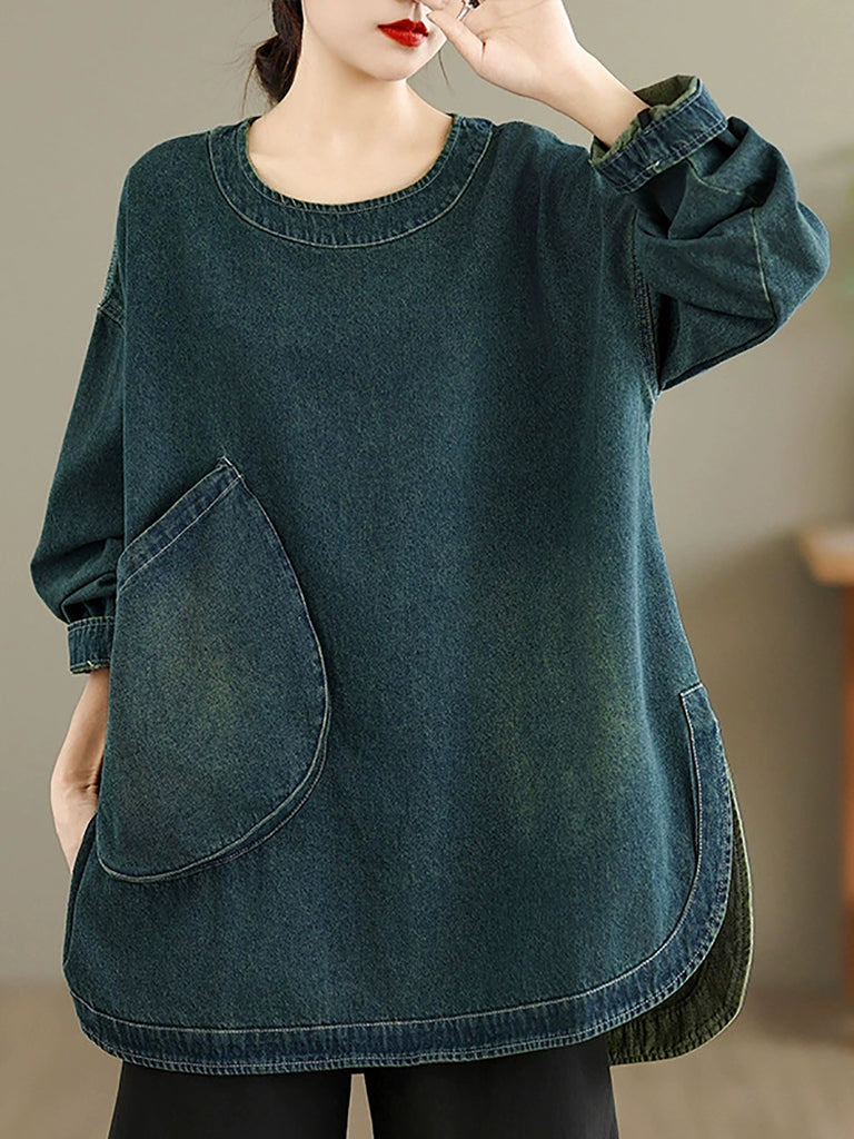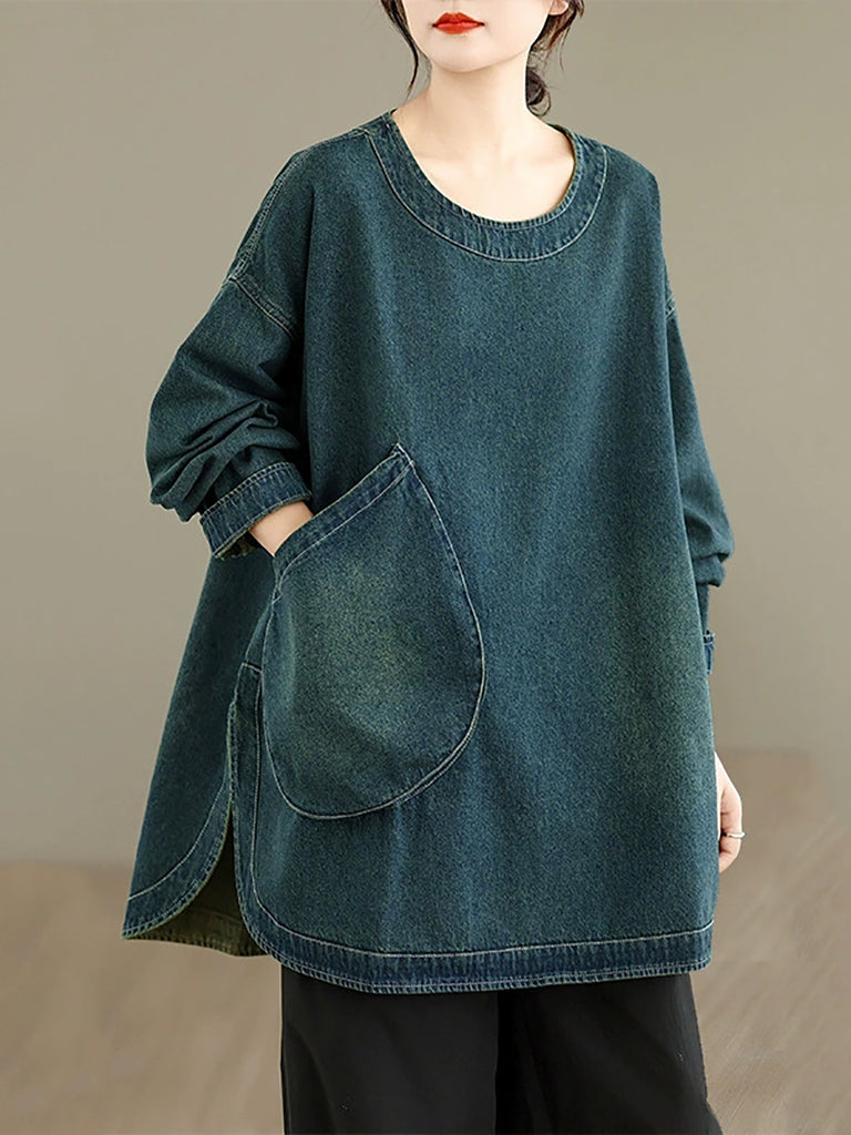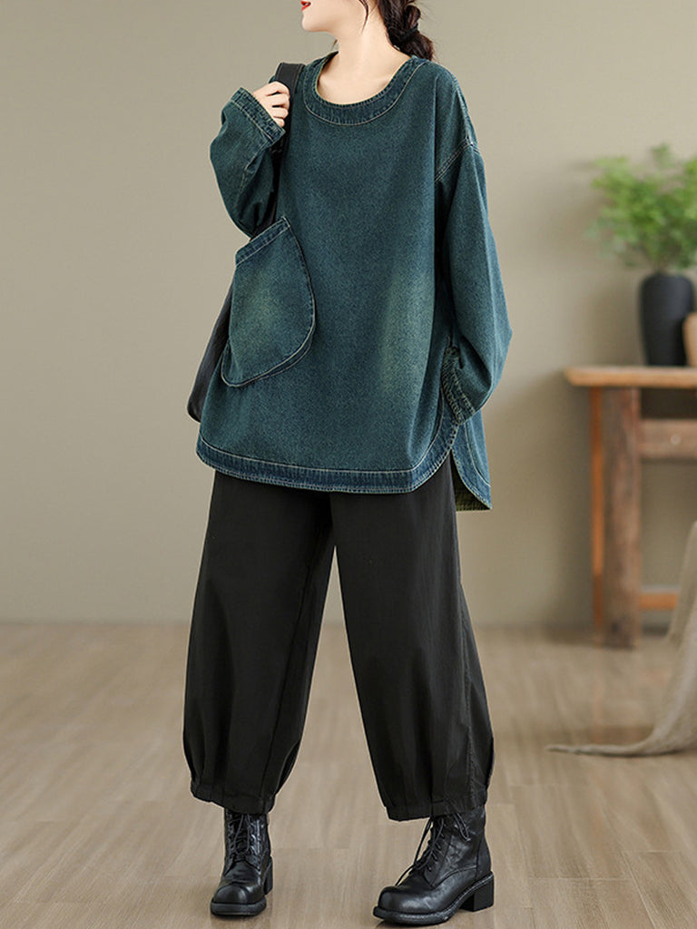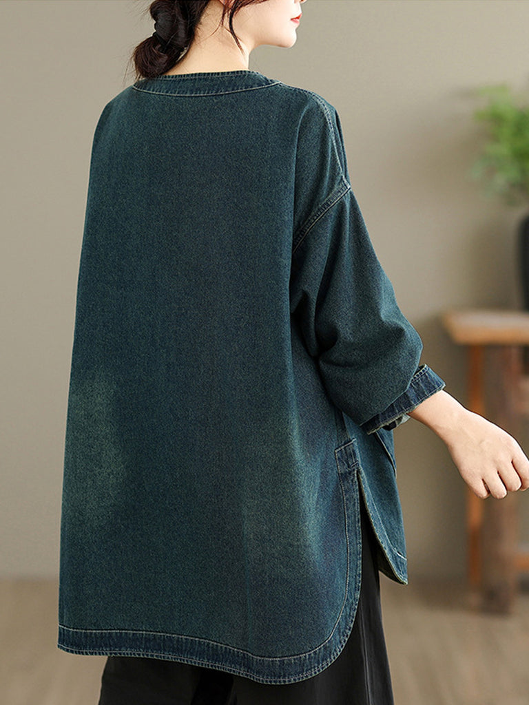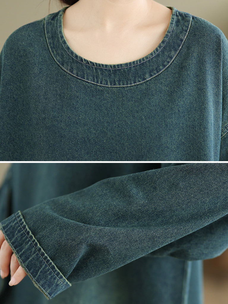 Women Vintage Autumn Pure Color O-Neck Denim Shirt