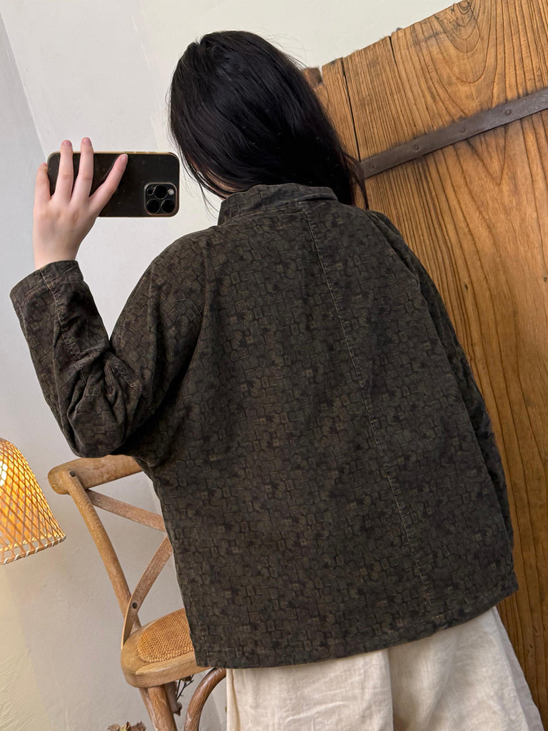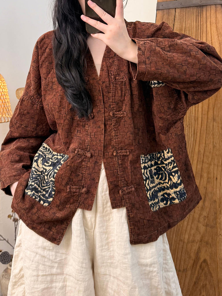 Women Vintage Autumn Pure Color Spliced V-Neck Cotton Jacket