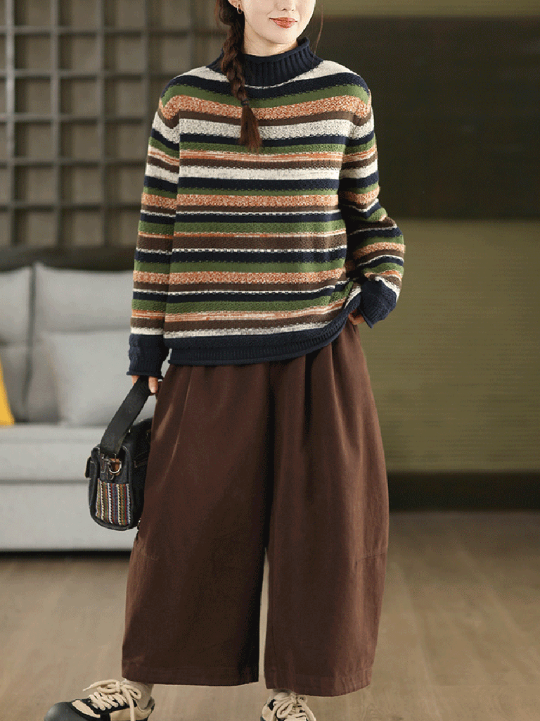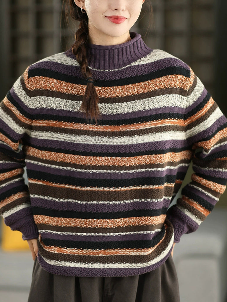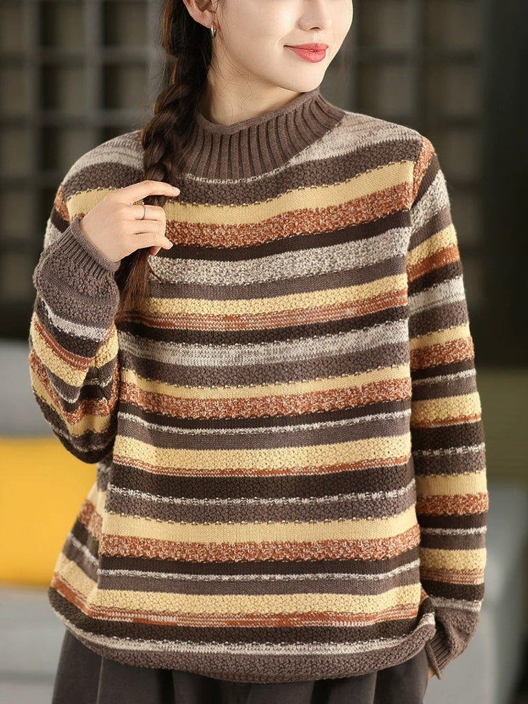 Women Vintage Autumn Stripe Half-Turtleneck Sweater