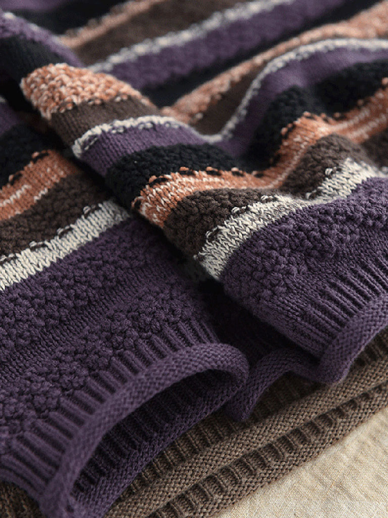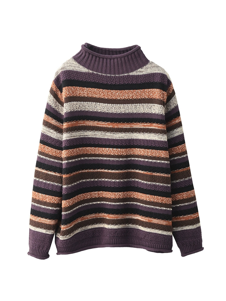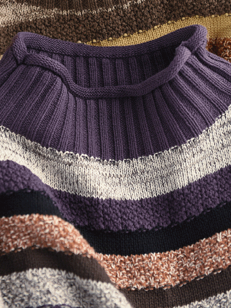 Cotton sweater with a half-turtleneck collar, full sleeves, and vintage stripe pattern. Perfect for autumn and winter layering.
