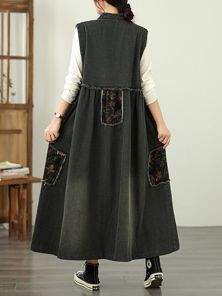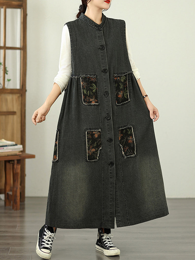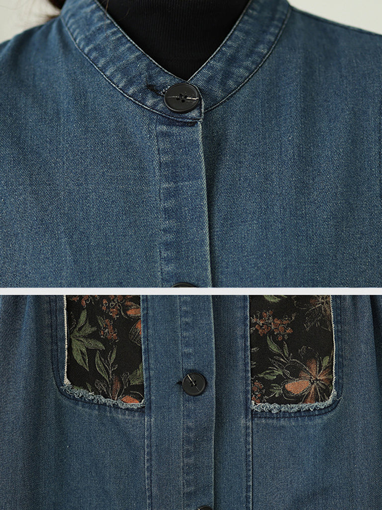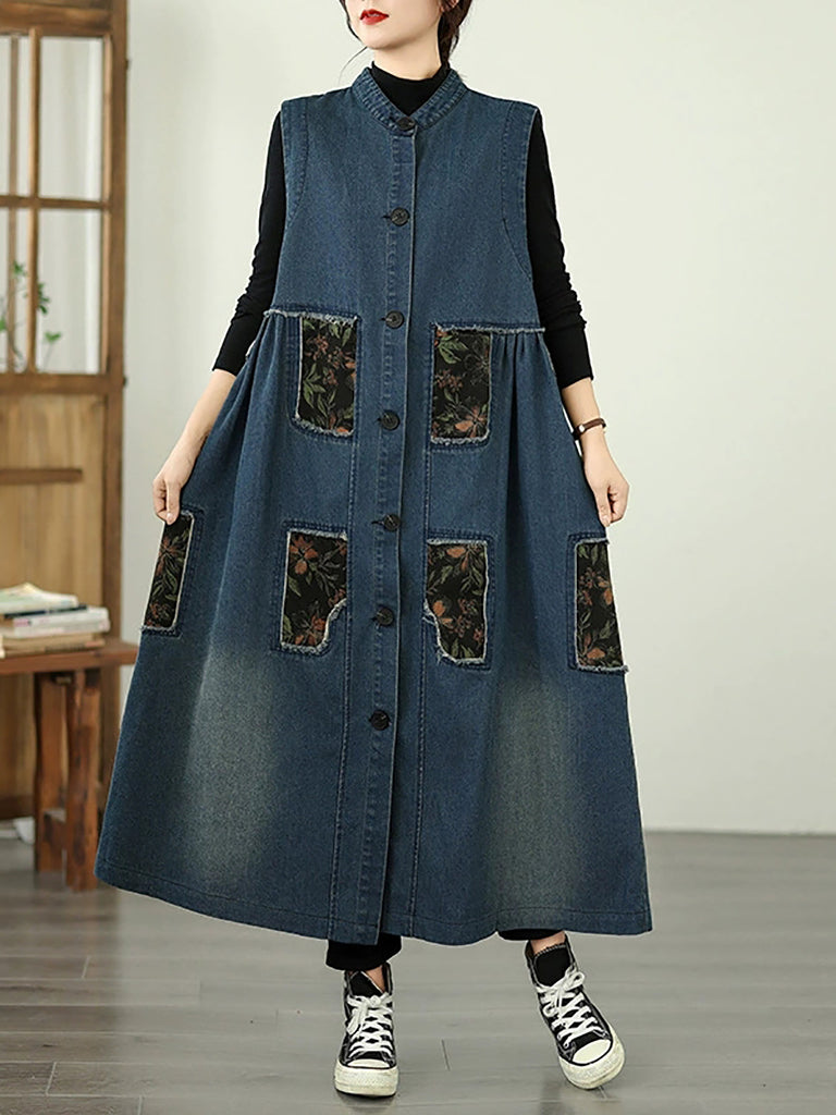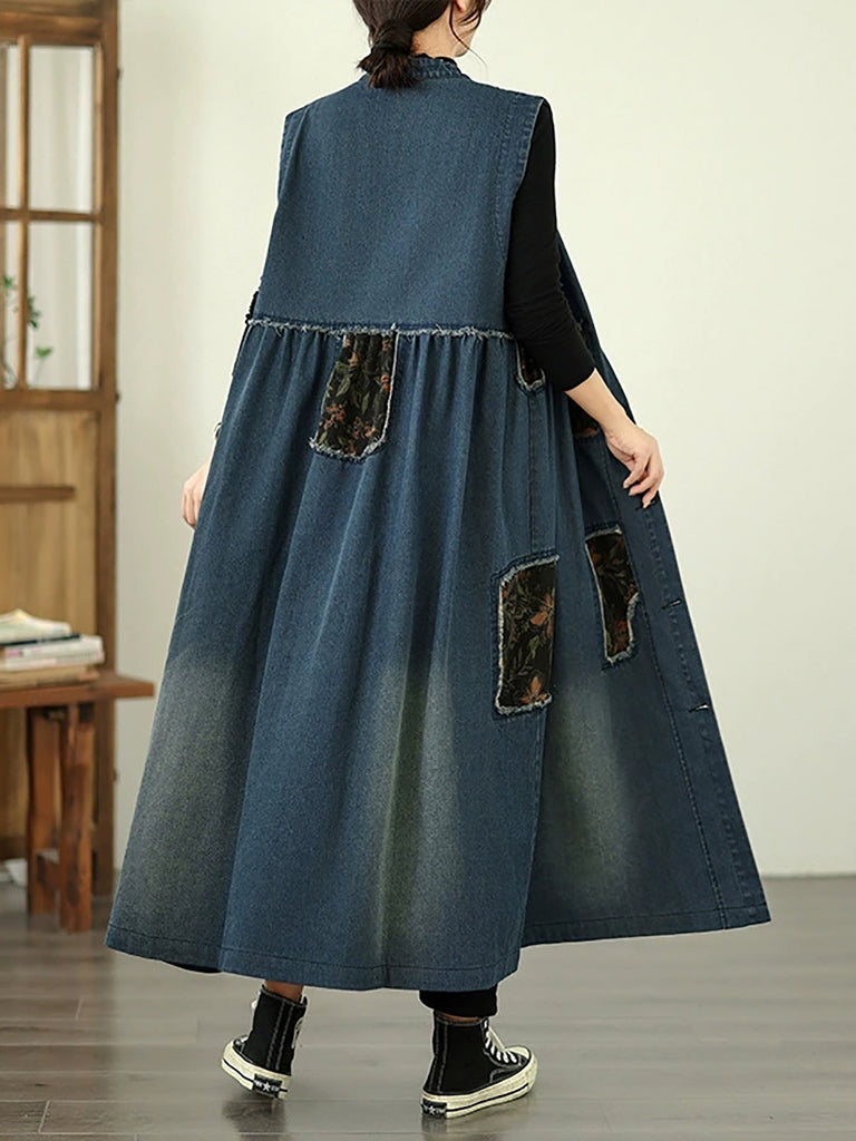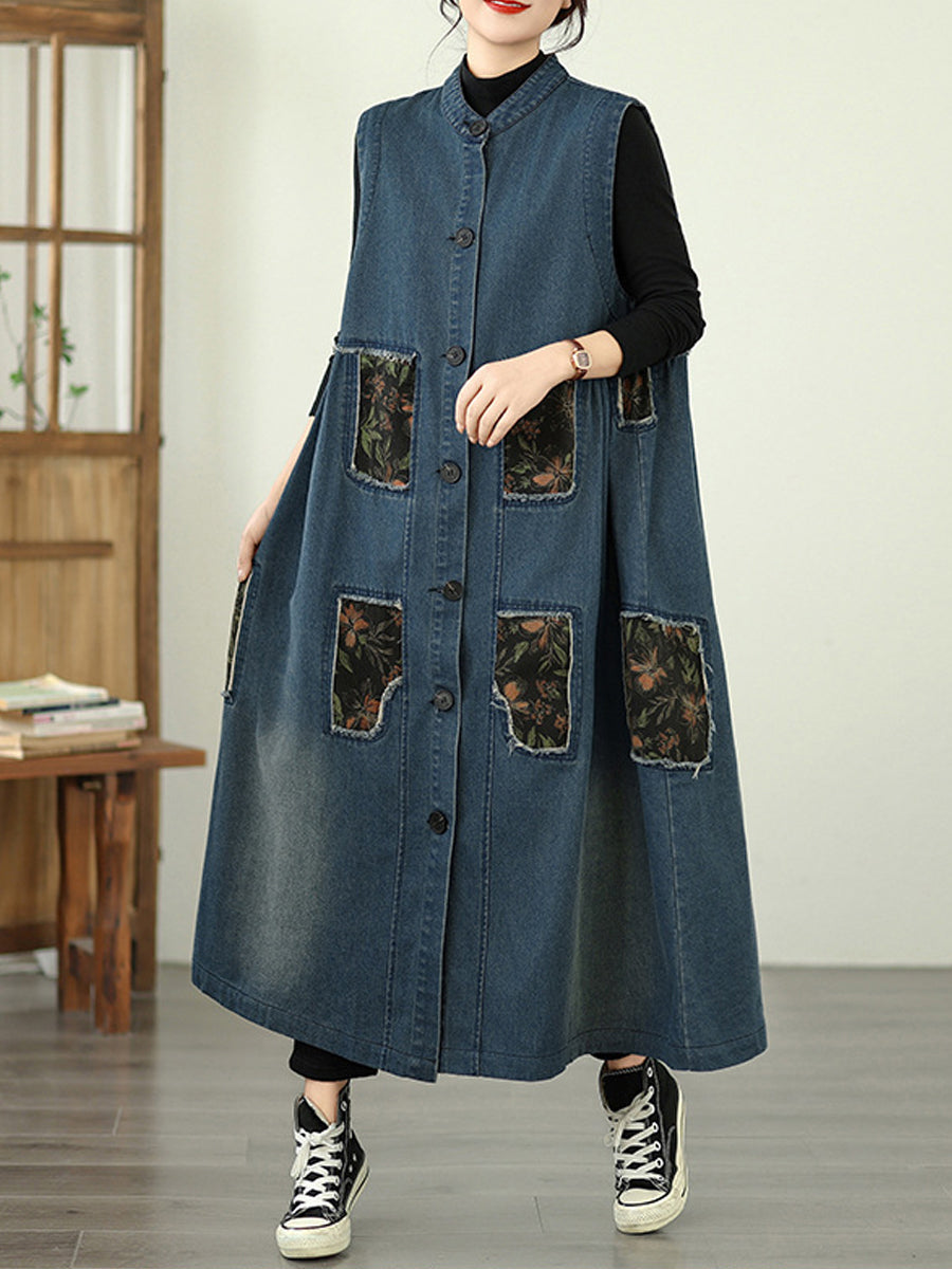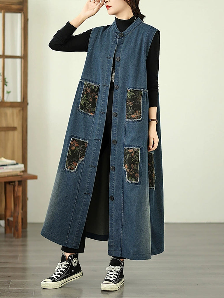 Women Vintage Denim Patchwork Stand Collar Long Vest Coat