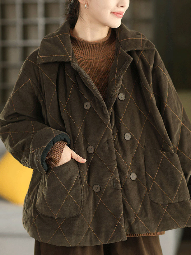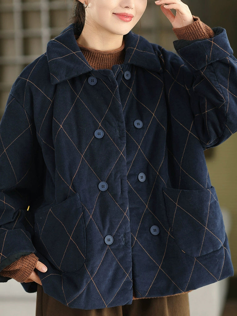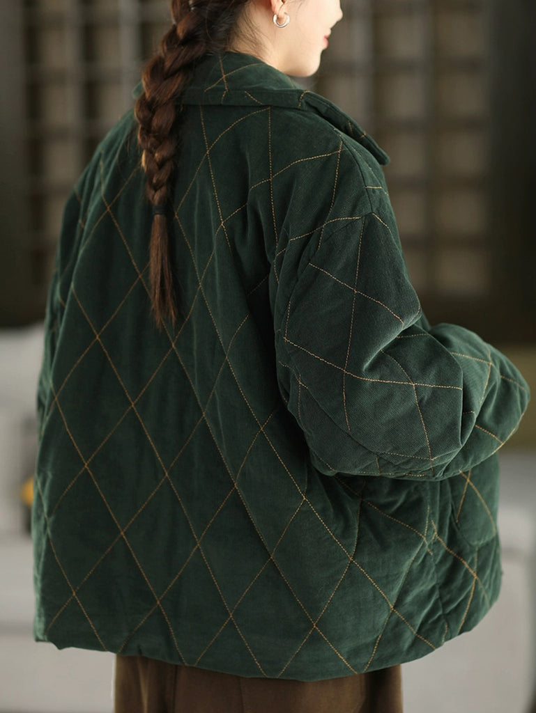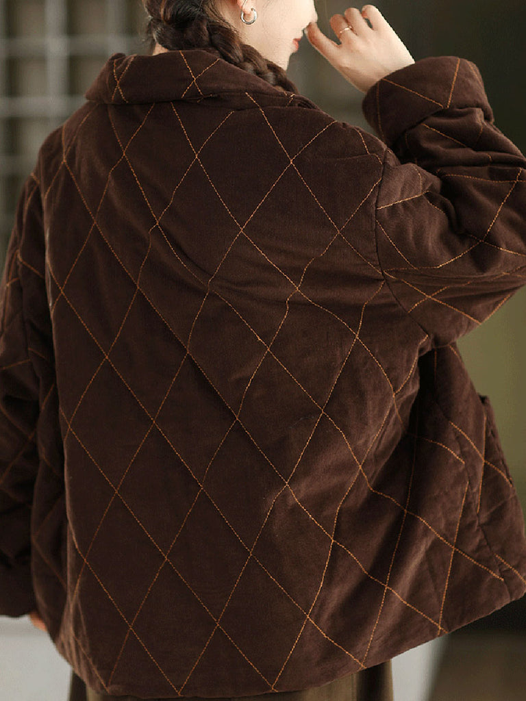 Women Vintage Rhomboids Turn-down Collar Padded Jacket
