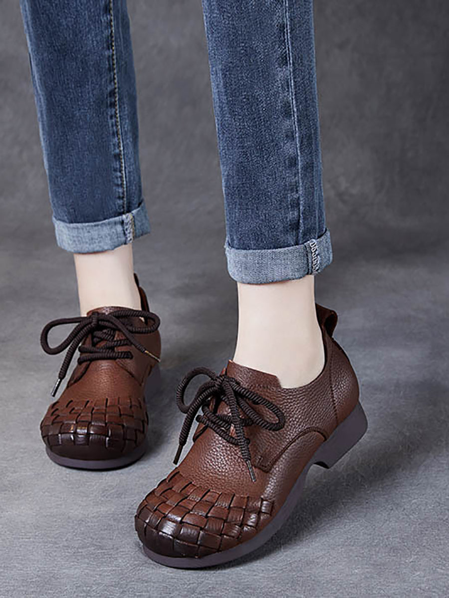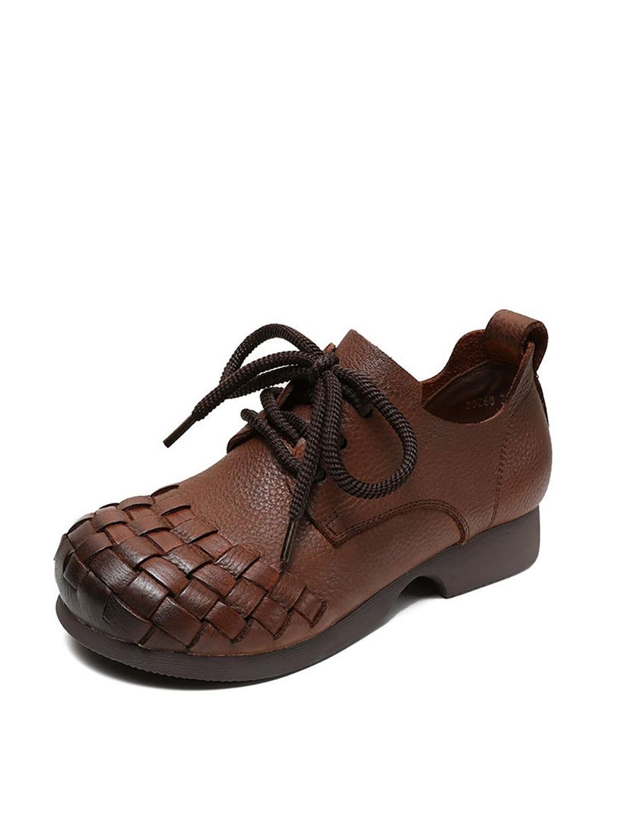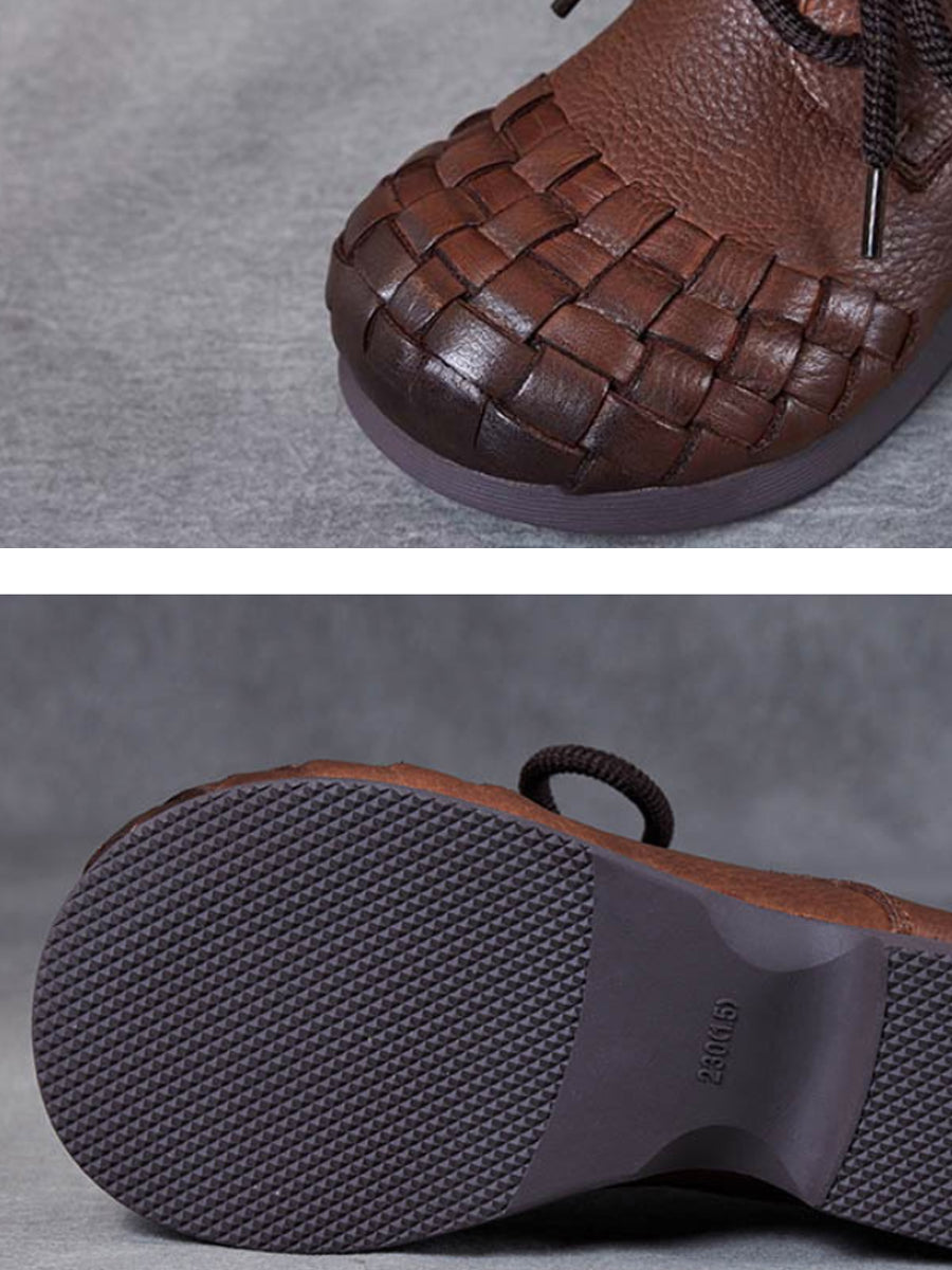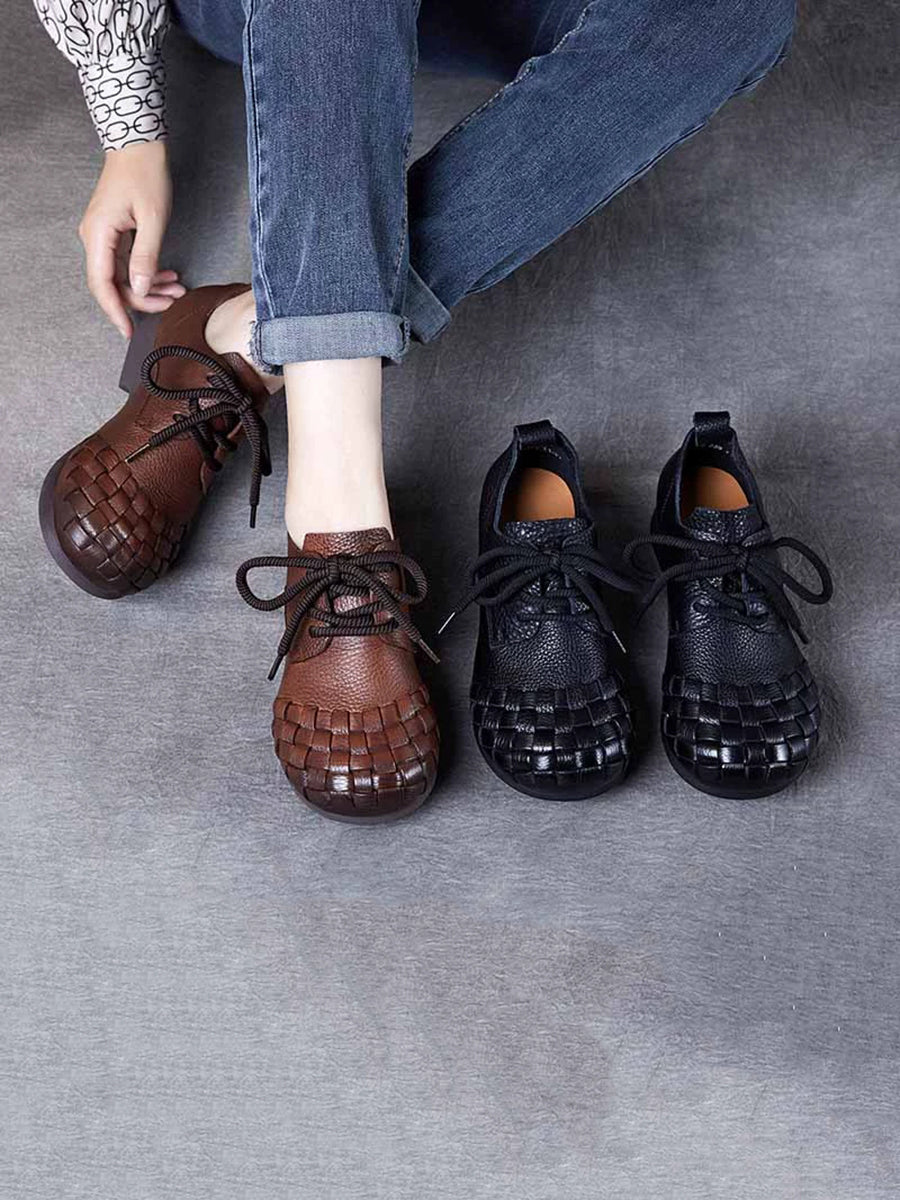 Women Vintage Soft Leather Weave Low Heel Shoes