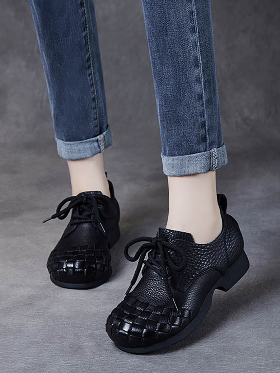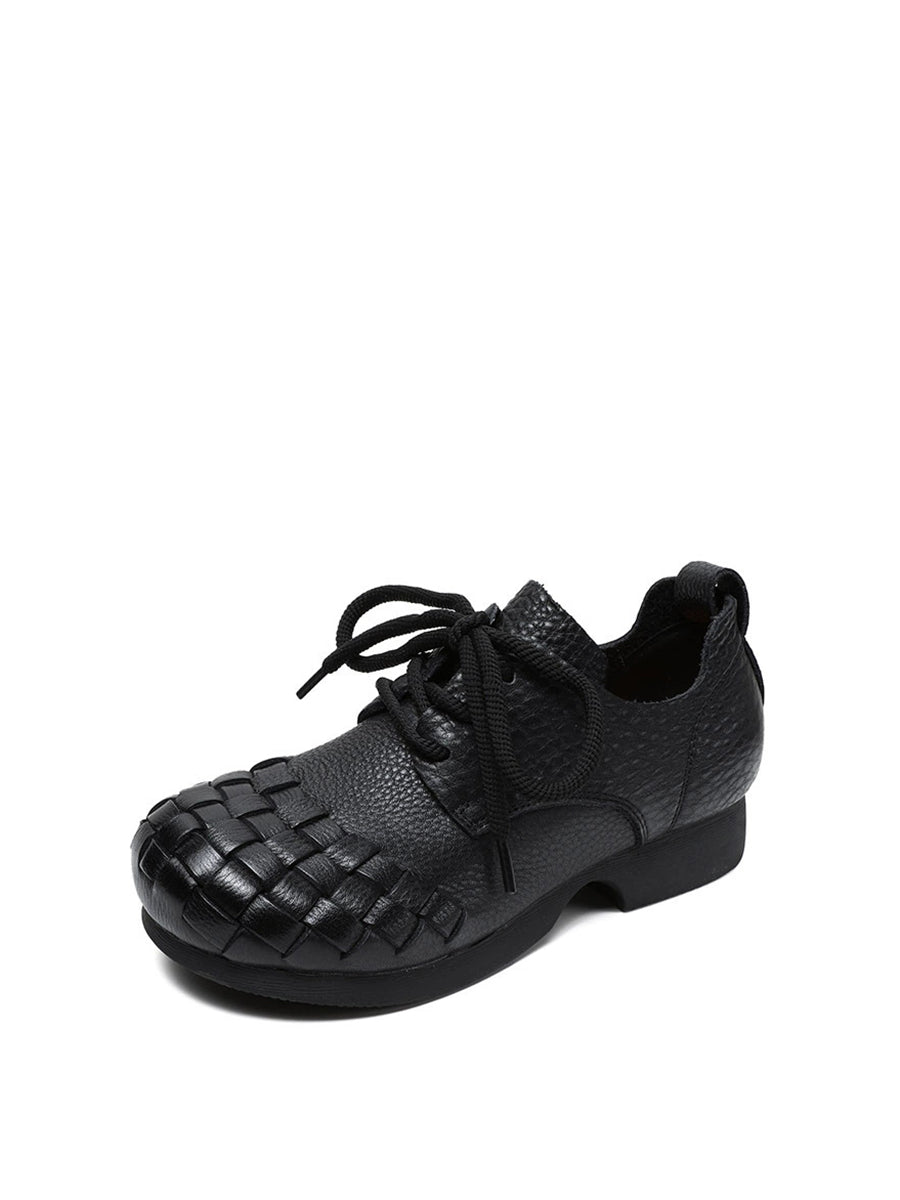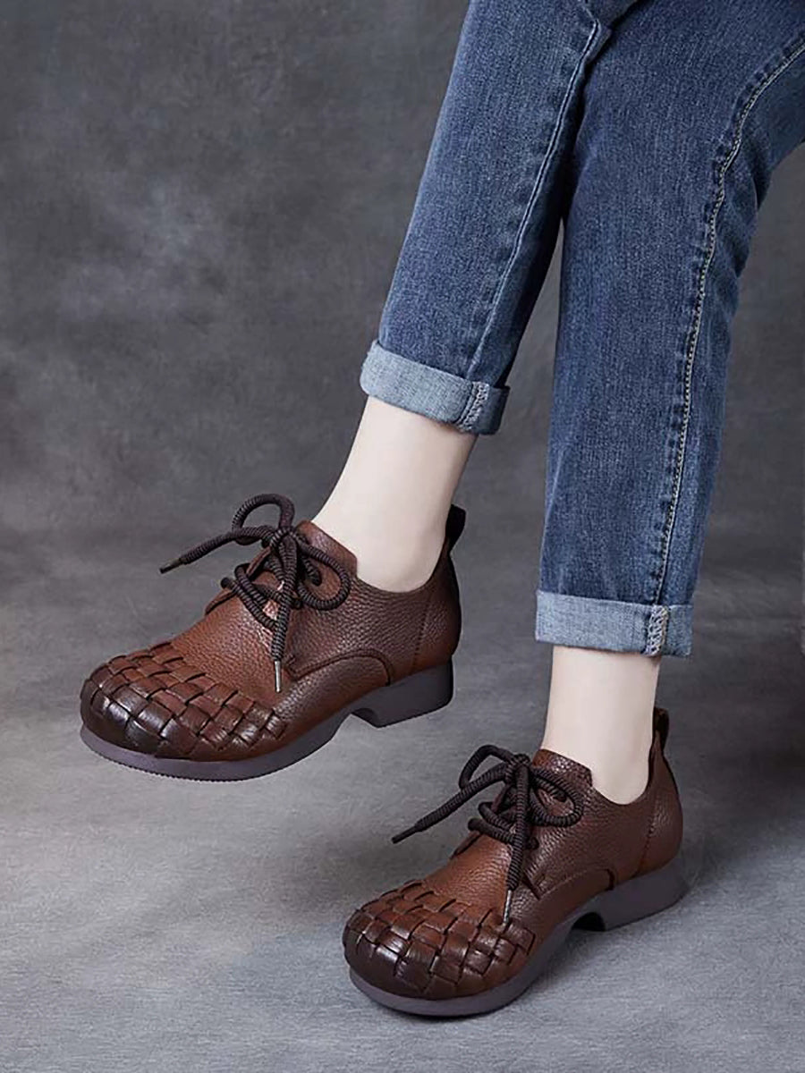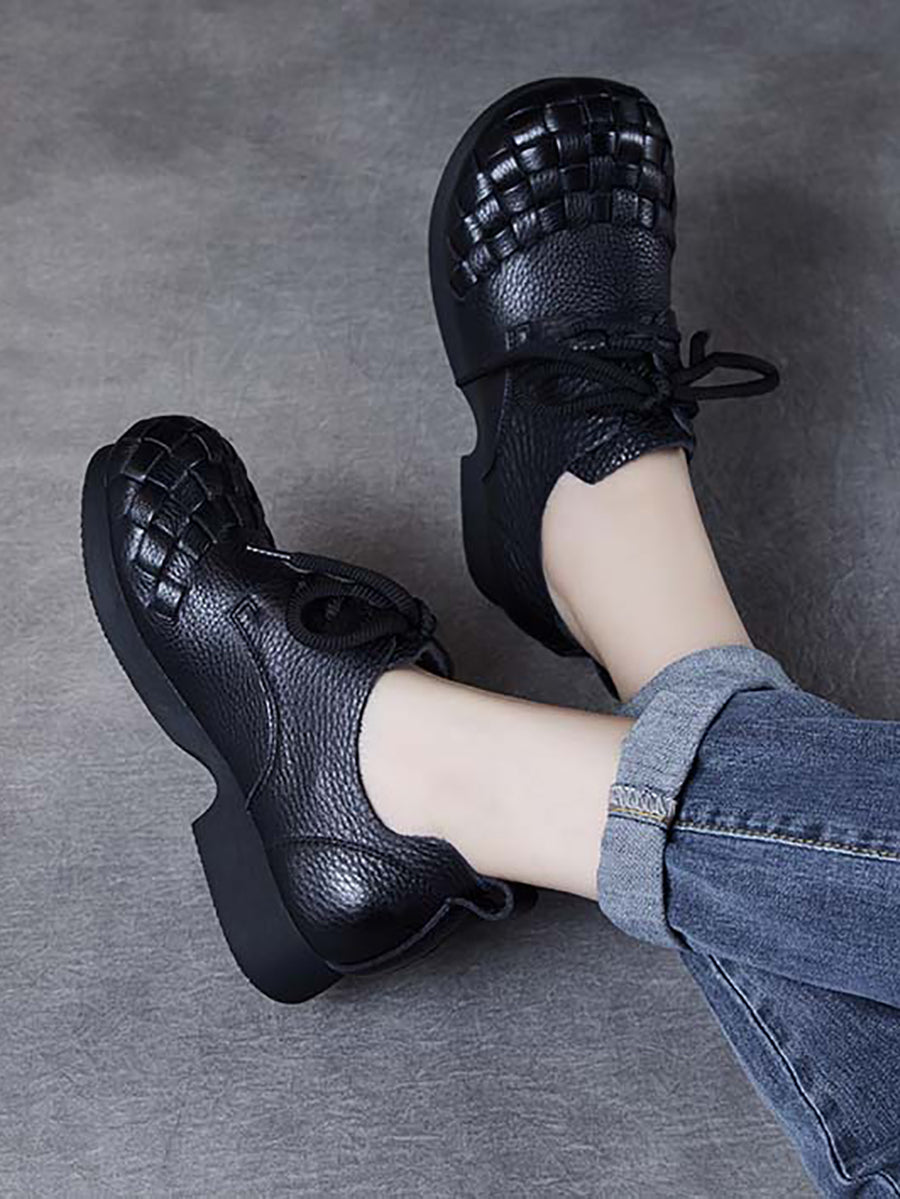 Women Vintage Soft Leather Weave Low Heel Shoes