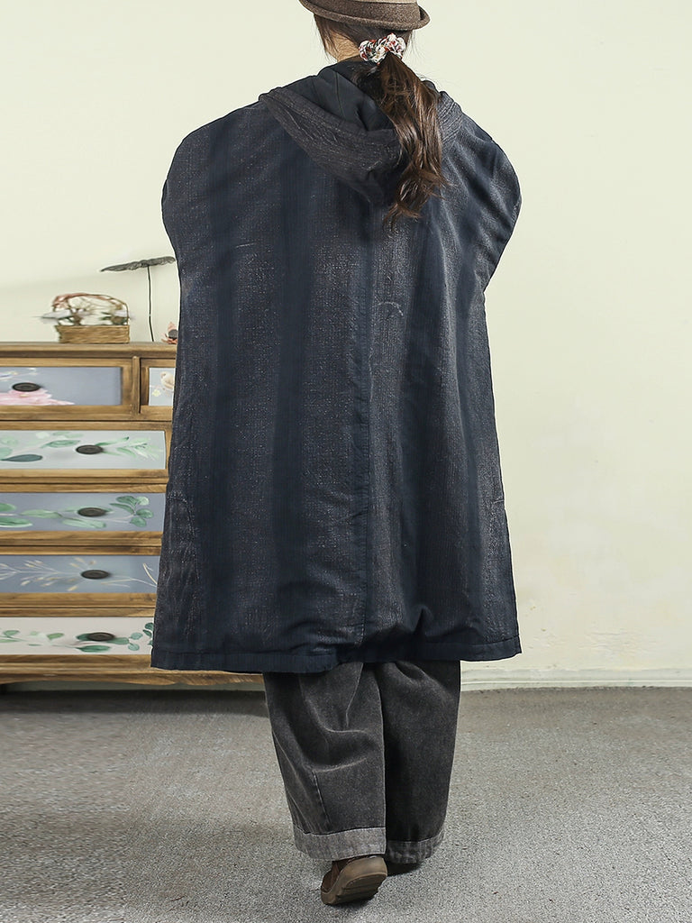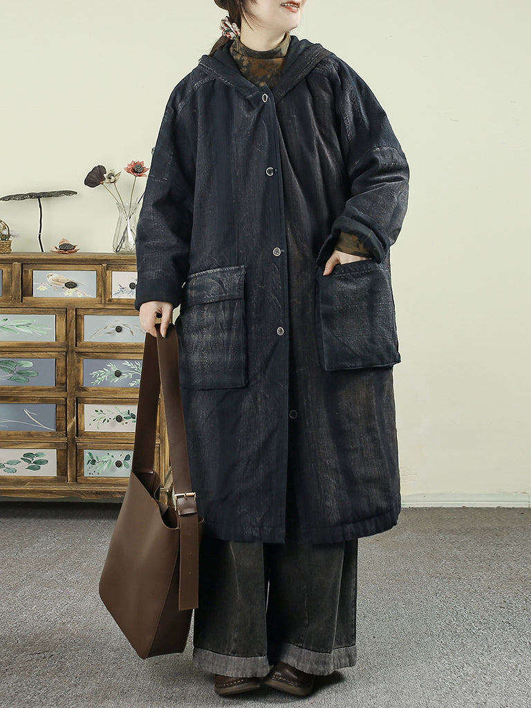 This coat features a pure color denim material with a hooded collar and full raglan sleeves, combining vintage style with practical padding. Designed for autumn and winter wear, it offers both warmth and timeless appeal.