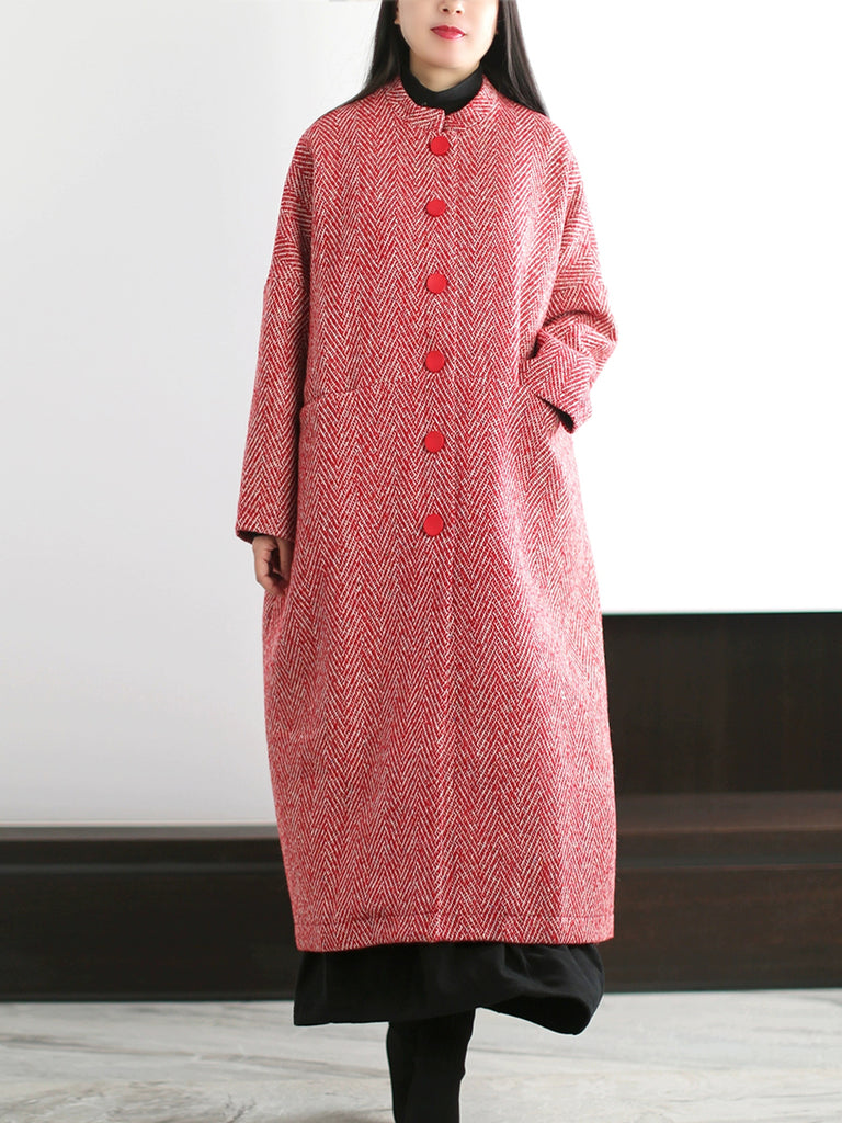 Crafted from a premium wool-blend fabric (85% wool, 15% polyester), this vintage-inspired overcoat features a distinctive striped pattern and structured stand collar. The raglan sleeves provide elegant proportions while the cocoon silhouette offers a flattering, relaxed fit. Designed for autumn and winter wear, this retro piece combines timeless style with practical warmth and comfort.