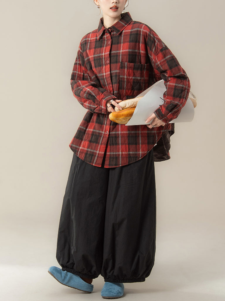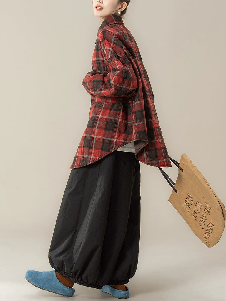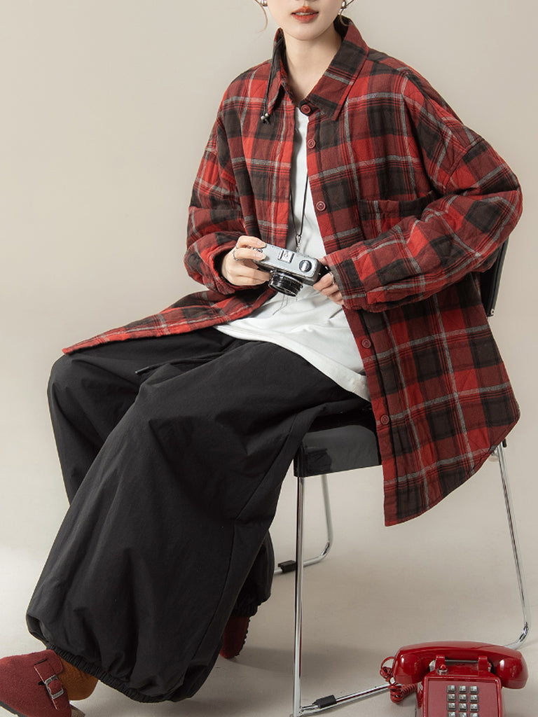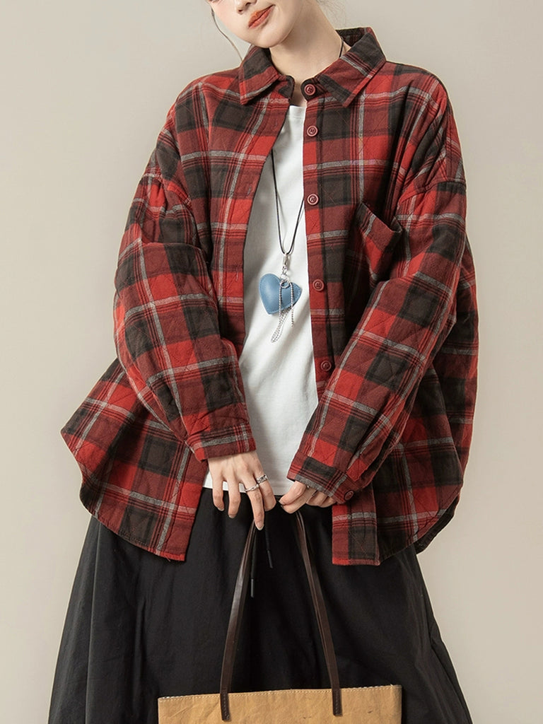 This vintage-inspired women's winter shirt coat features a classic plaid pattern and a turn-down collar. Designed with full raglan sleeves, it combines retro style with practical warmth, making it ideal for autumn and winter wear.