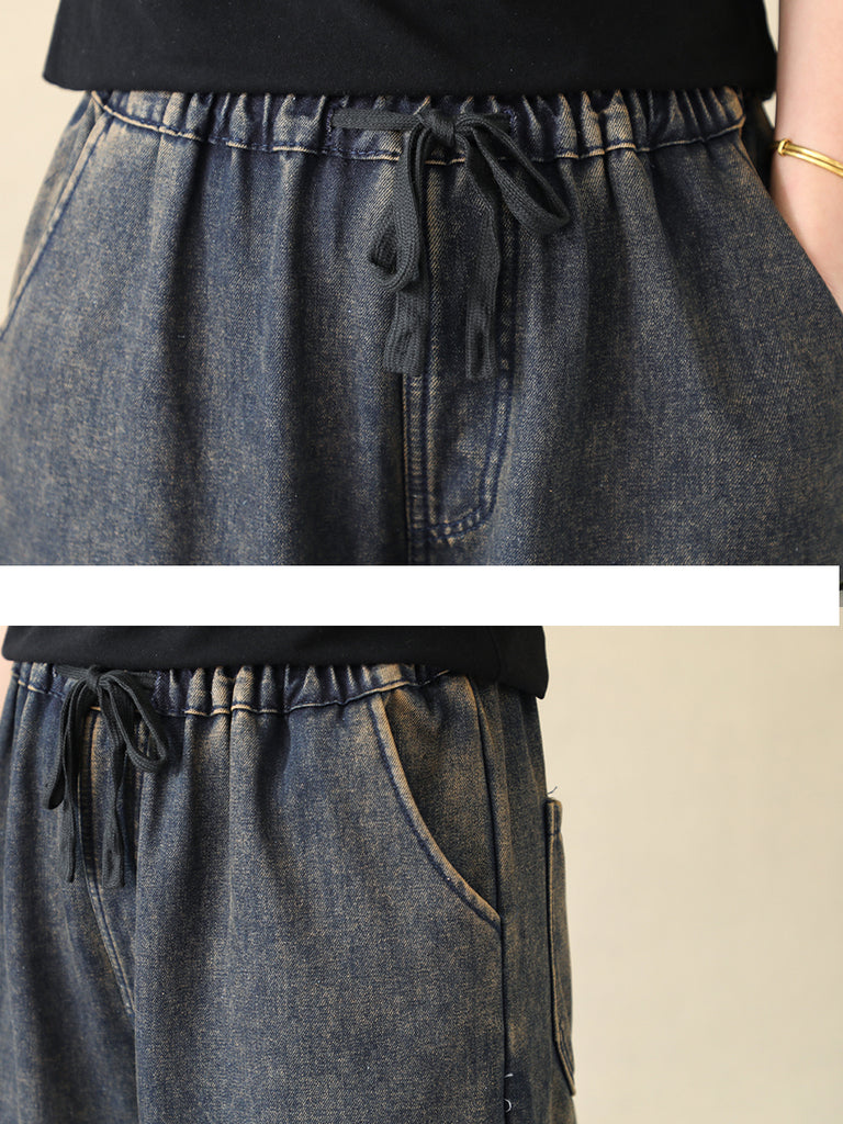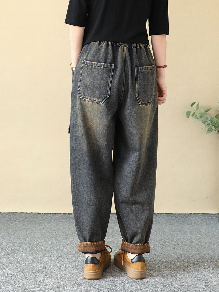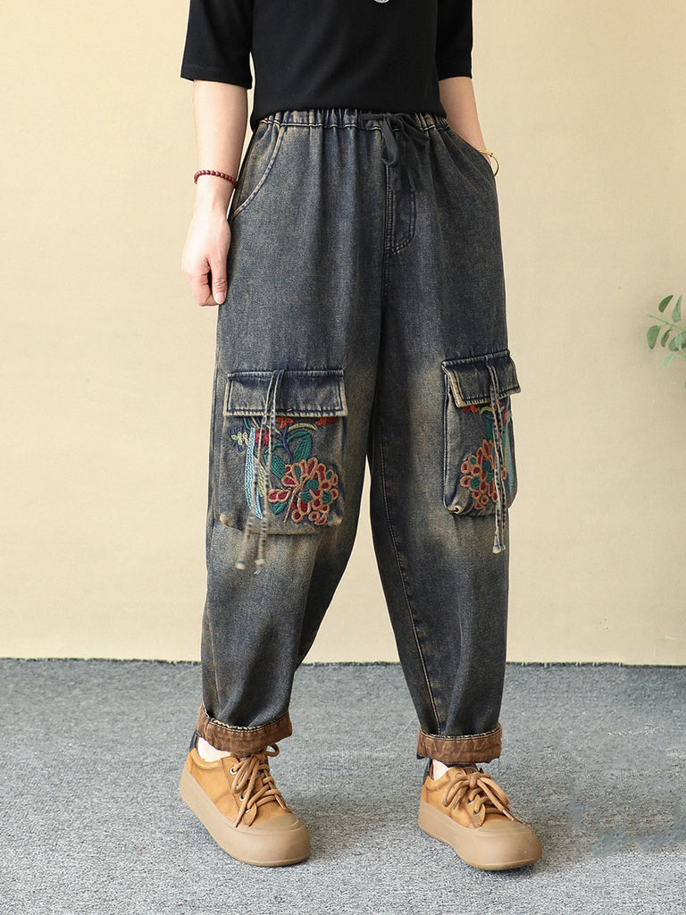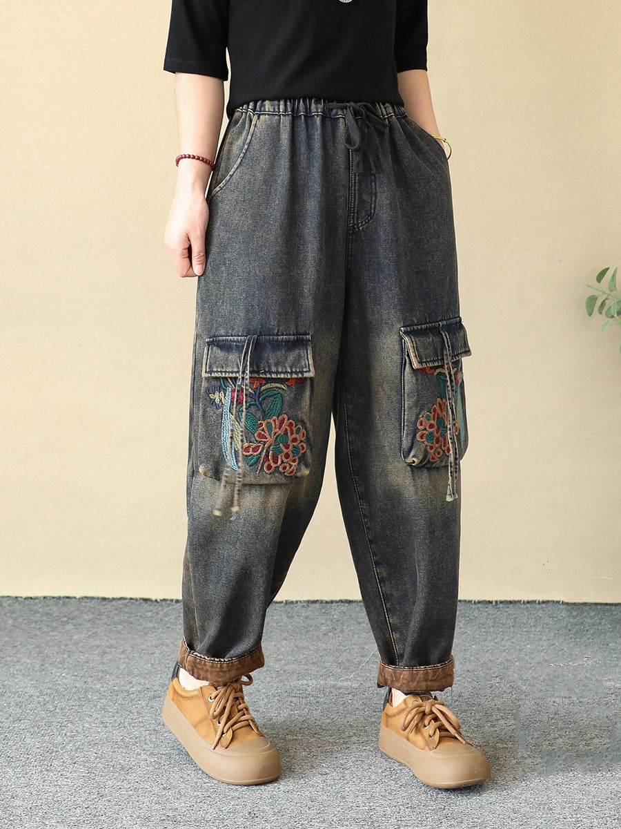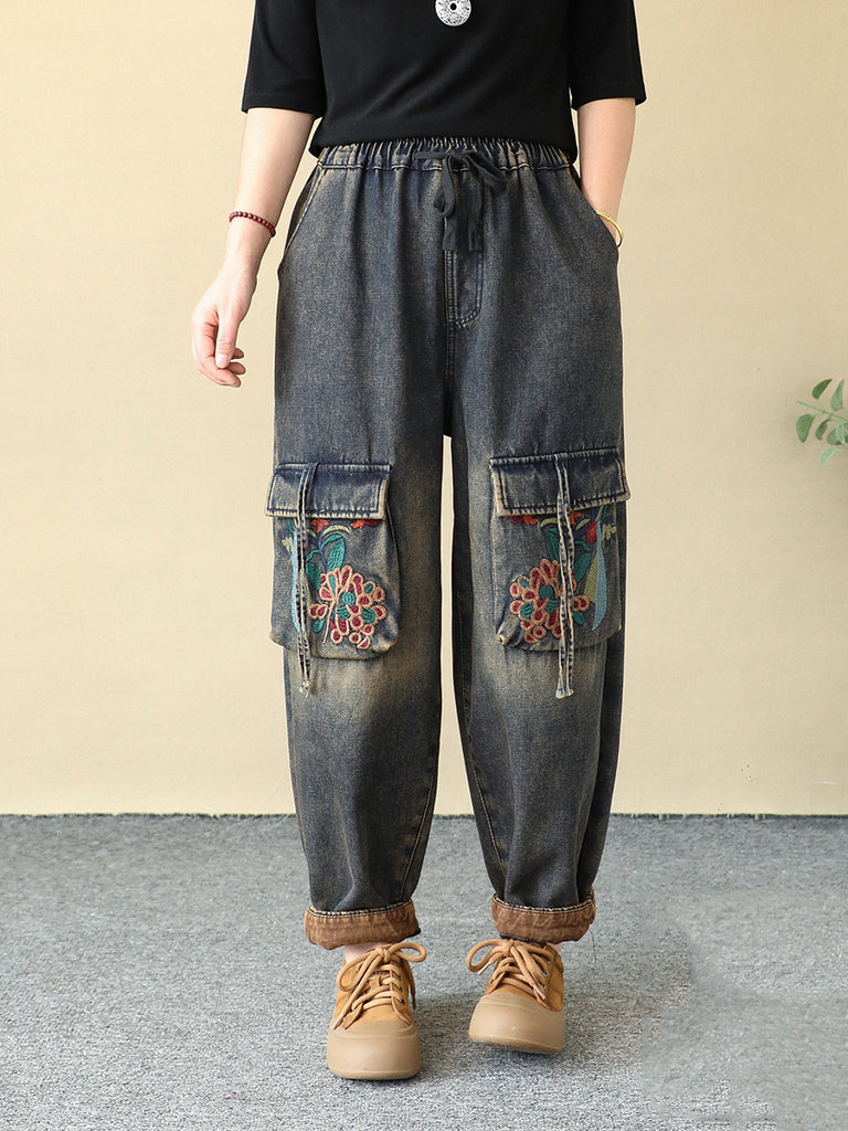 Women Winter Embroidery Pocket Fleece-lined Harem Pants