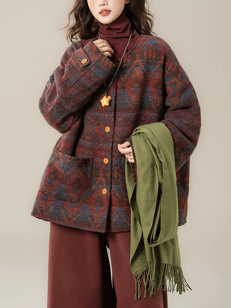Women Winter Ethnic Print O-Neck Padded Coat