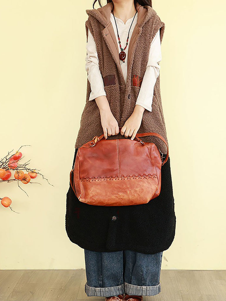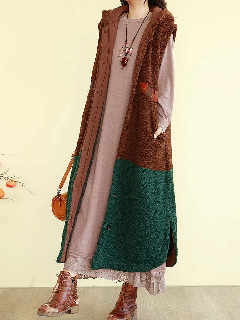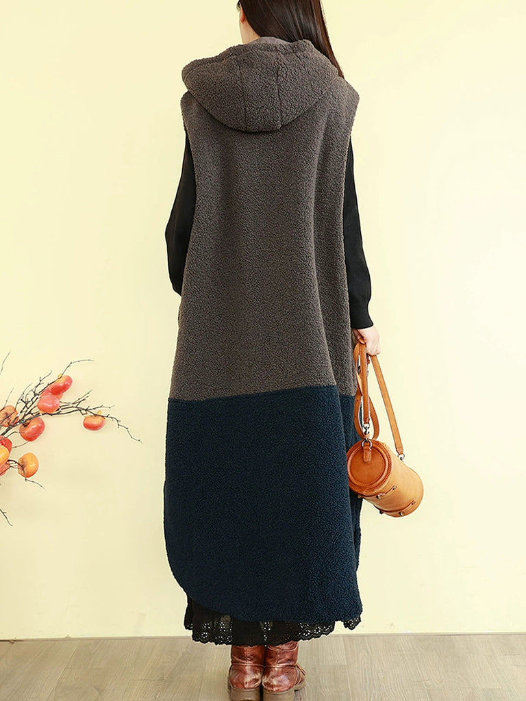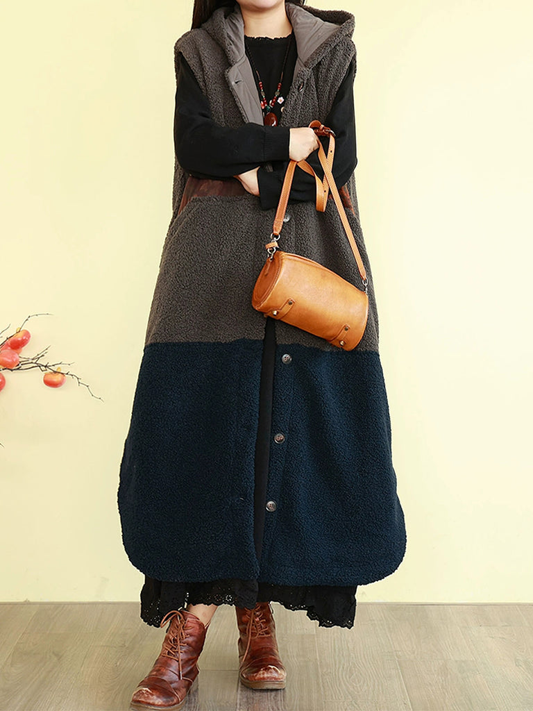 Women Winter Fleece Colorblock Hooded Padded Vest Coat