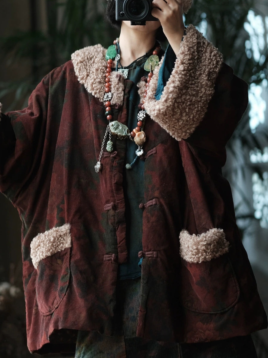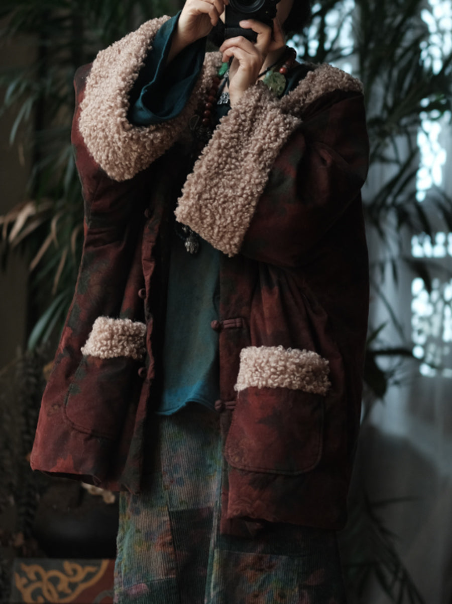 Women Winter Flower Fleece Spliced Cotton O-Neck Coat