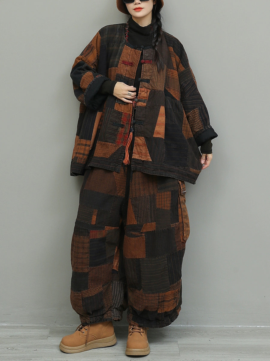 Women Winter Retro Patchwork O-Neck Padded Suits