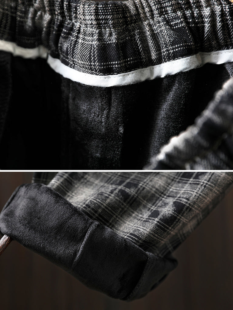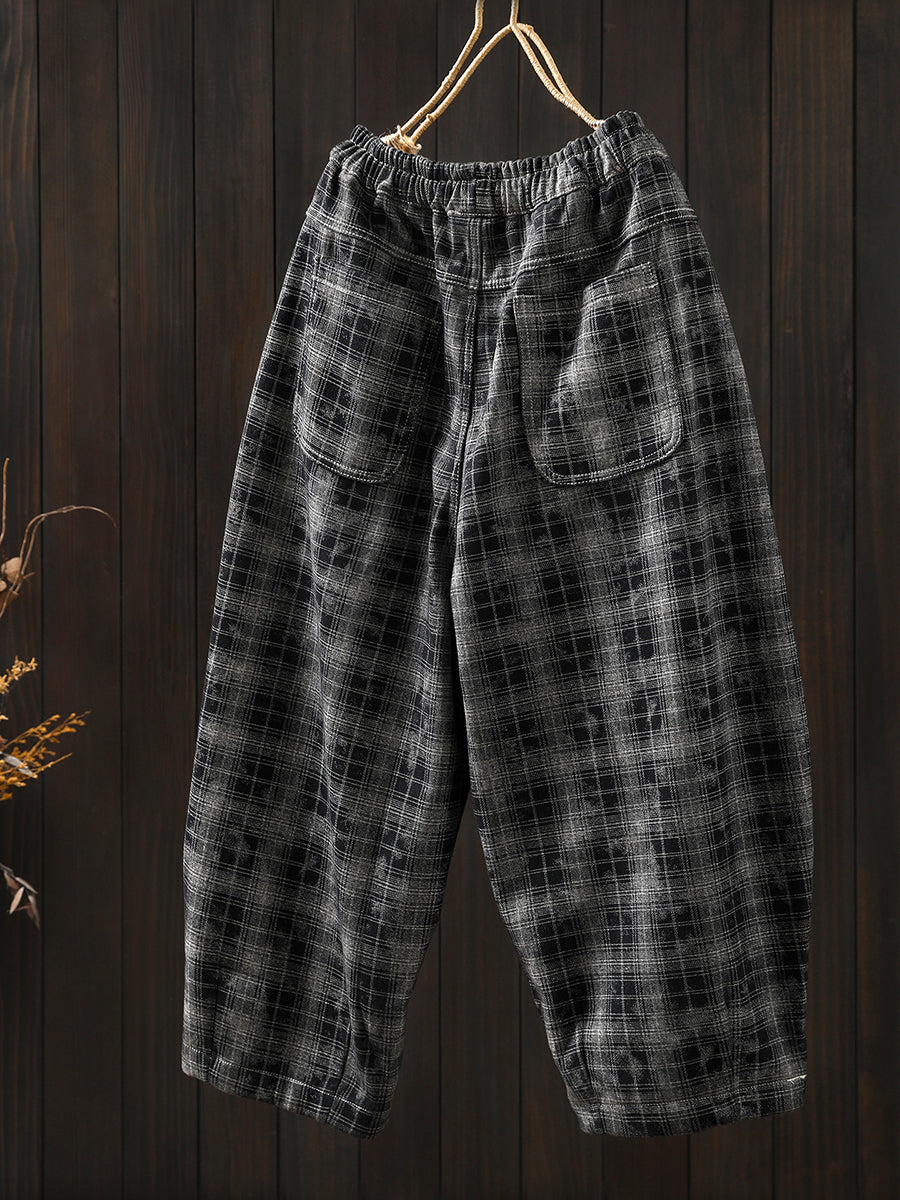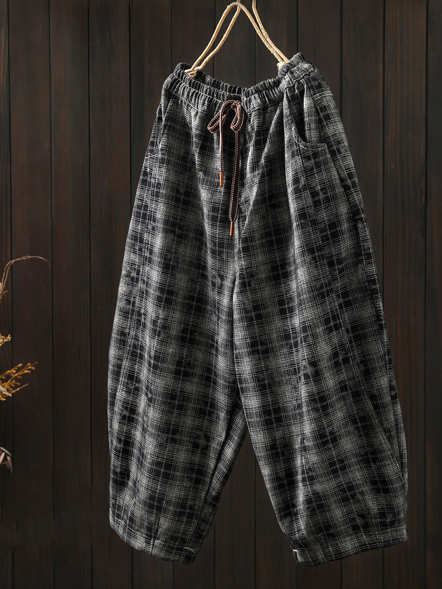 Women Winter Retro Plaid Fleece-lined Harem Pants