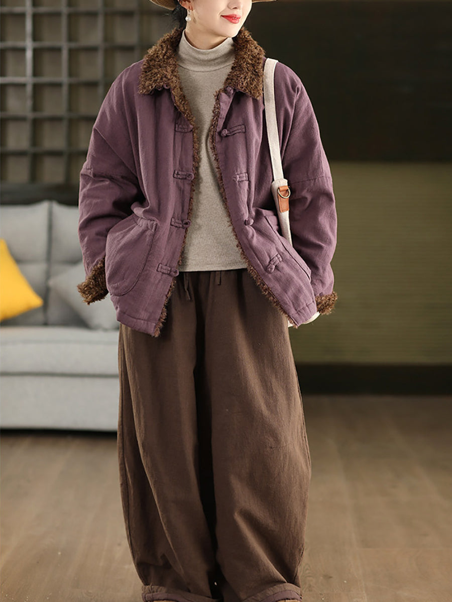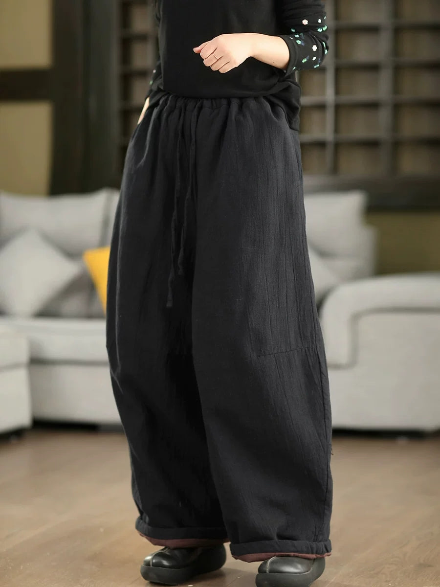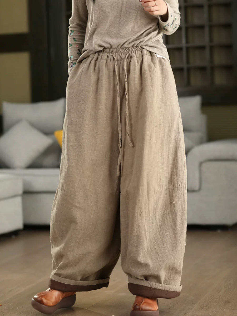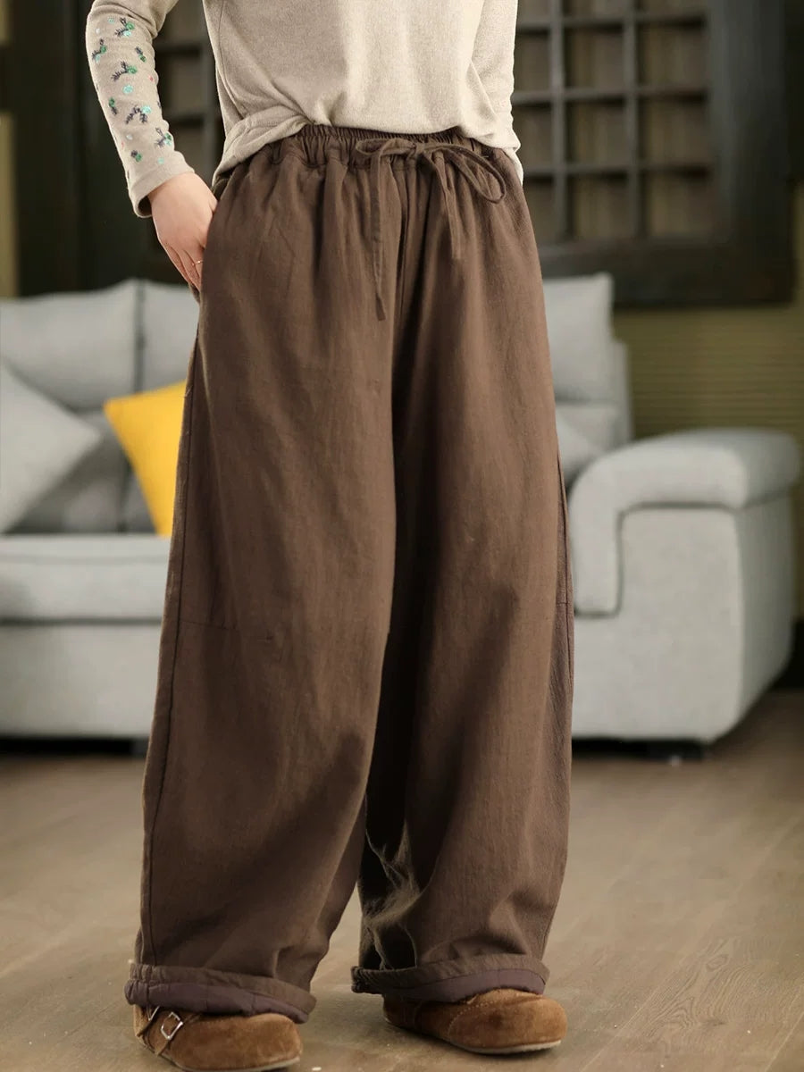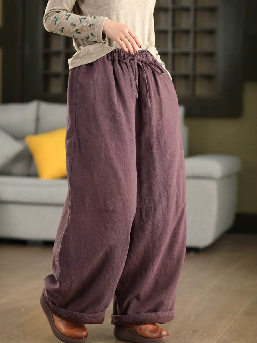 Women Winter Retro Pure Color 100%Linen Padded Straight Pants