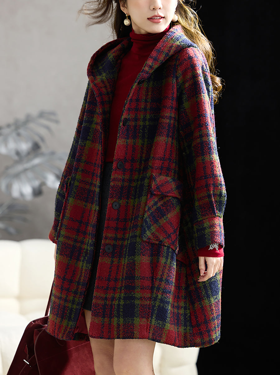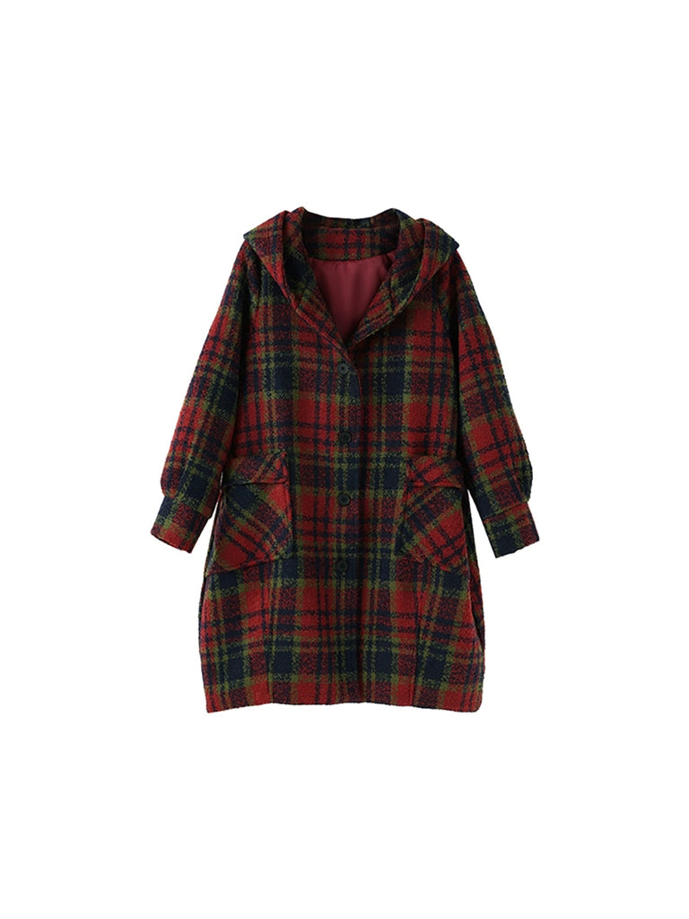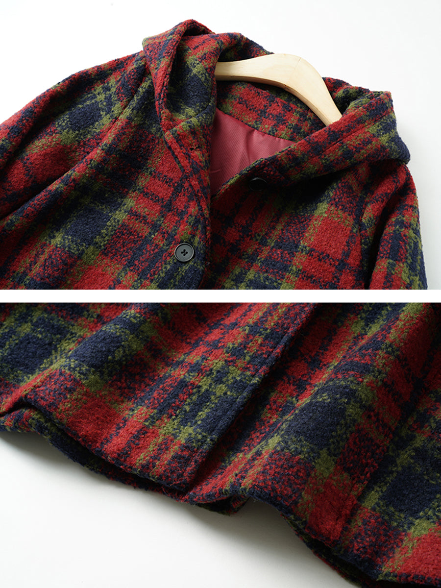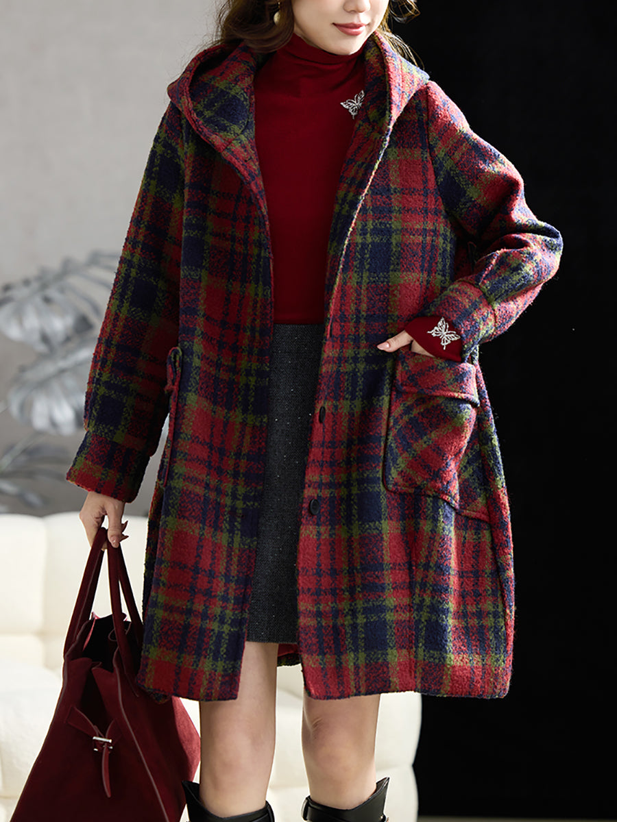 Women Winter Vintage Plaid Hooded Woolen Coat
