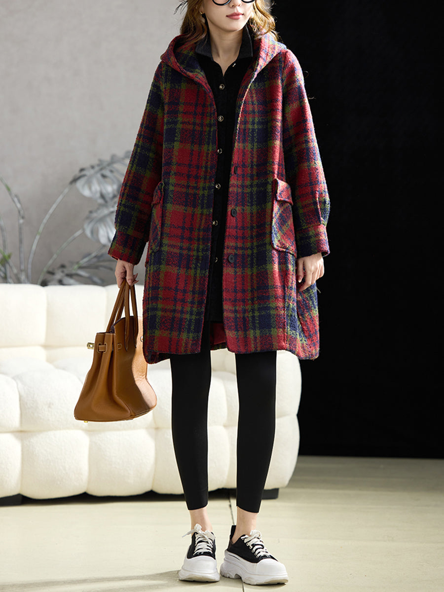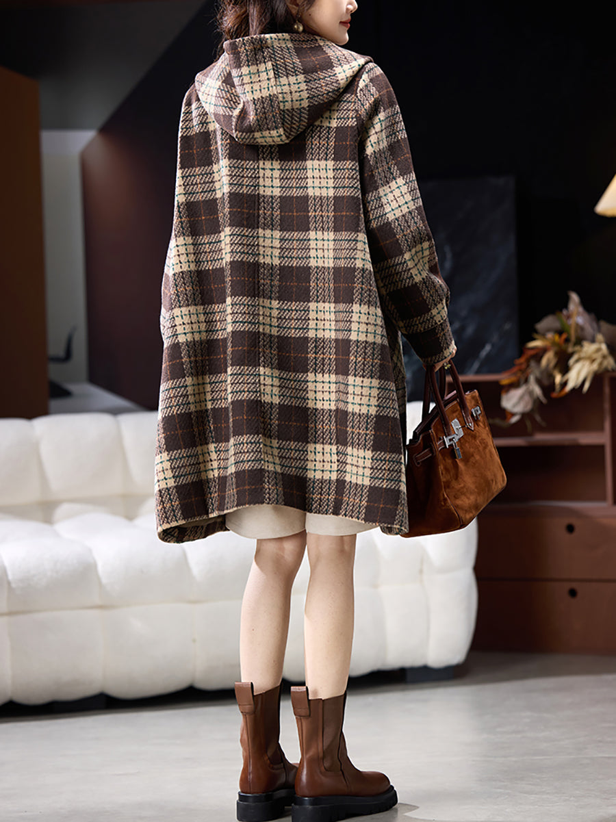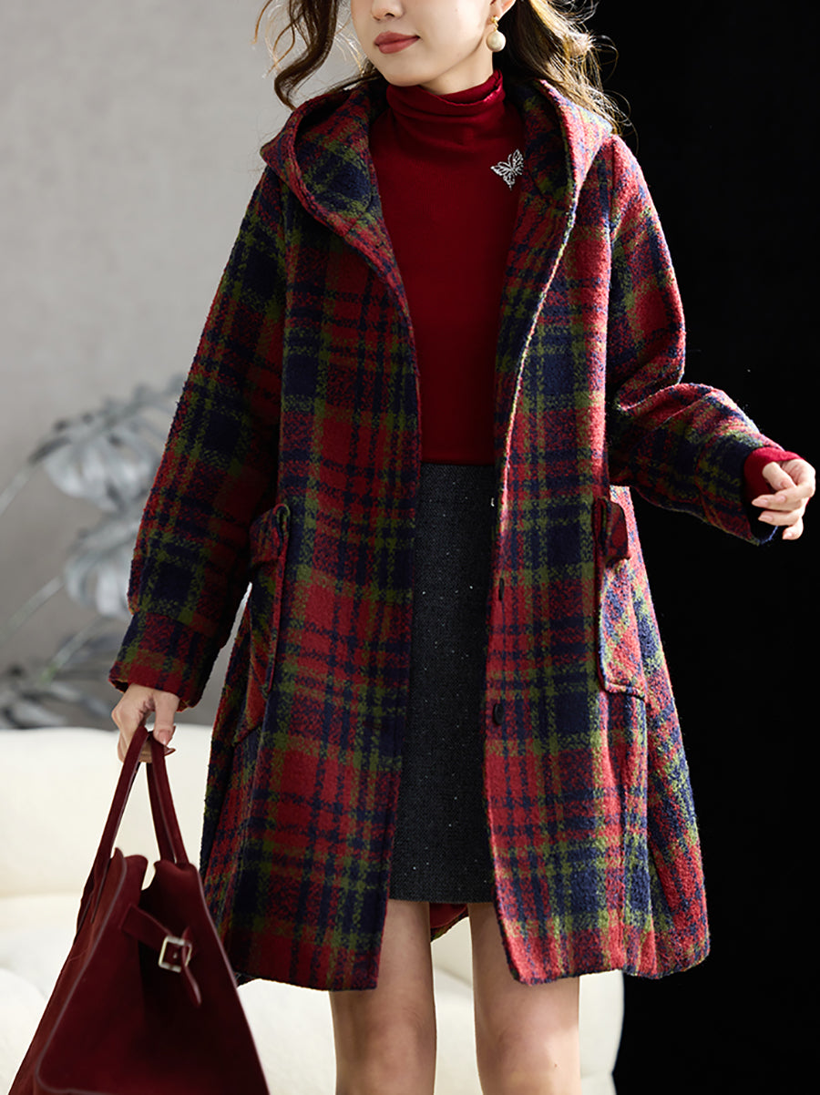Women Winter Vintage Plaid Hooded Woolen Coat
