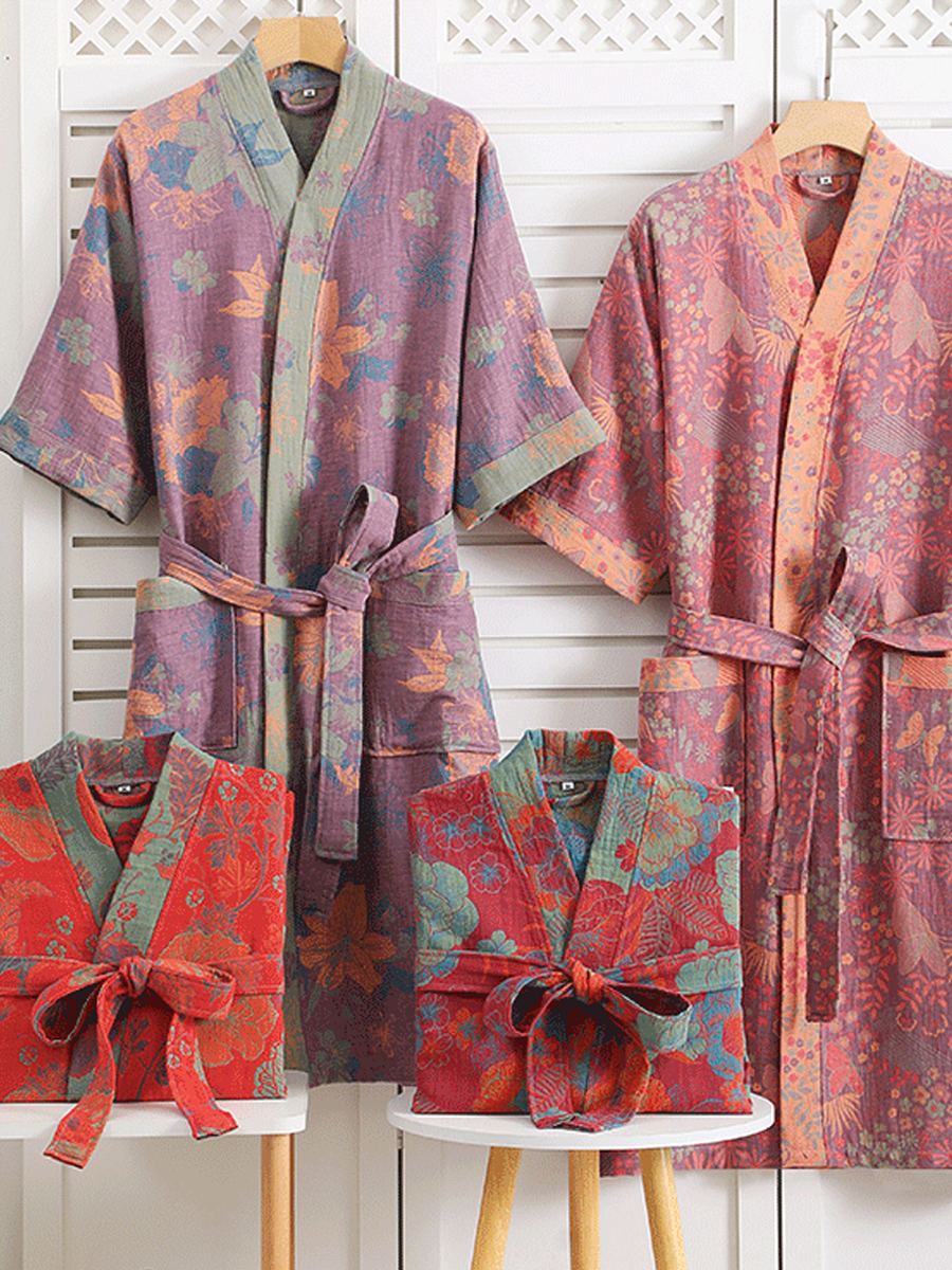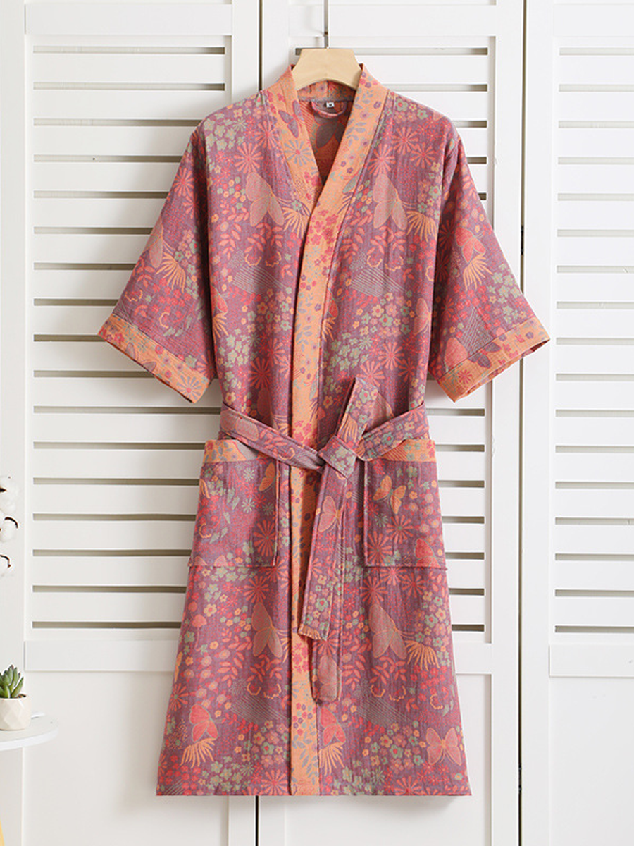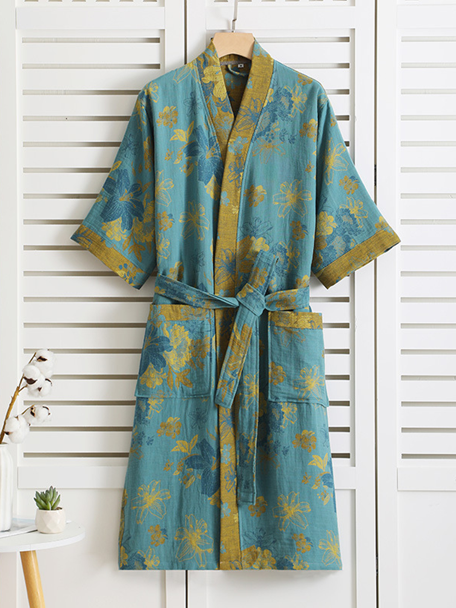 Ljetni kućni ogrtač od pamučne gaze s cvjetnim žakard uzorkom