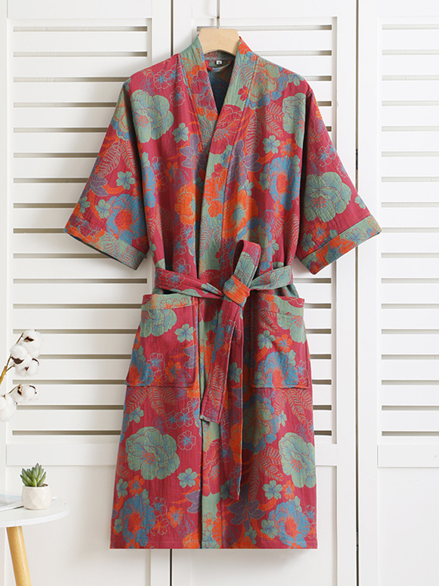 Izrađen od 100% čistog pamučnog dvoslojnog gaznog materijala, ovaj lagani, prozračni ogrtač ima široki kroj i elegantan cvjetni uzorak. S podesivim remenom i dugom duljinom, nudi udobnost i stil za vaše opuštanje.