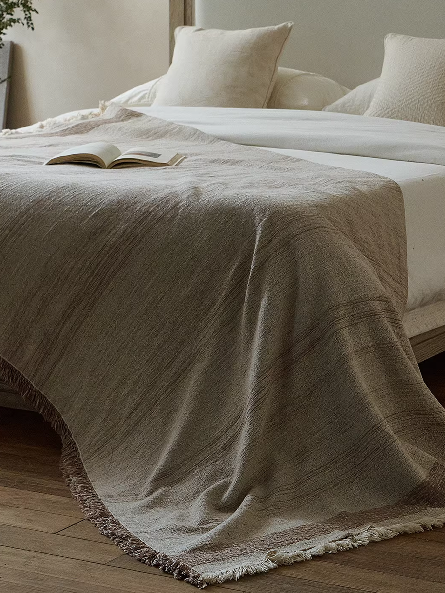 Retro tamnosmeđa pamučno-lanena deka za sofu u boji senfa