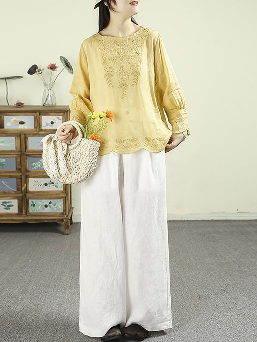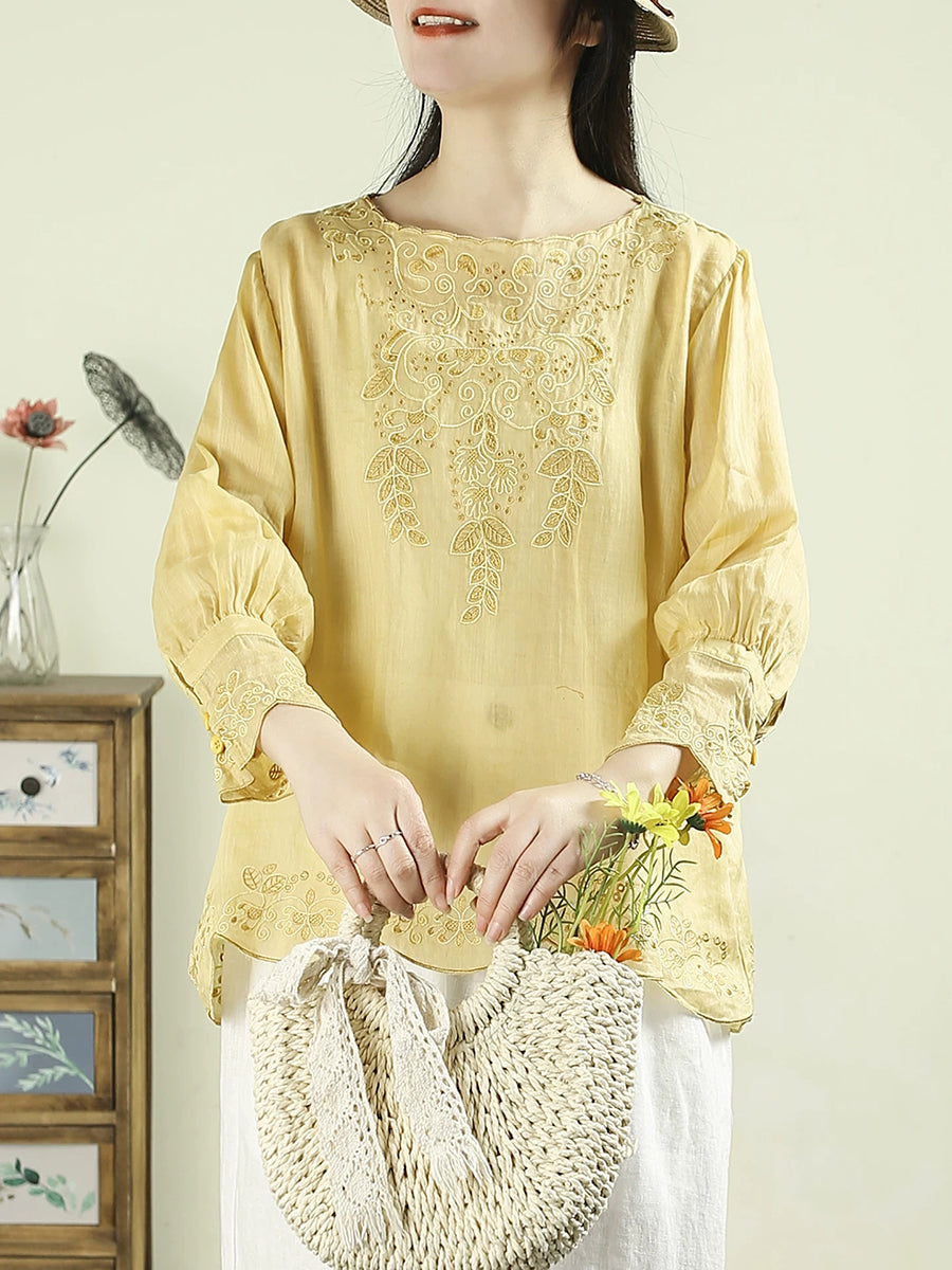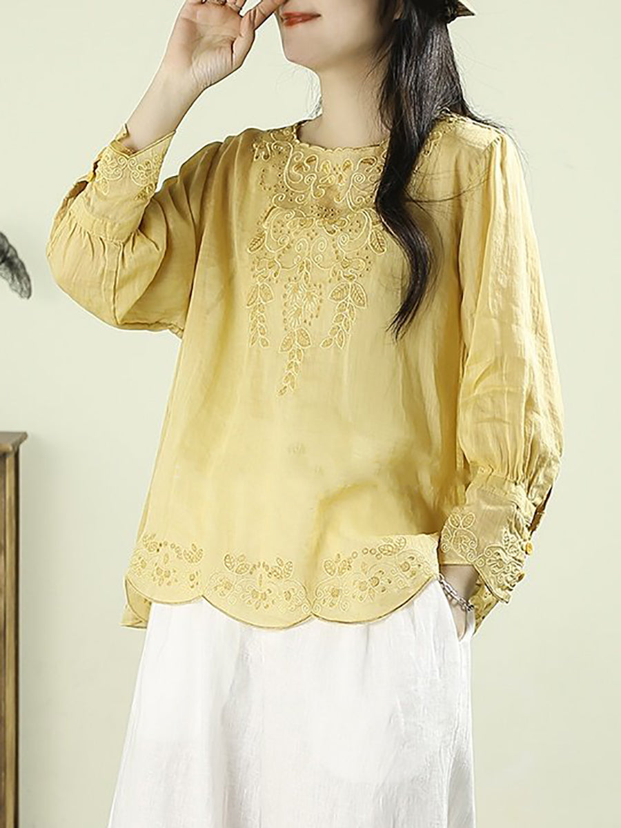 Ženska umjetnička proljetna bluza s O-izrezom i vezom od 100% ramije