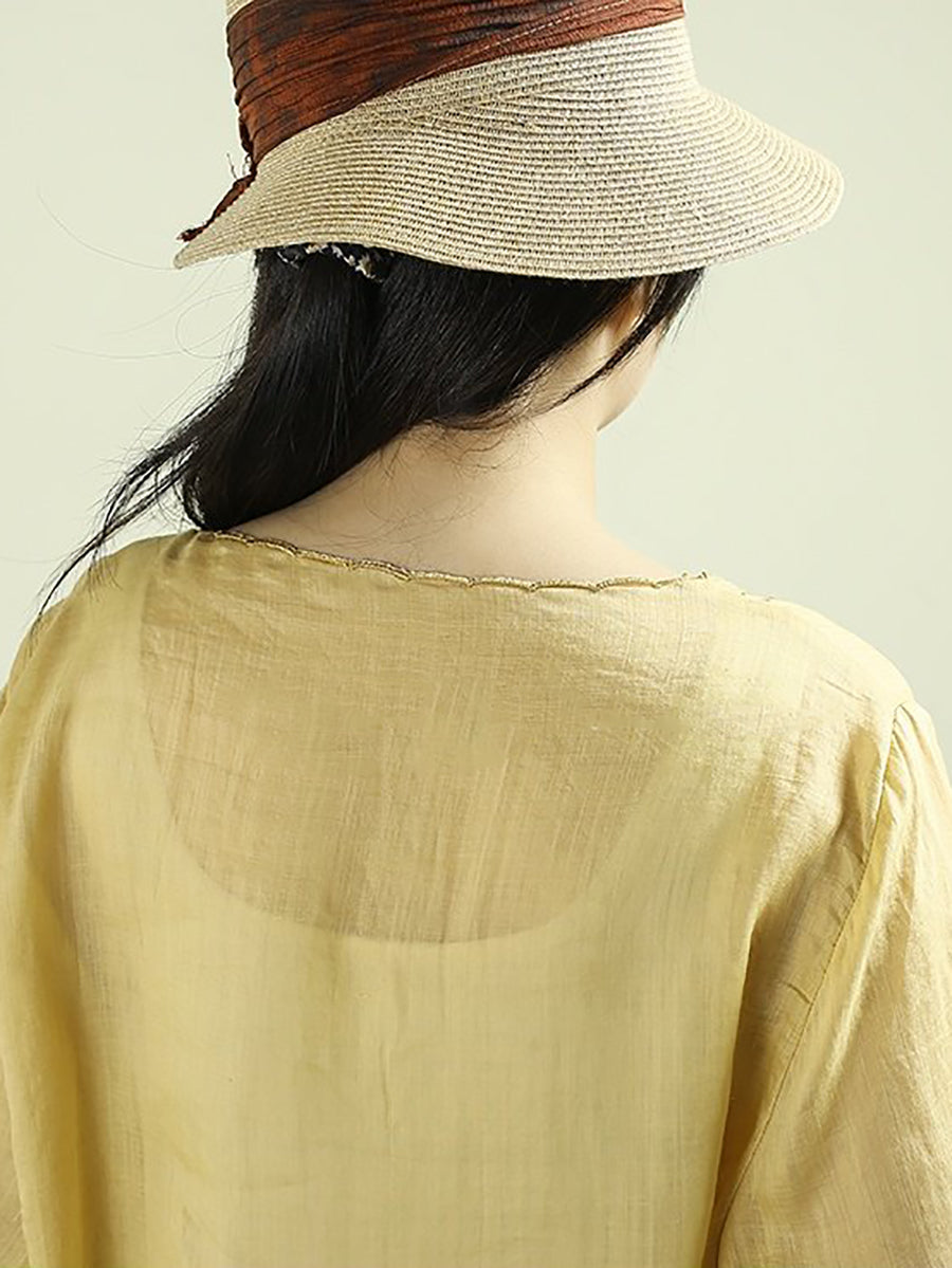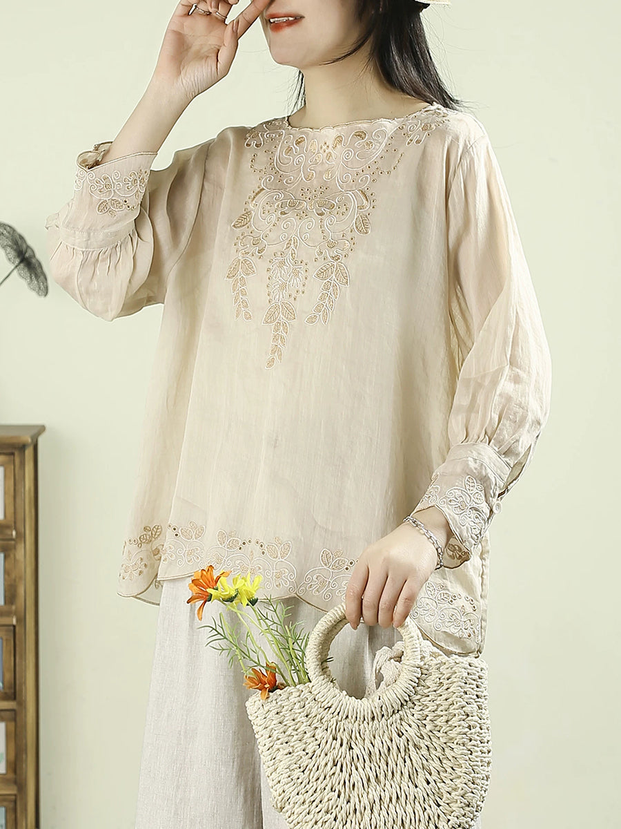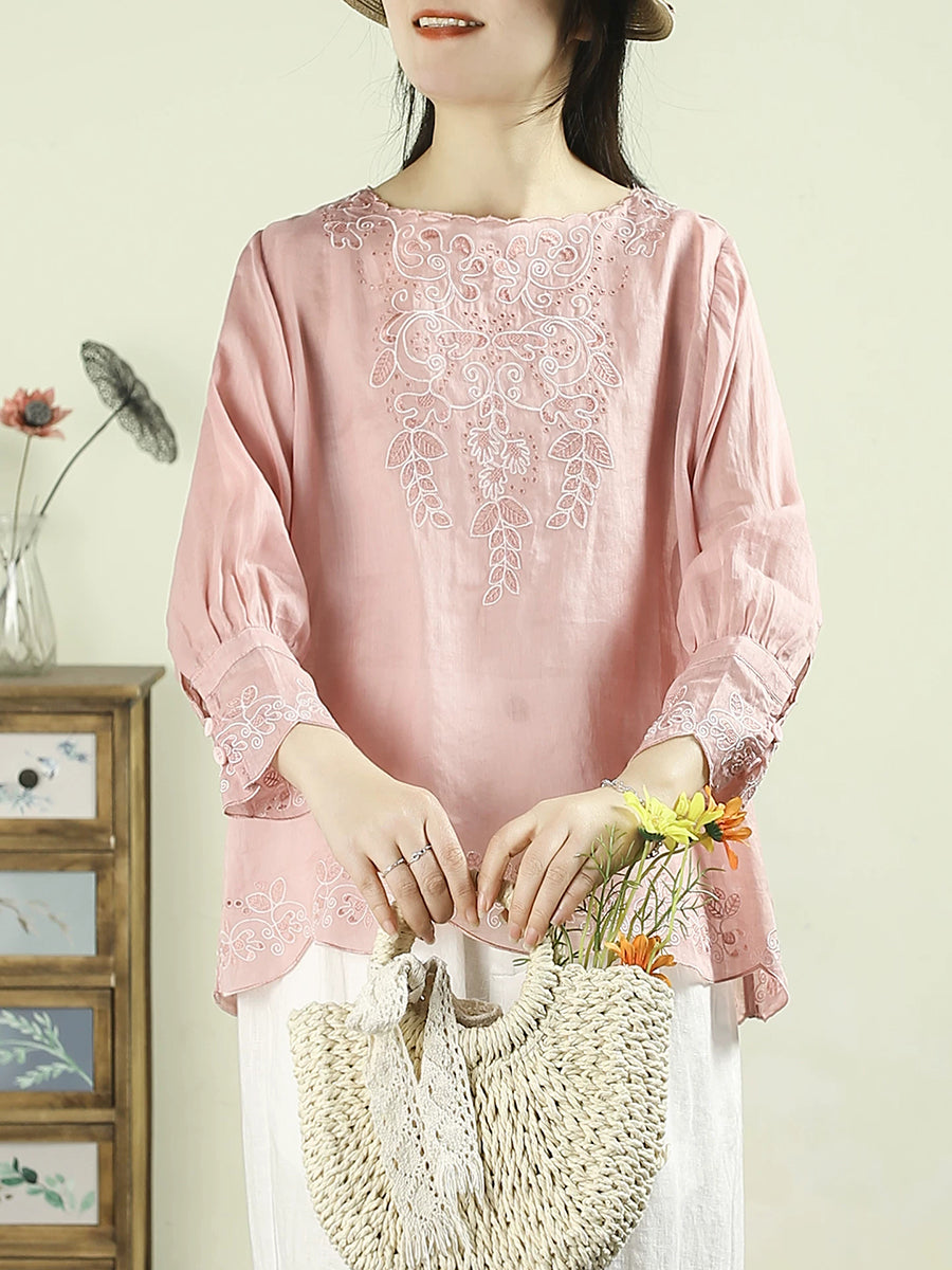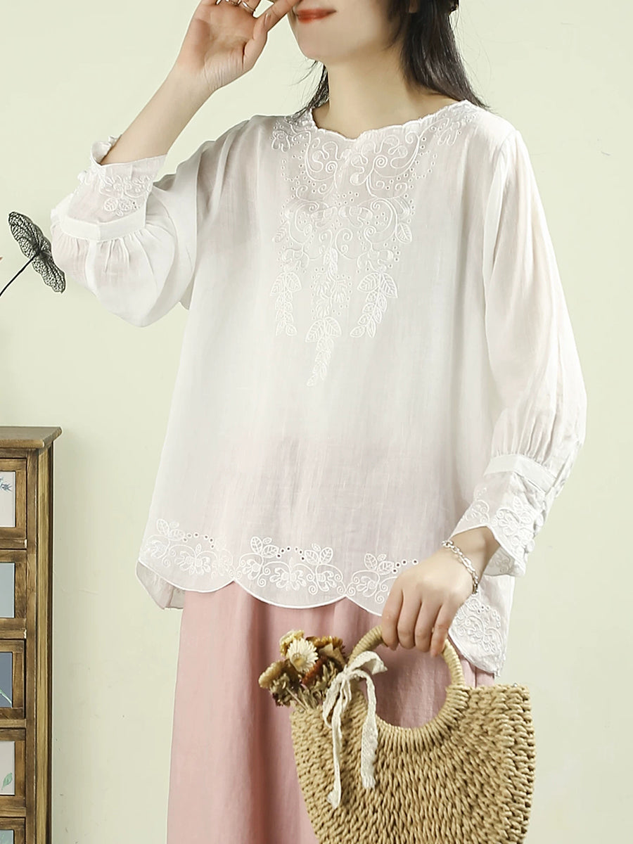 Ženska umjetnička proljetna bluza s O-izrezom i vezom od 100% ramije
