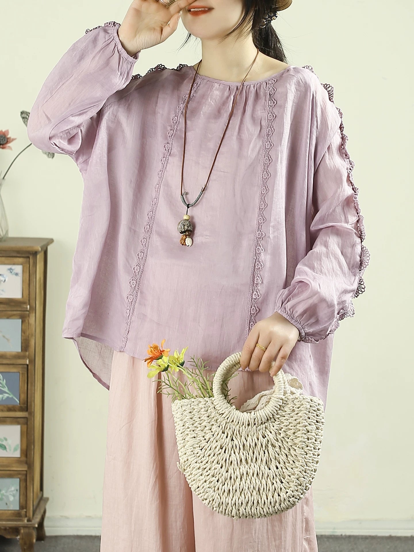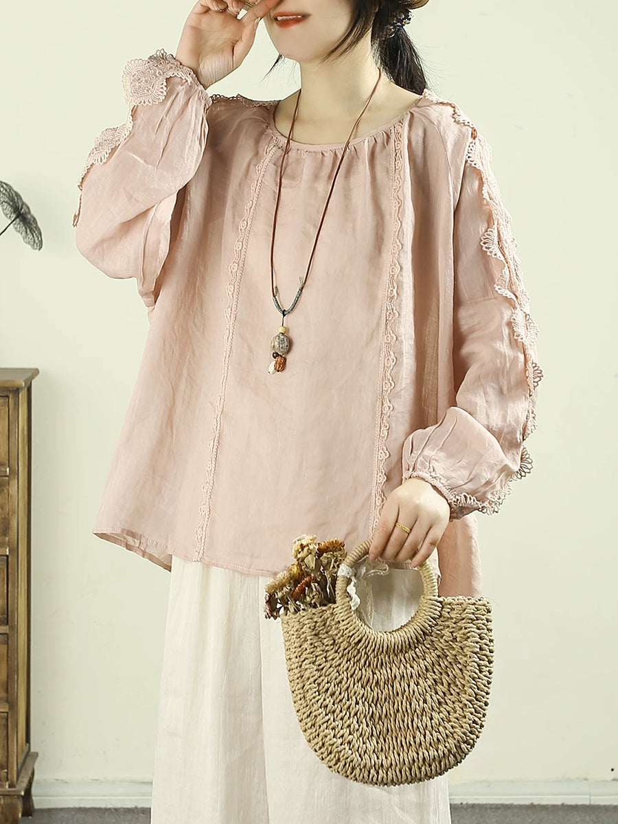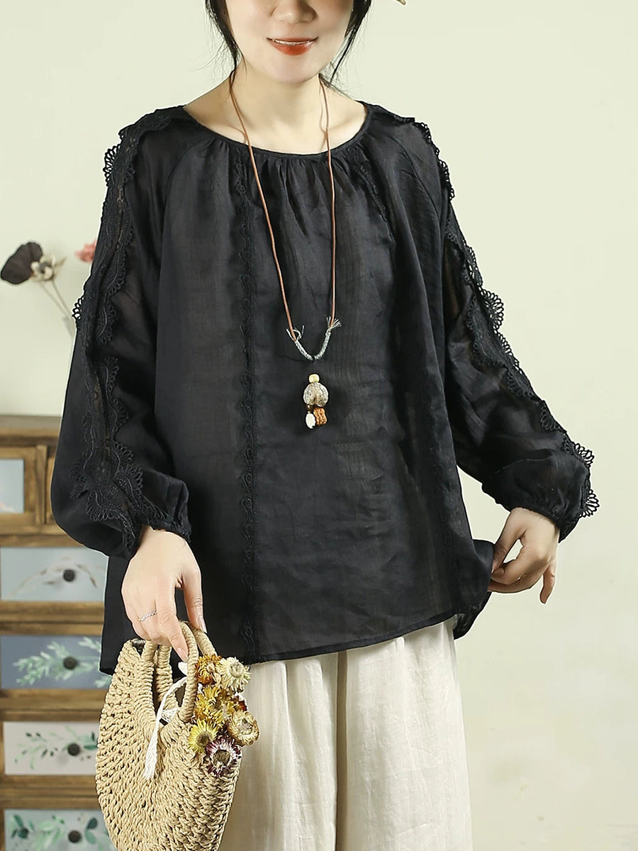 Ženska umjetnička proljetna čipkasta košulja s O-izrezom od 100% ramije