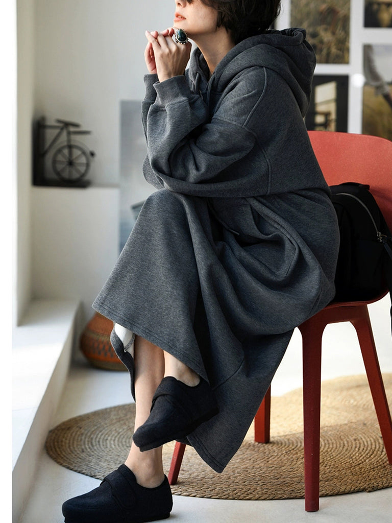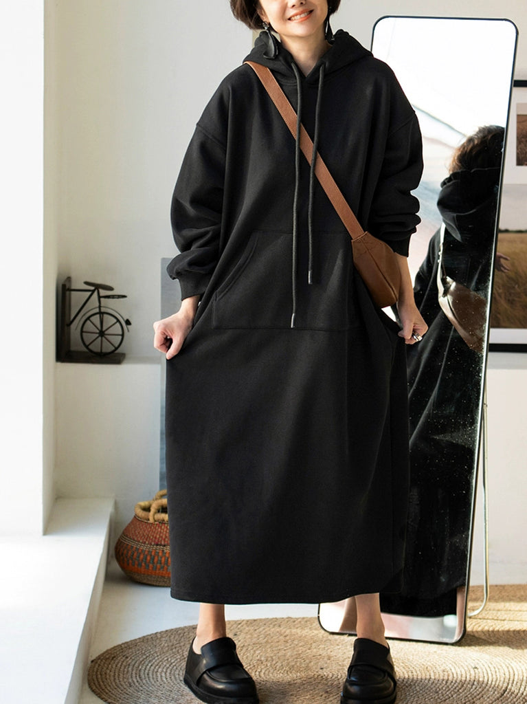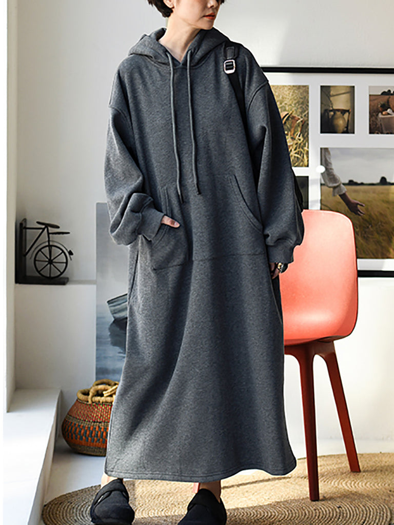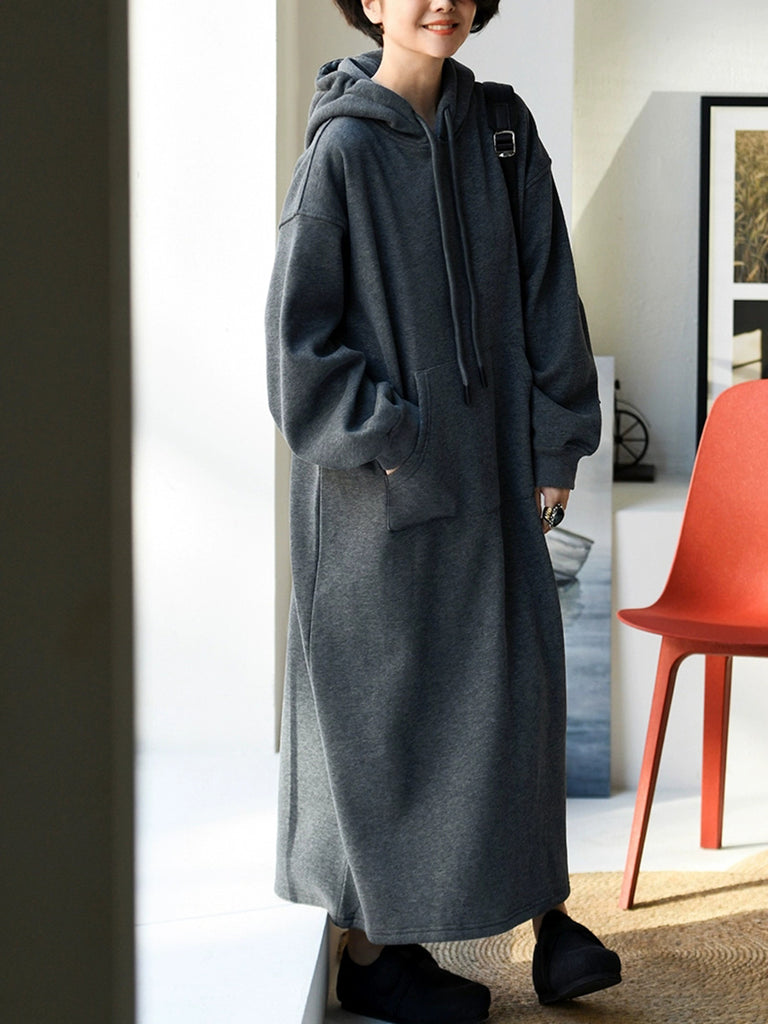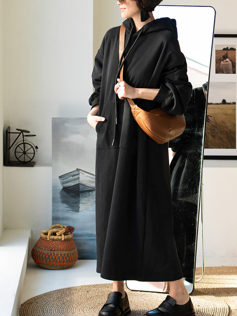 Ženska jesenska ležerna pamučna haljina s kapuljačom u čistoj boji