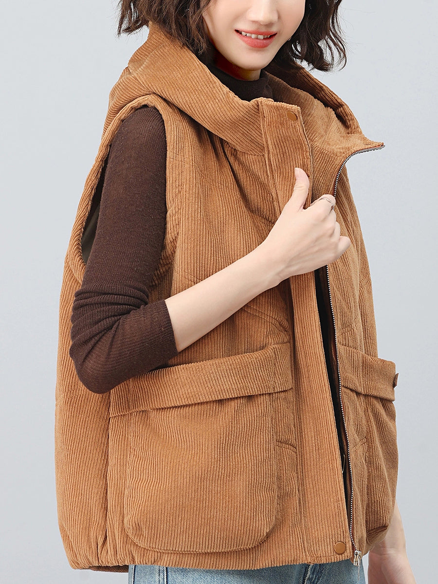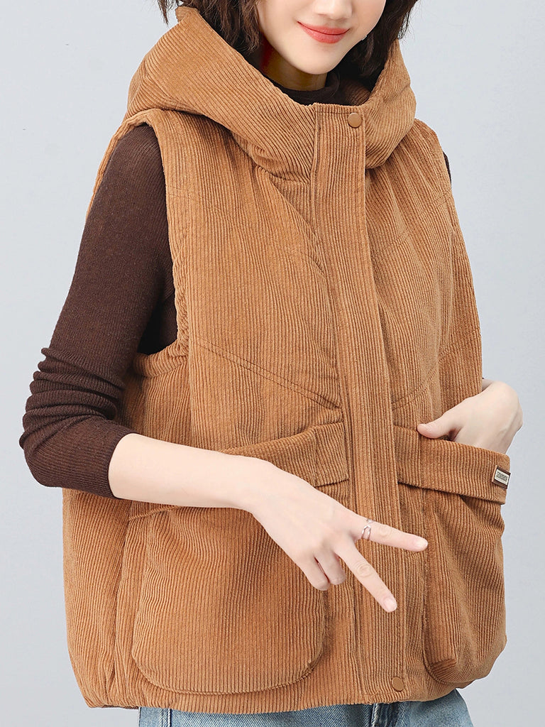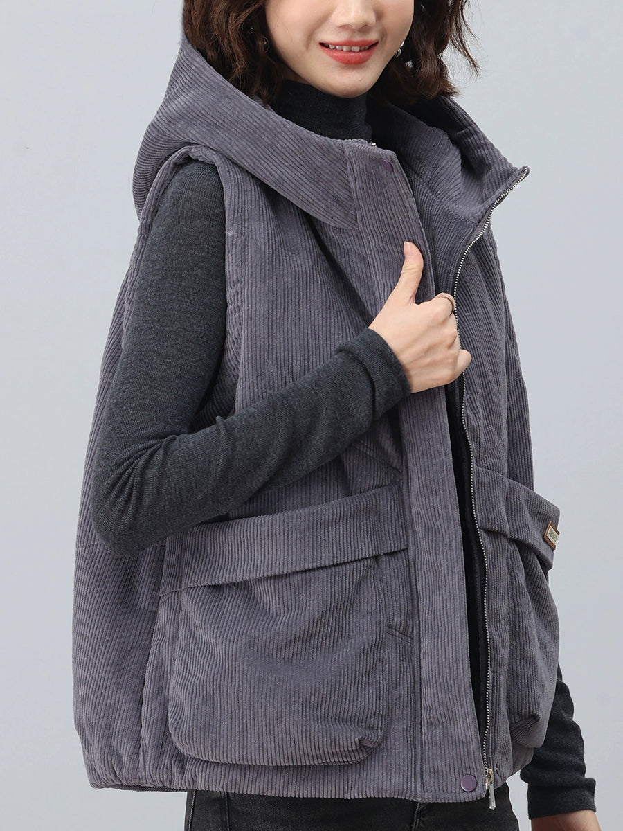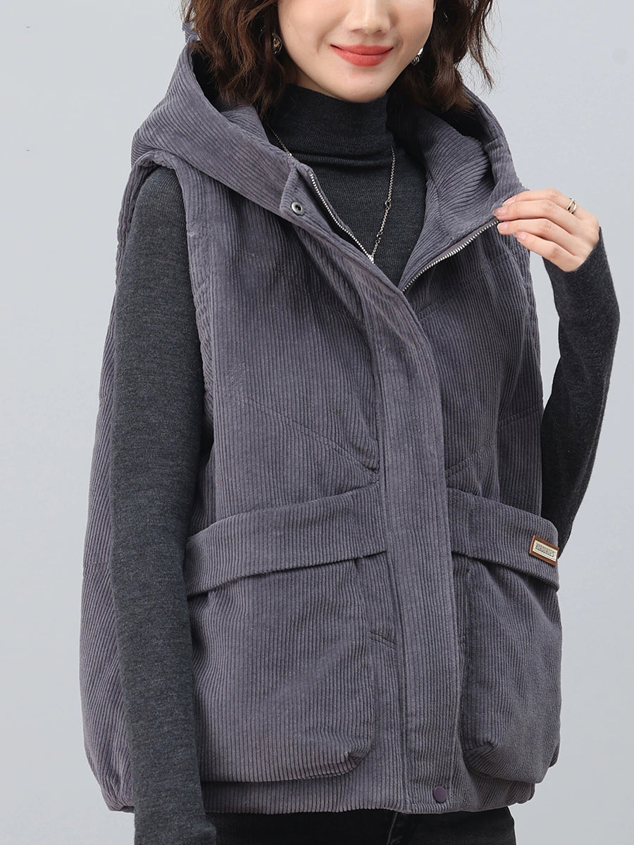 Ženski jesenski retro kordurojni prsluk u čistoj boji s kapuljačom