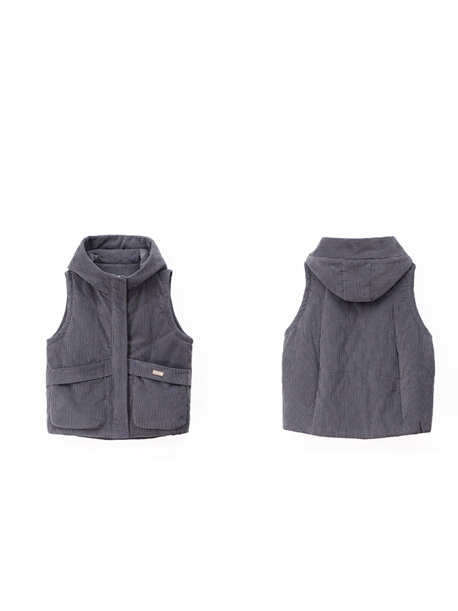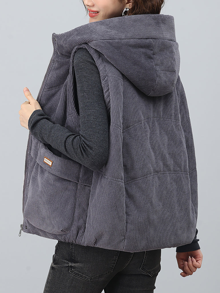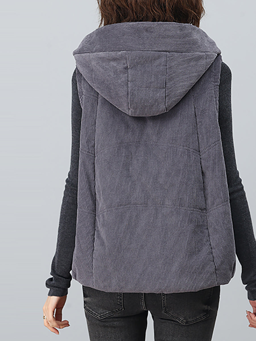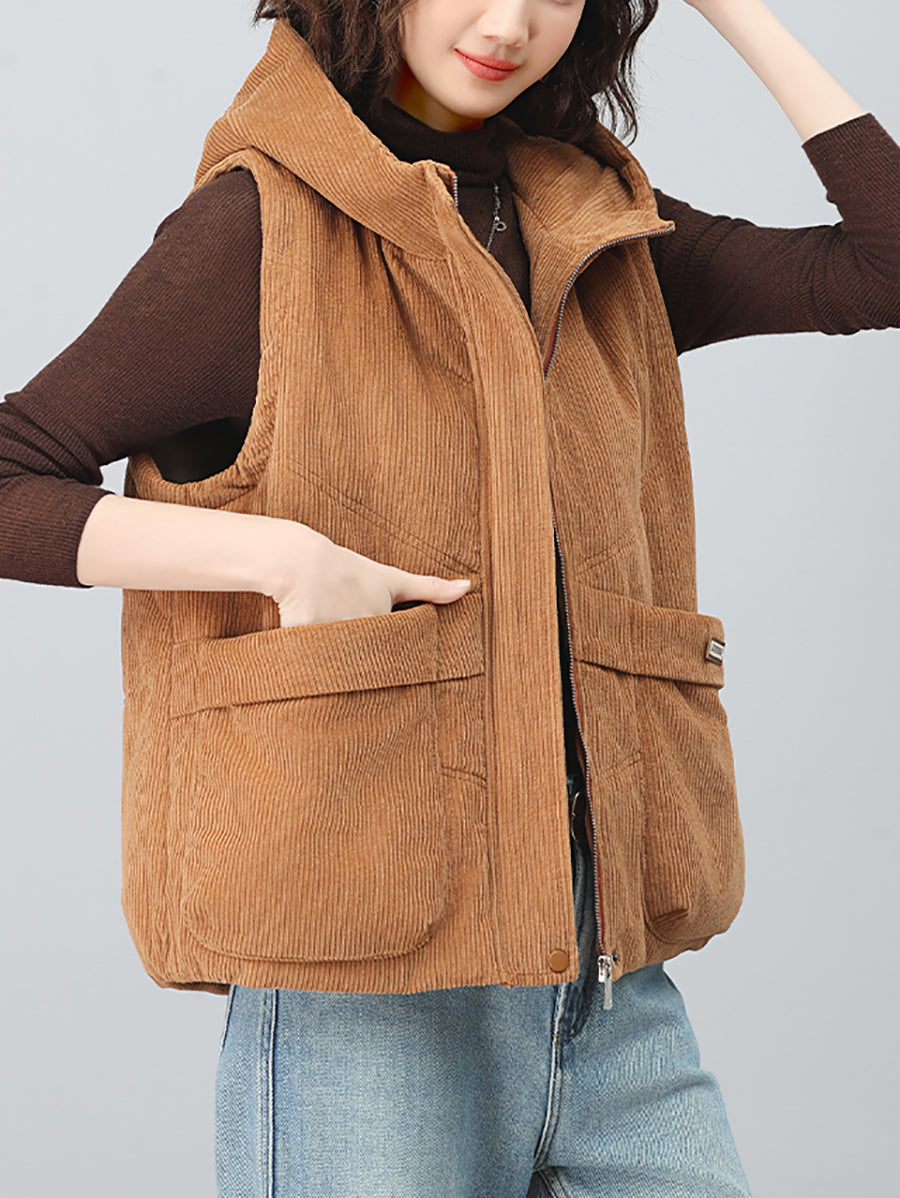 Ženski jesenski retro kordurojni prsluk u čistoj boji s kapuljačom