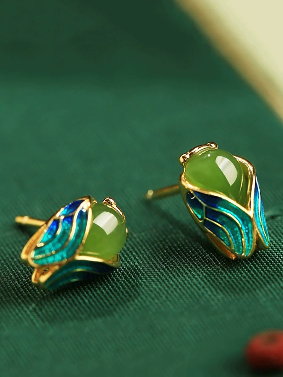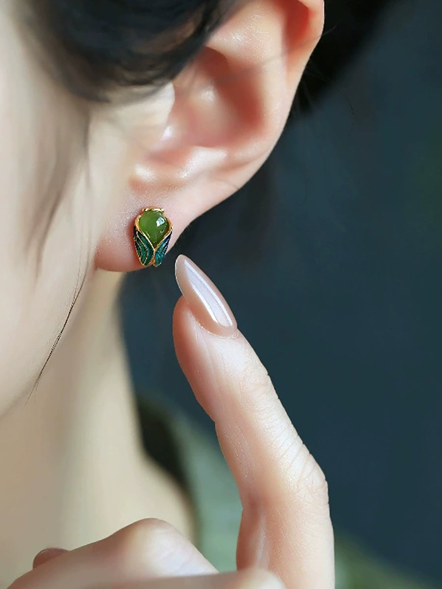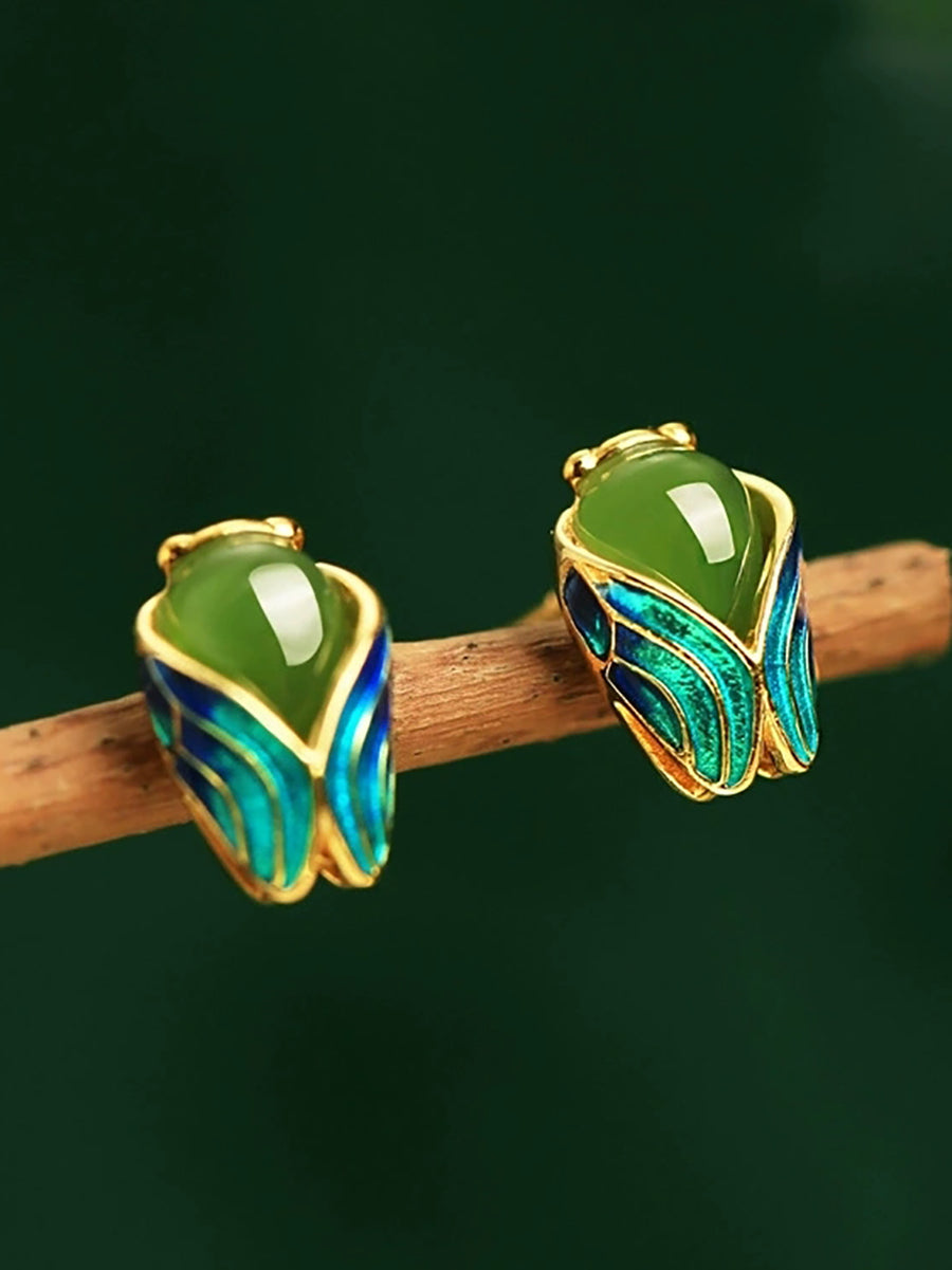 Ženske etničke emajlirane naušnice od žada s zlatnim cvrčkom
