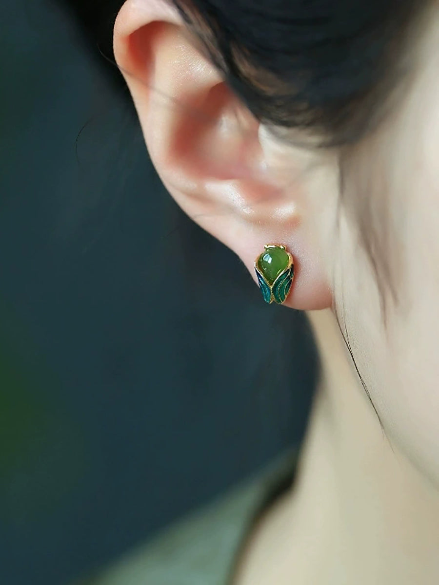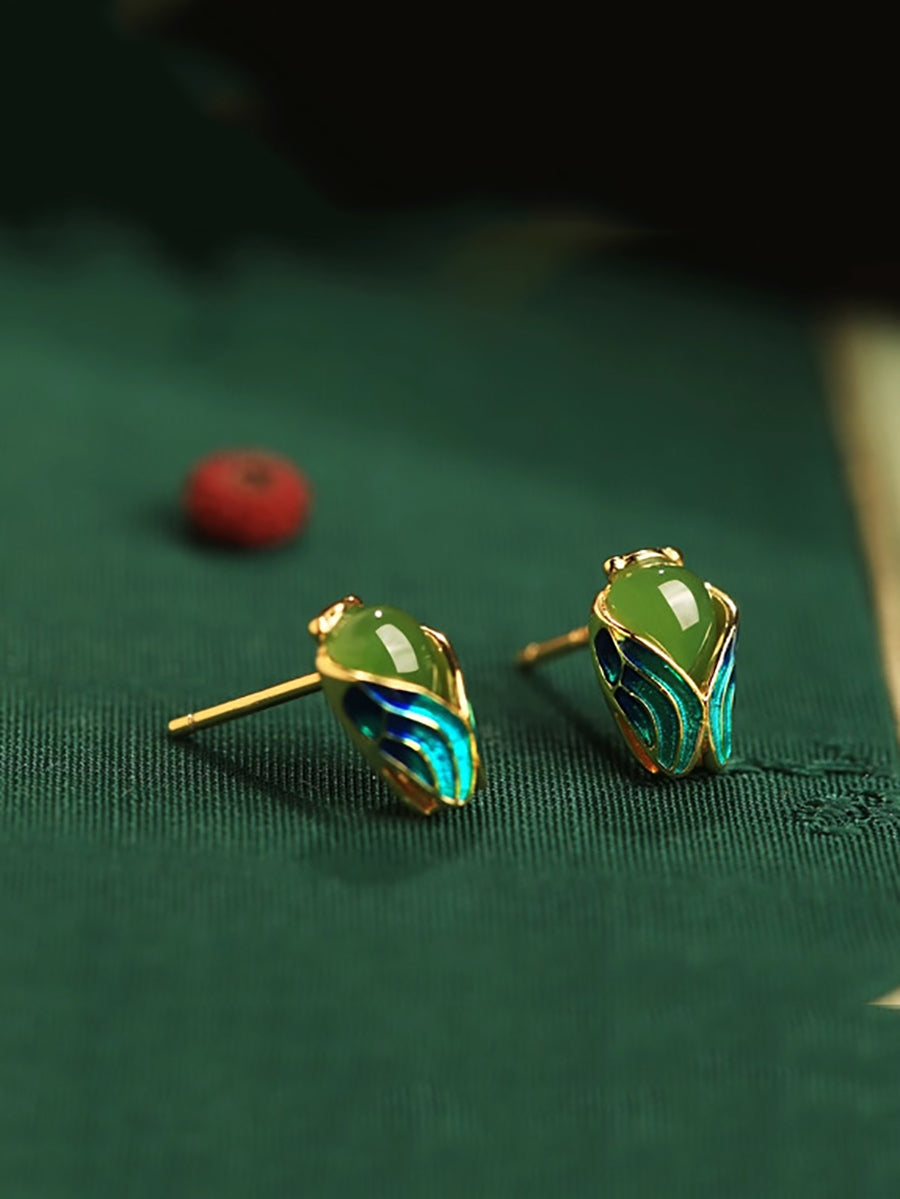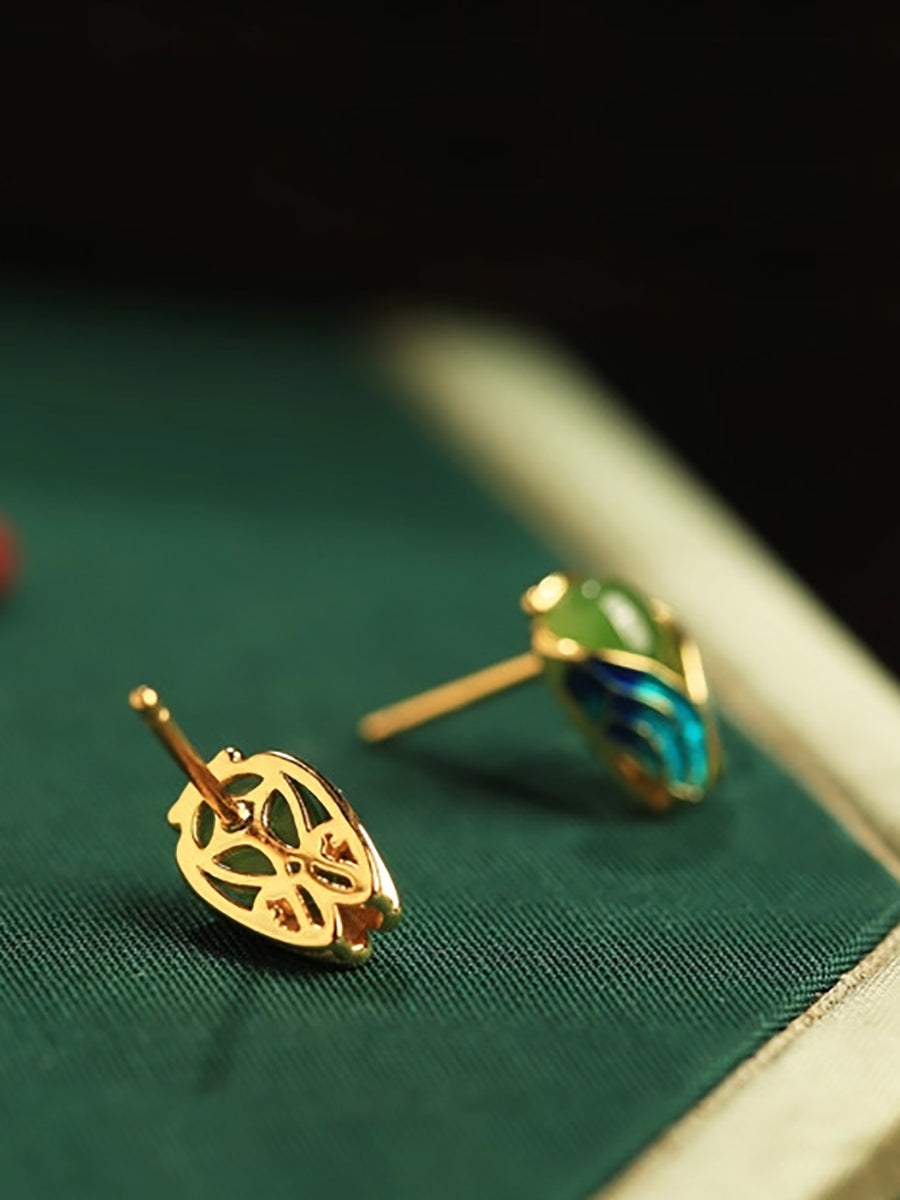 Ženske etničke emajlirane naušnice od žada s zlatnim cvrčkom