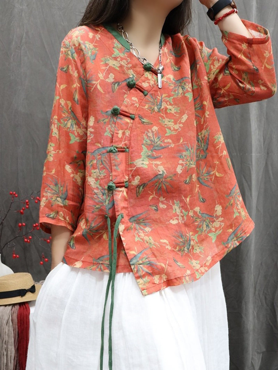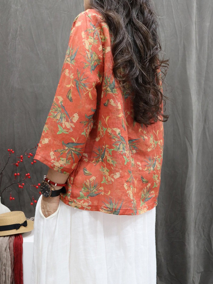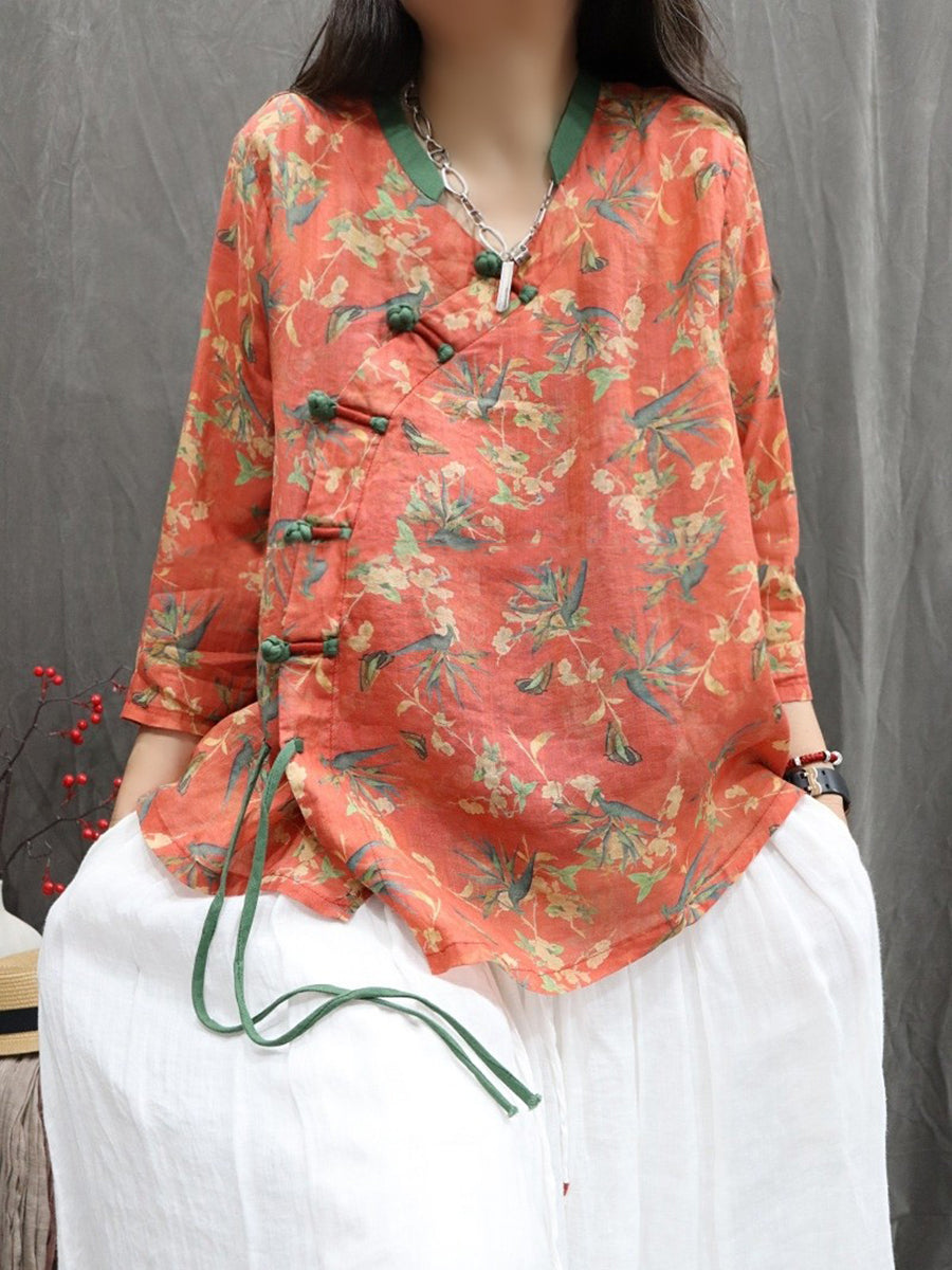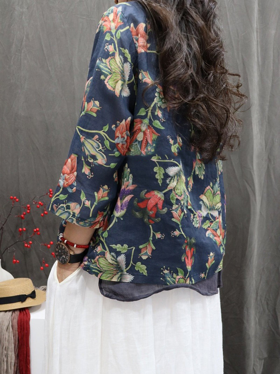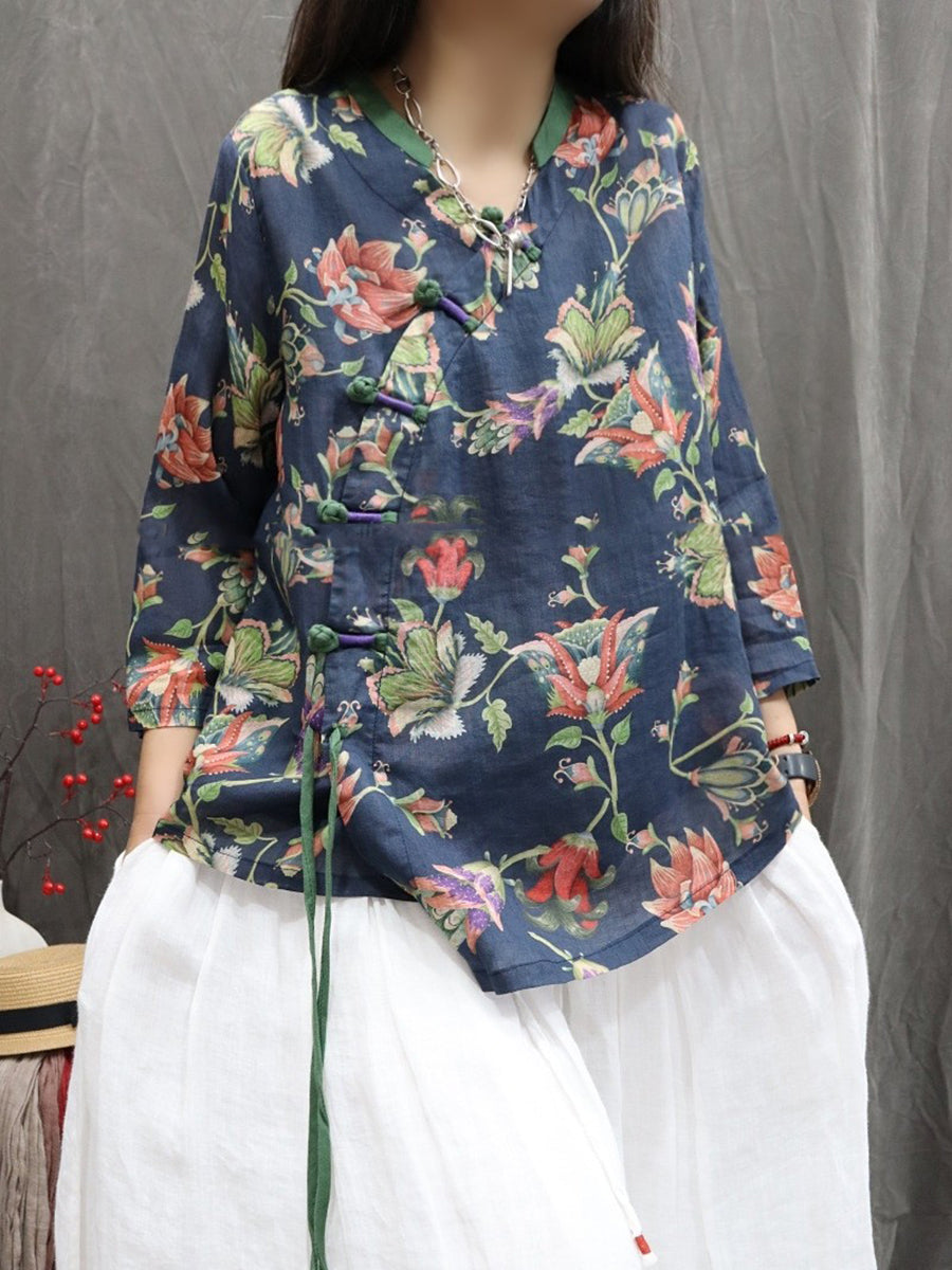 Ženska etnička košulja s V-izrezom i proljetnim cvijećem, 100% rami