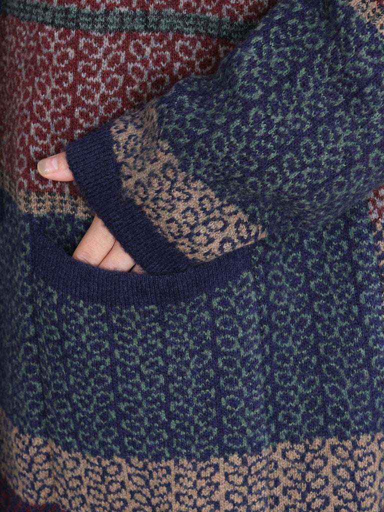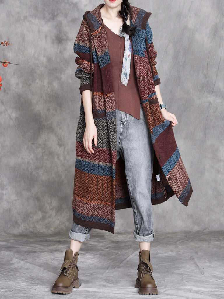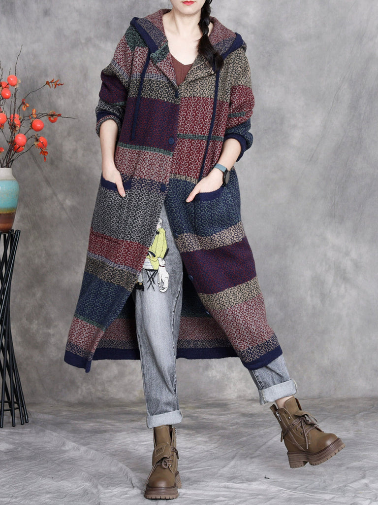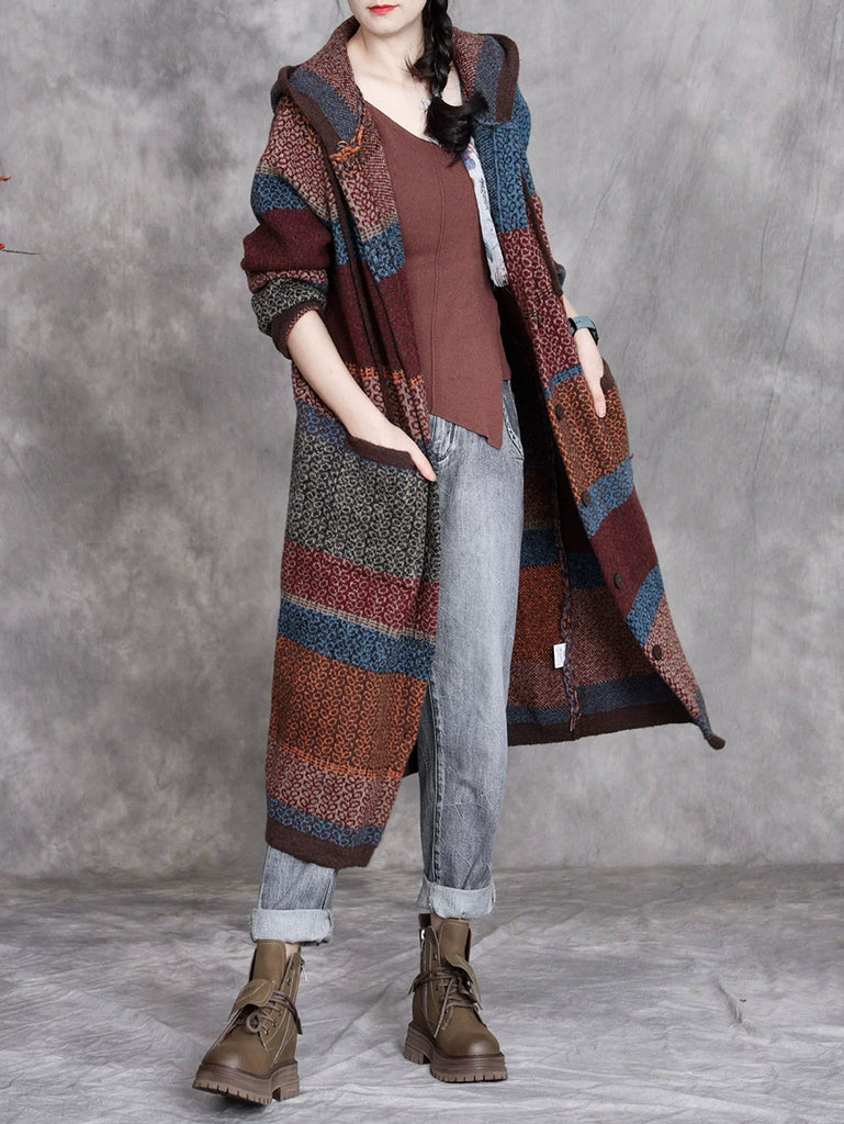 Ženski retro zimski pleteni kaput s kapuljačom i vunom u boji
