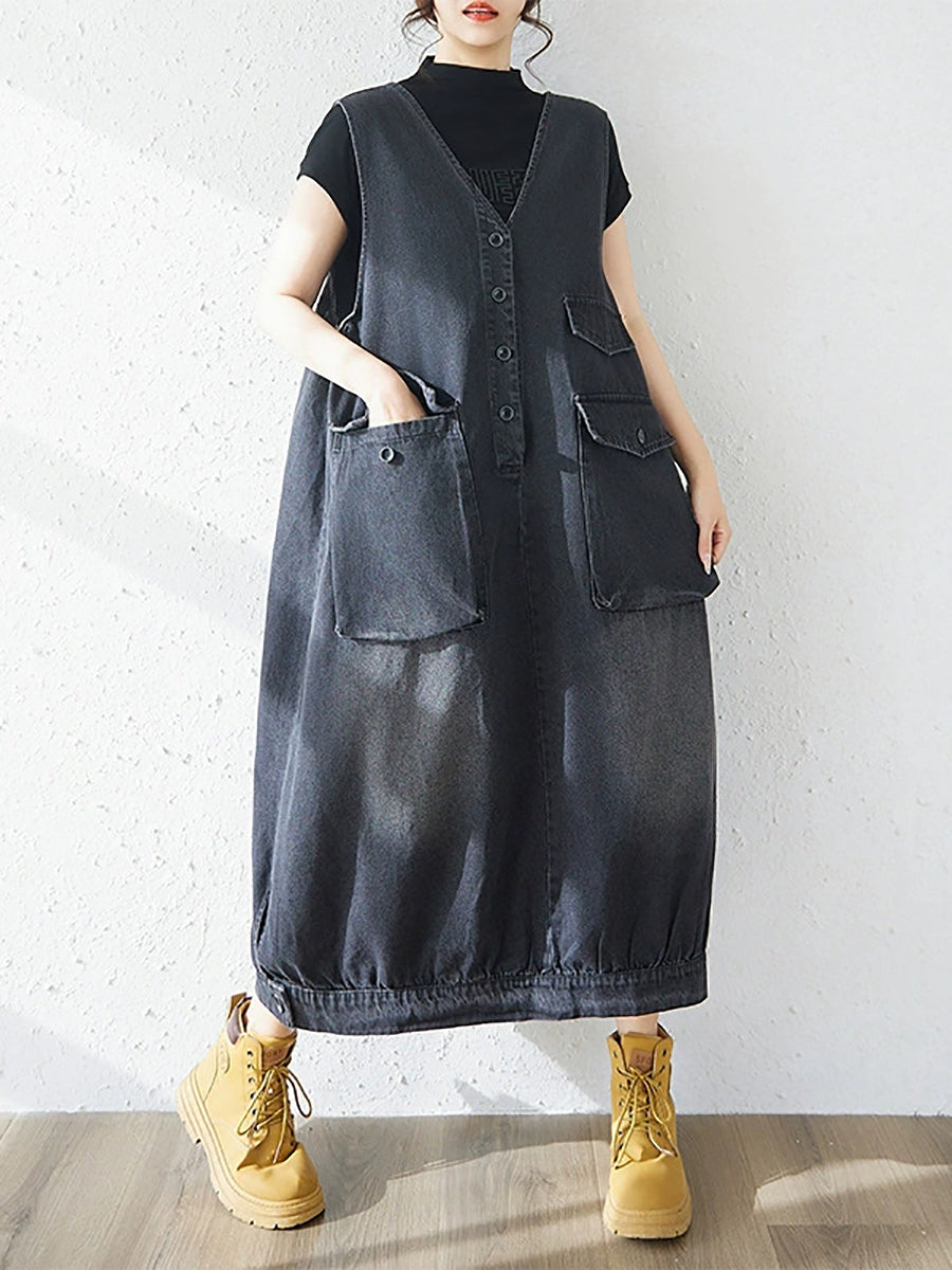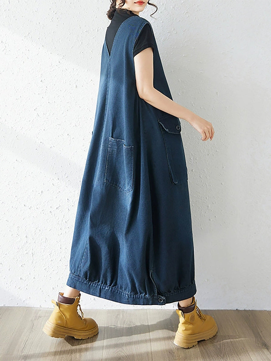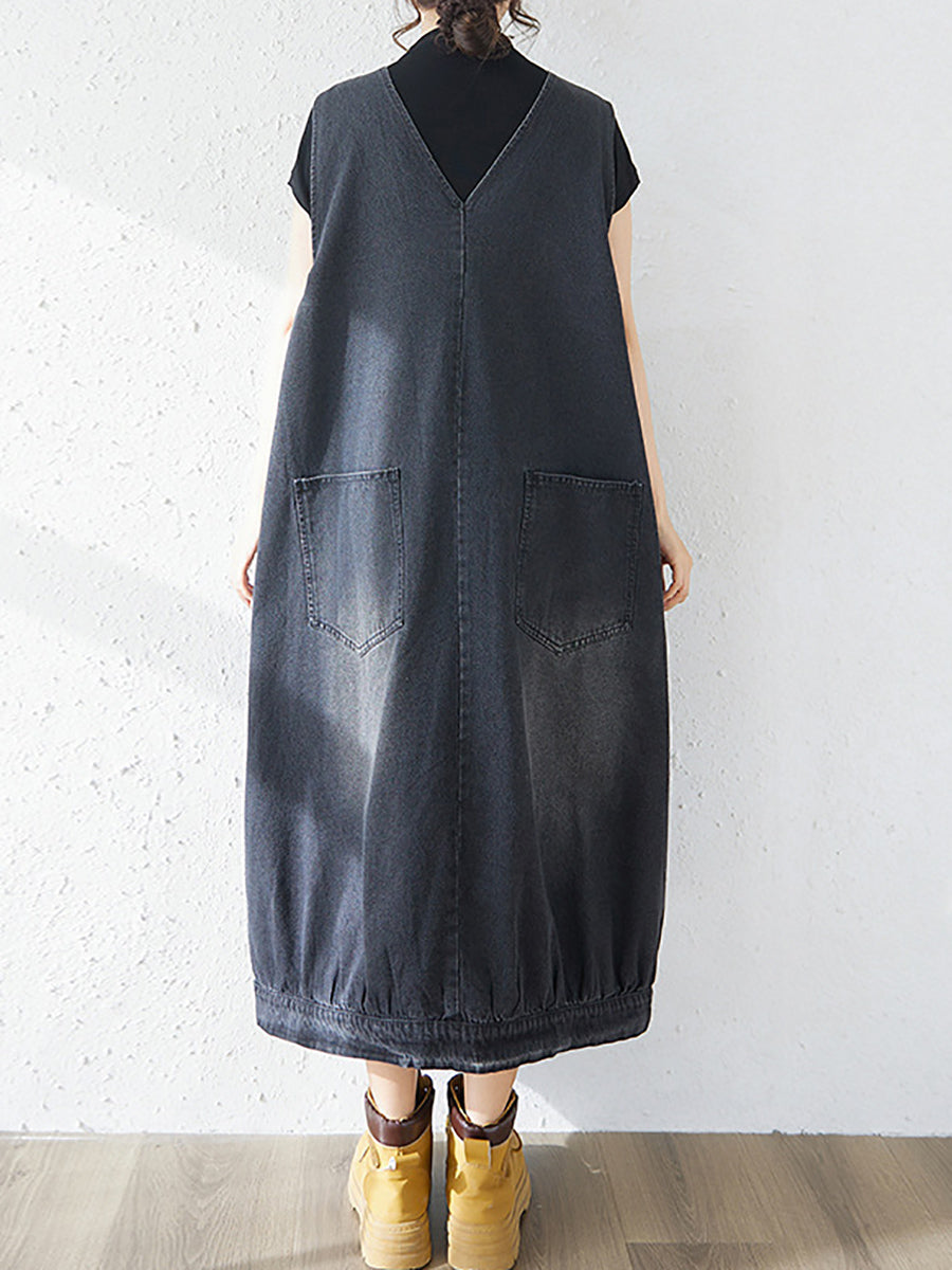 Ženska proljetna ležerna traper haljina s V-izrezom u čistoj boji