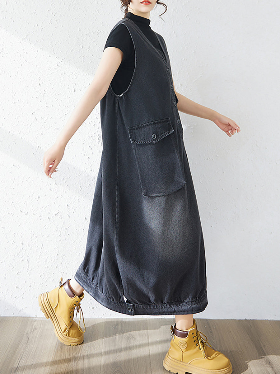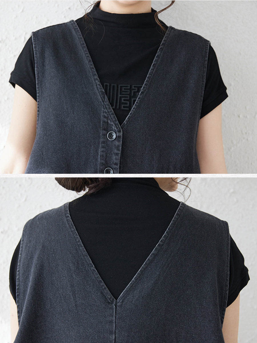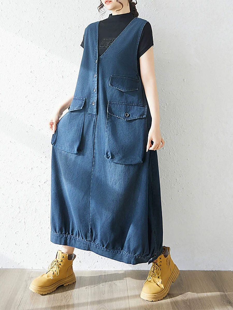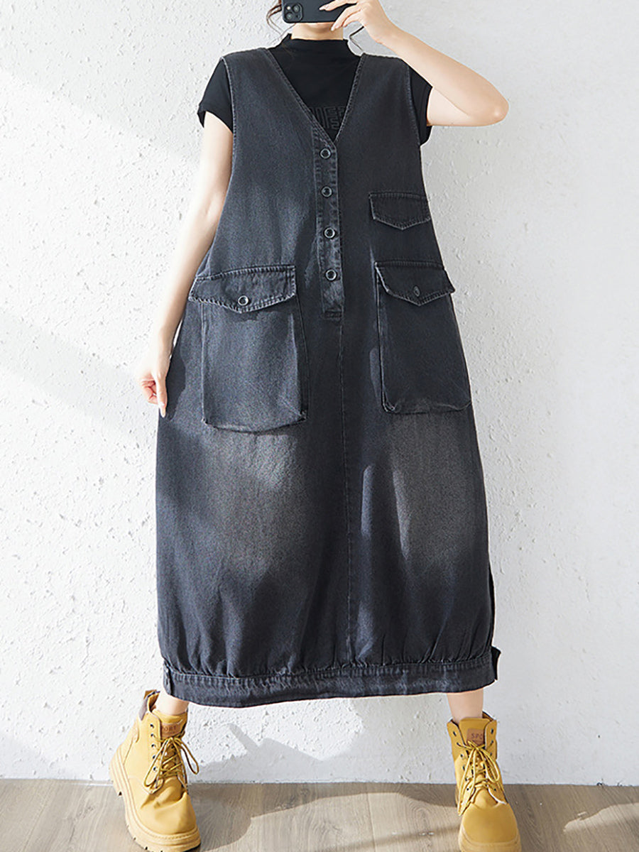 Ženska proljetna ležerna traper haljina s V-izrezom u čistoj boji