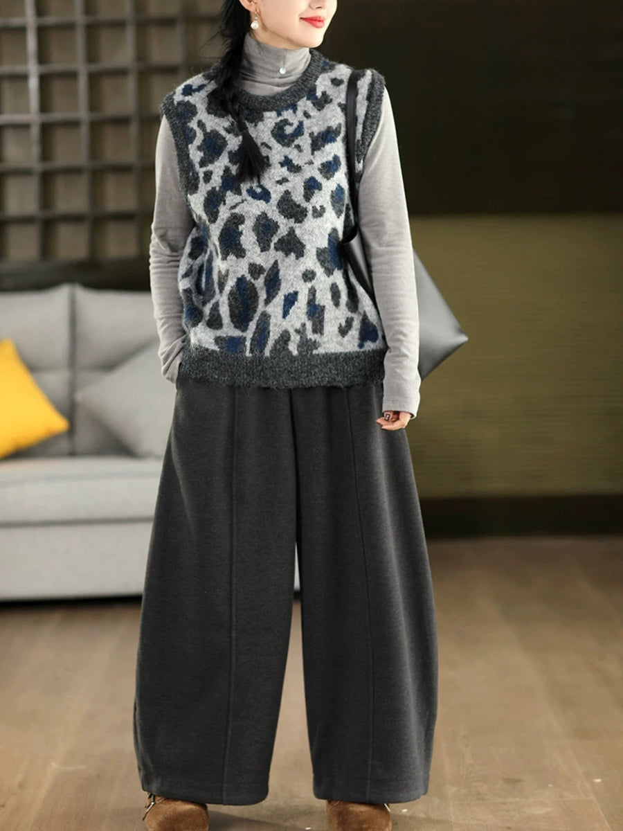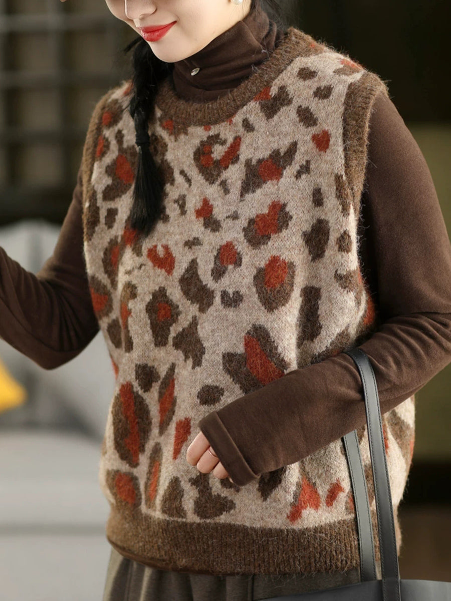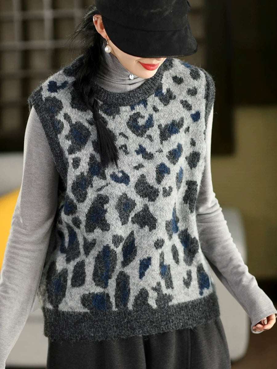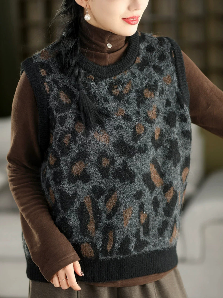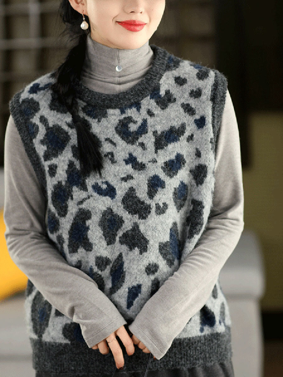 Ženski proljetni modni pleteni prsluk s leopard žakard uzorkom i O-izrezom