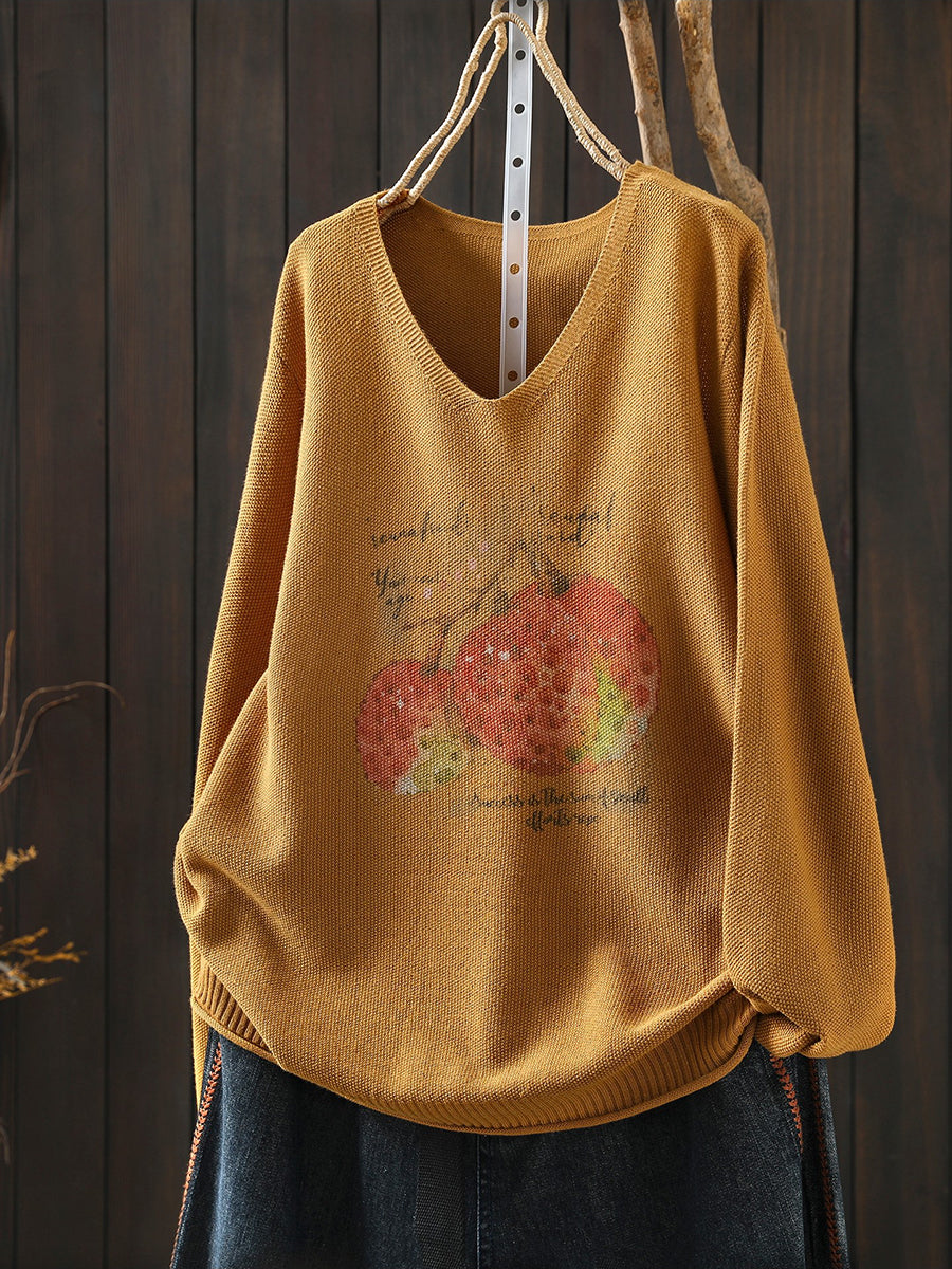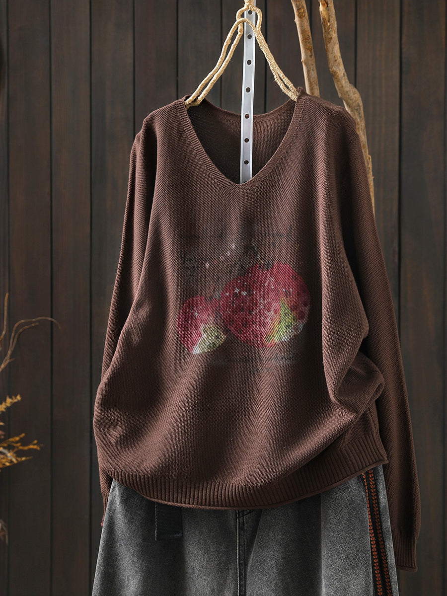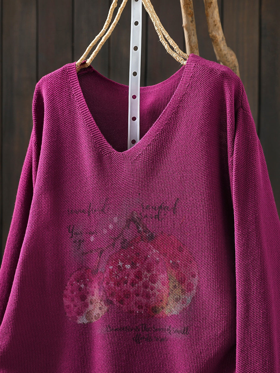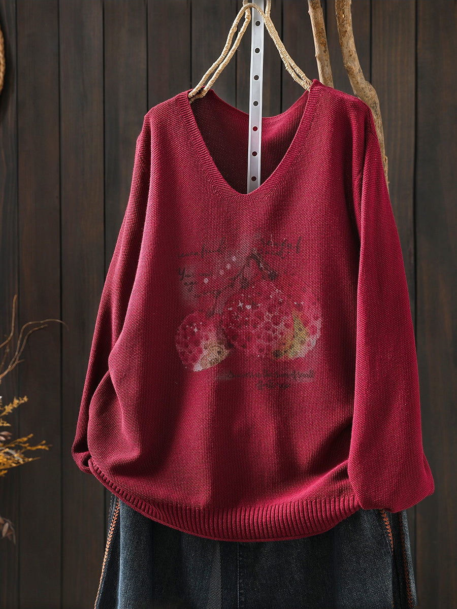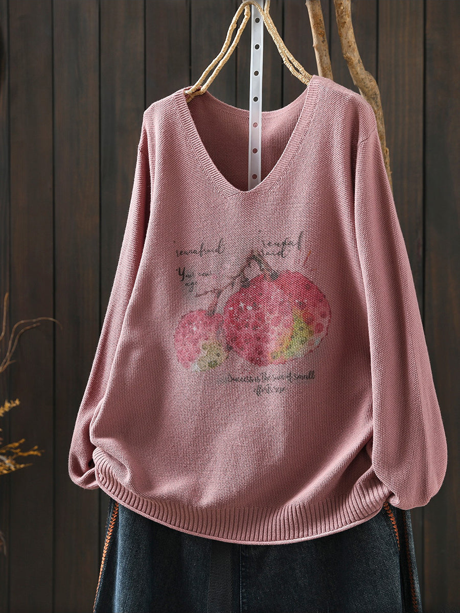 Ženska pletena bluza s proljetnim printom i V-izrezom