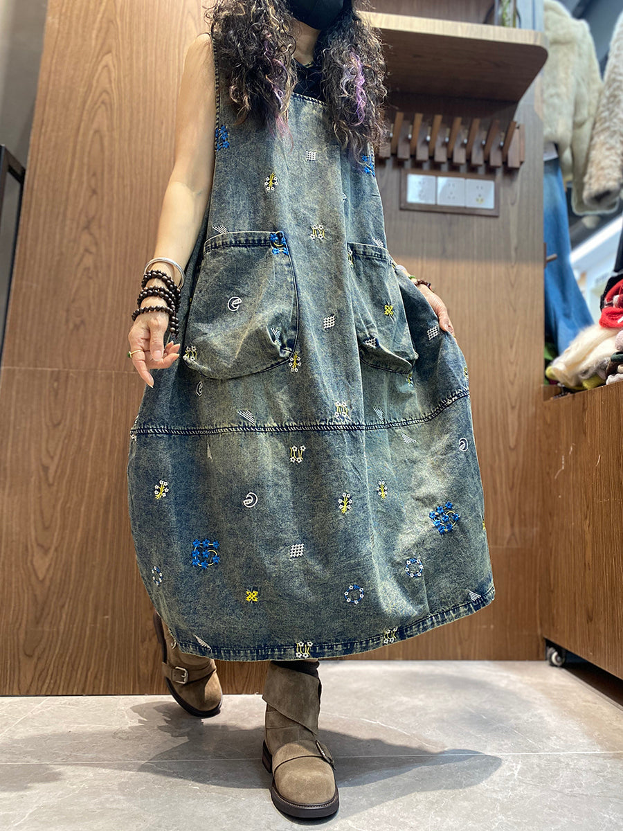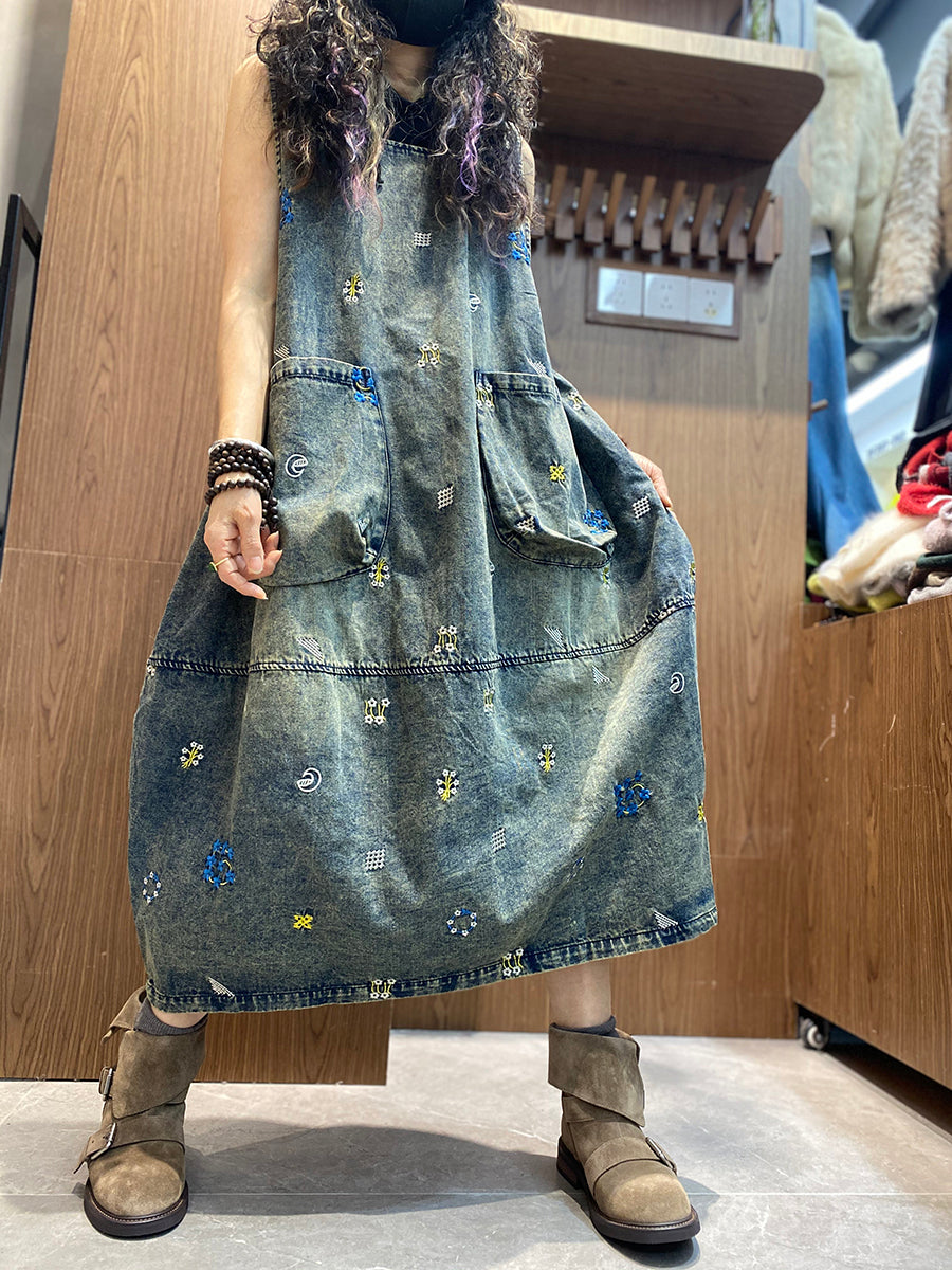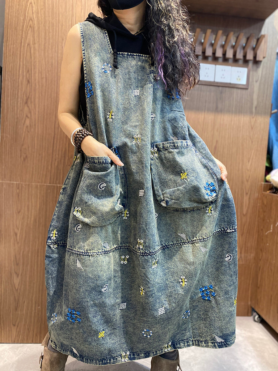 Ženska proljetna retro traper haljina s cvjetnim vezom