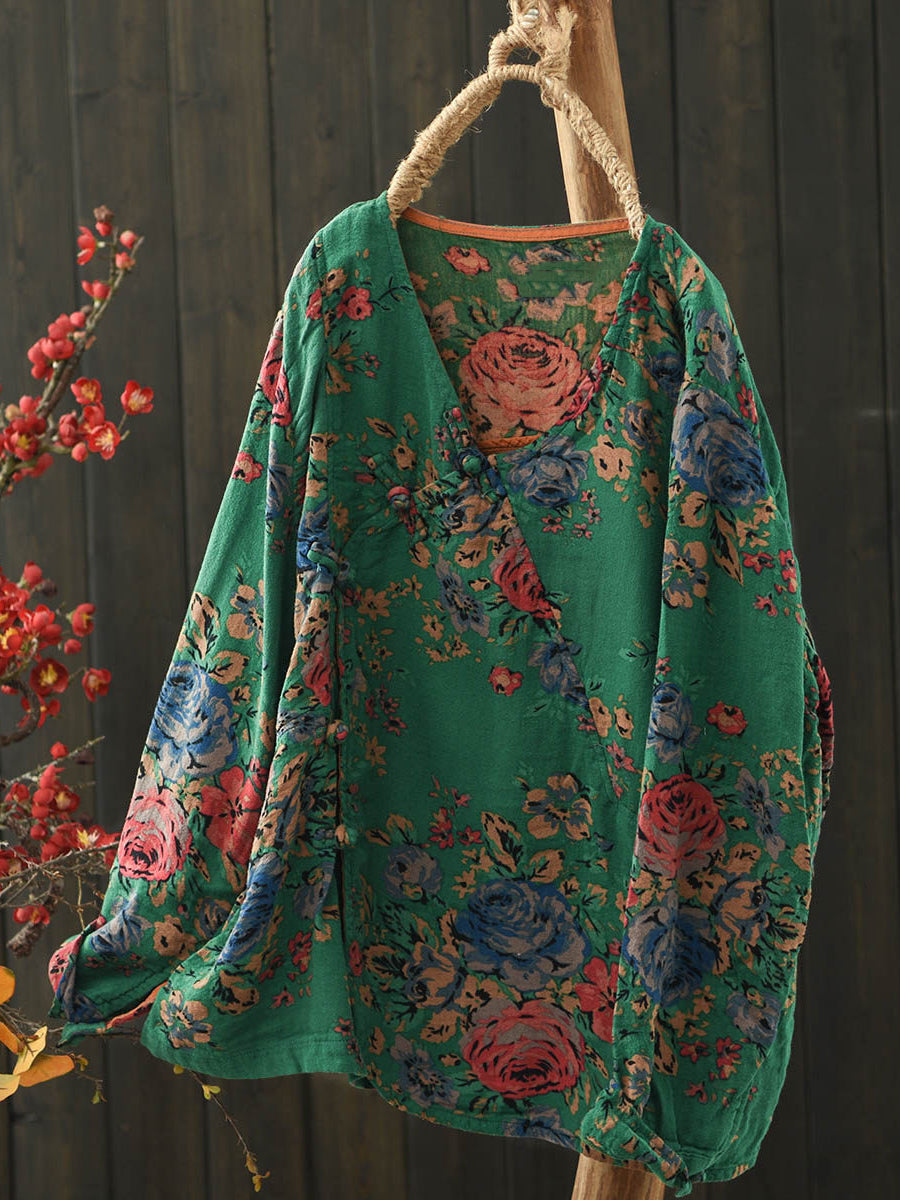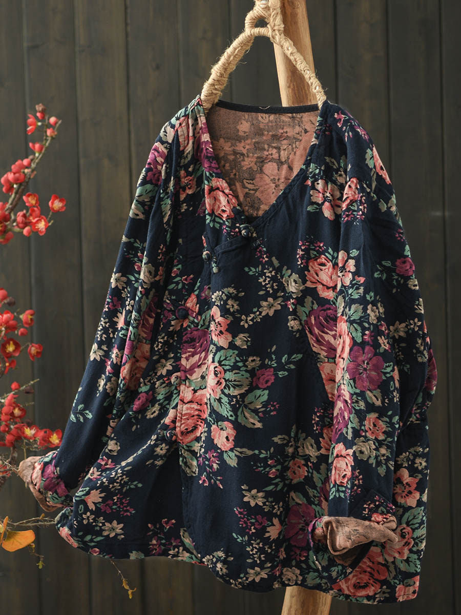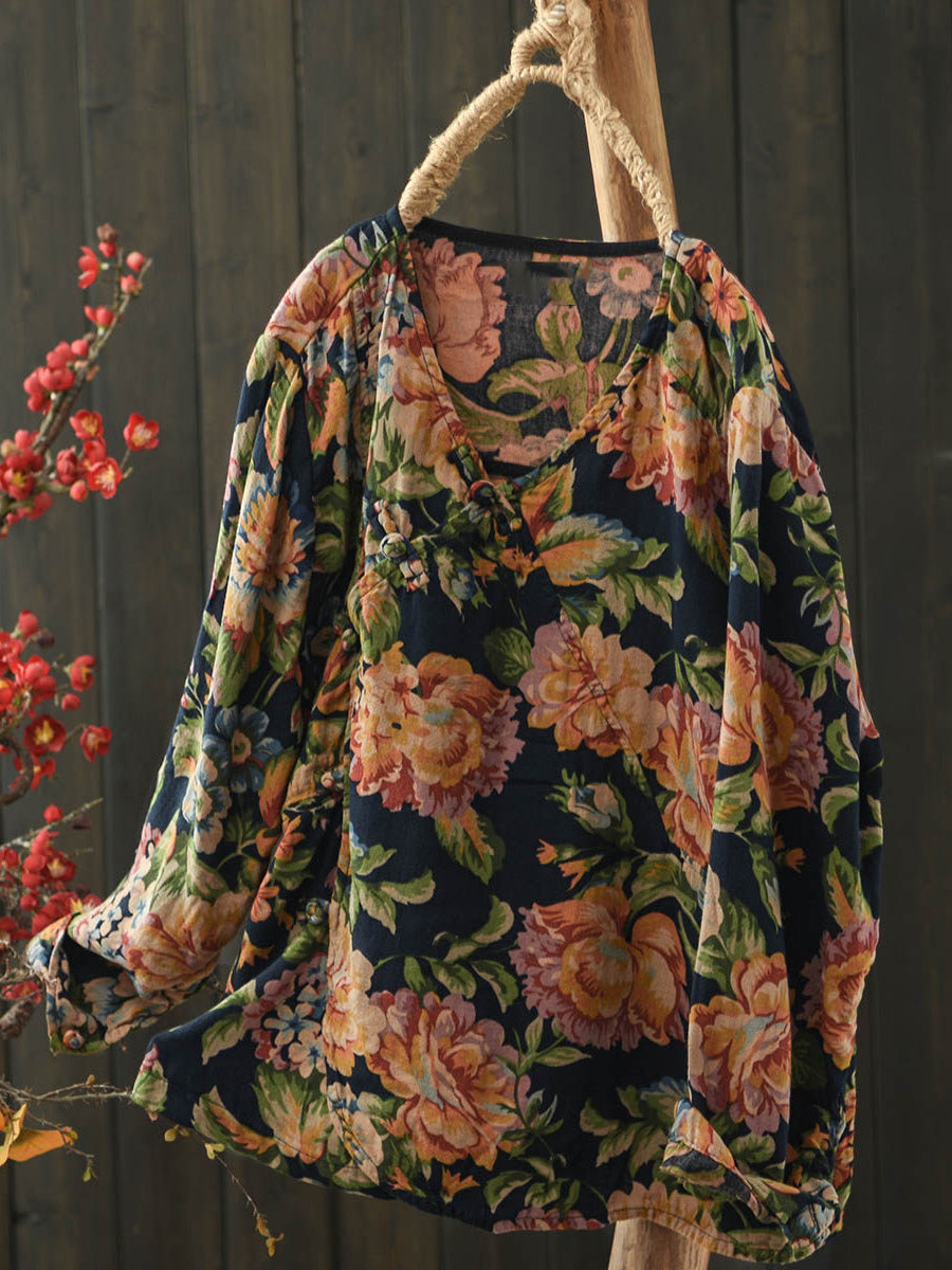 Ženska proljetna retro pamučna bluza s V-izrezom i cvijećem