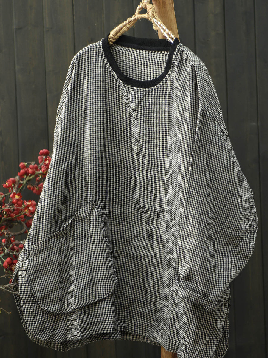 Ženska proljetna retro lanena košulja s O-izrezom i rešetkastim izrezom