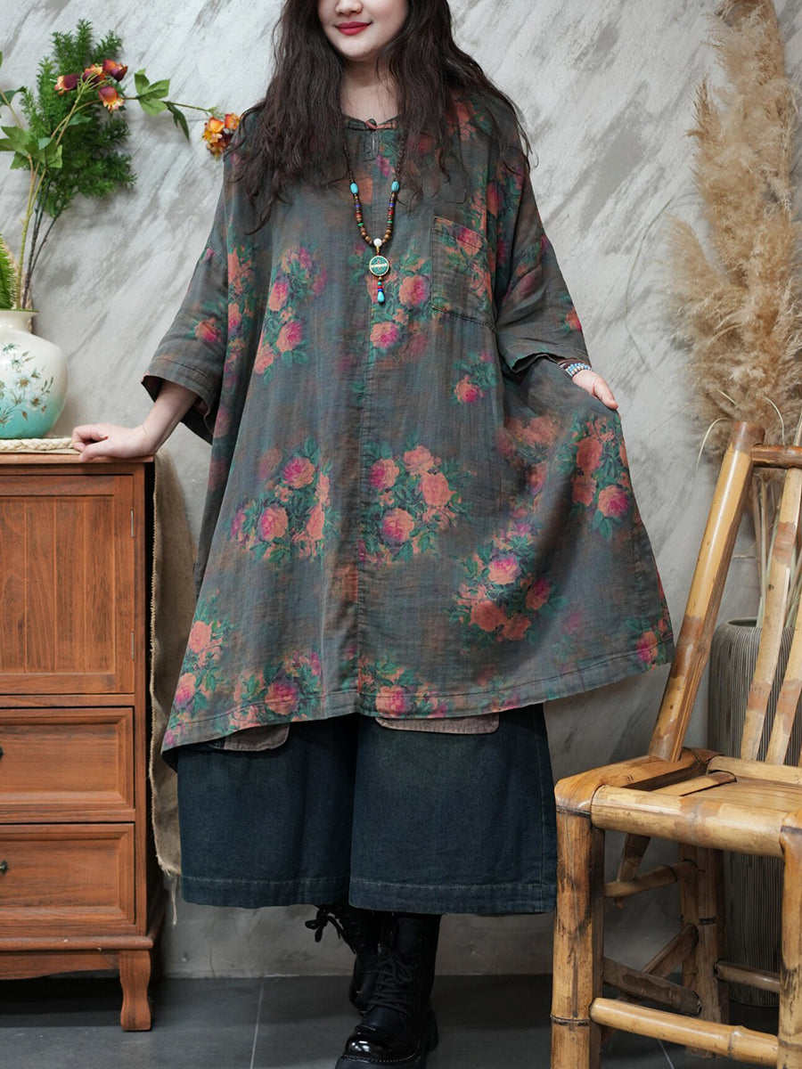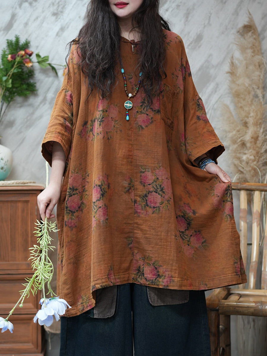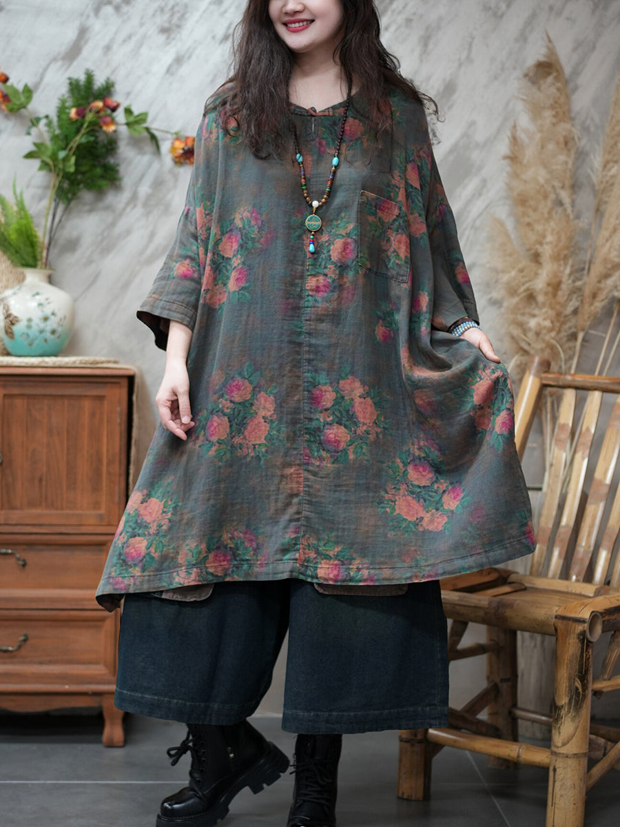 Ženska ljetna vintage cvjetna duga košulja s O-izrezom