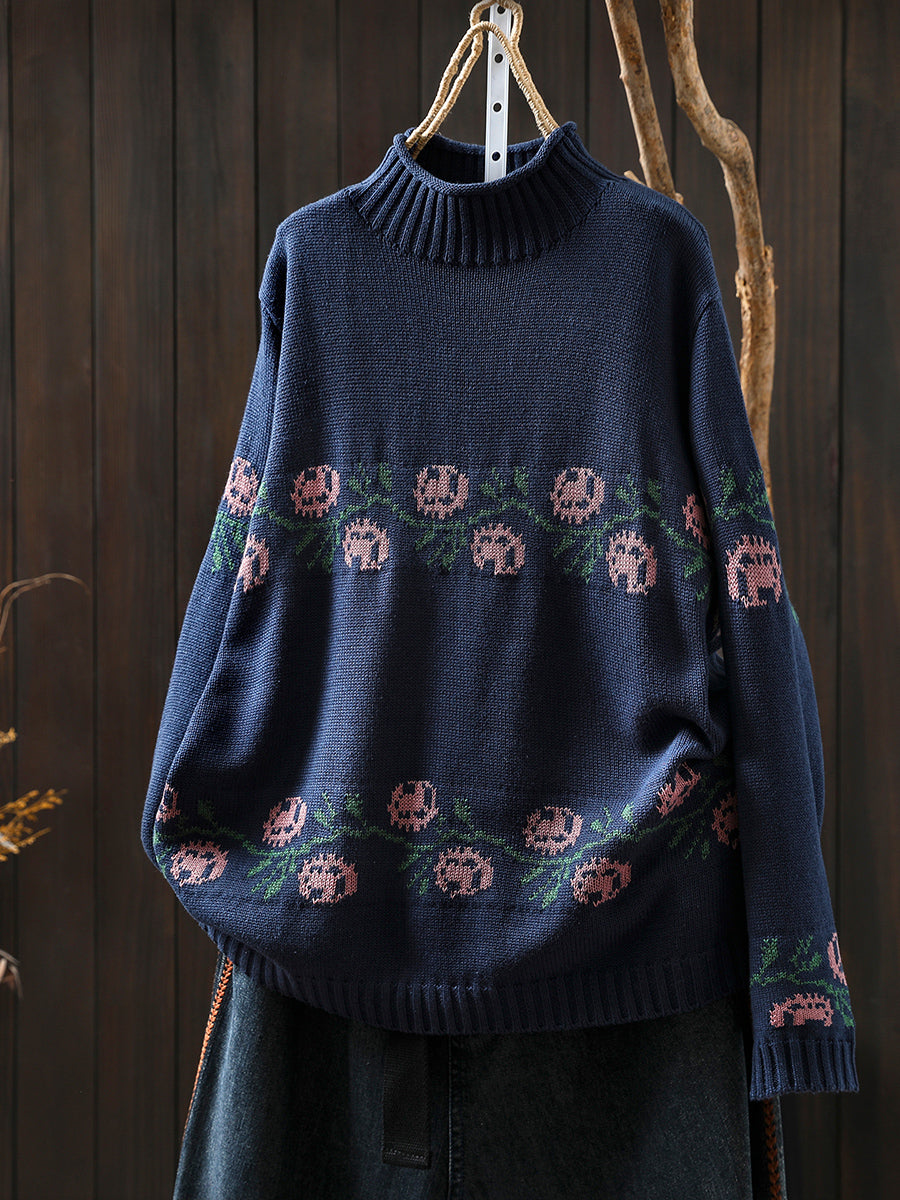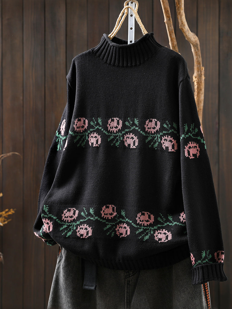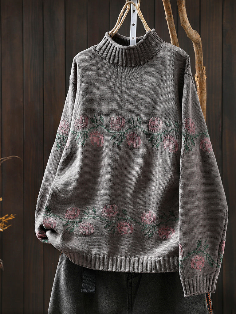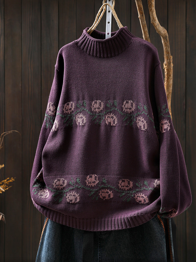 Ženski vintage jesenski cvjetni pulover s polu-rolkom