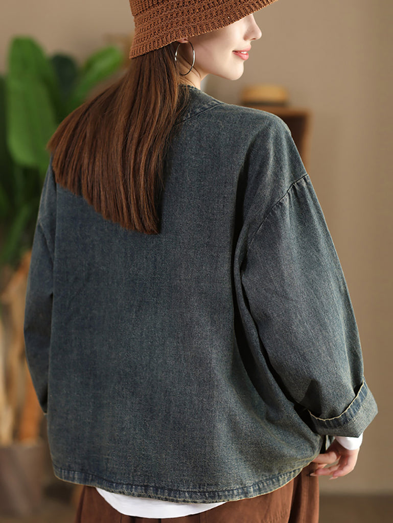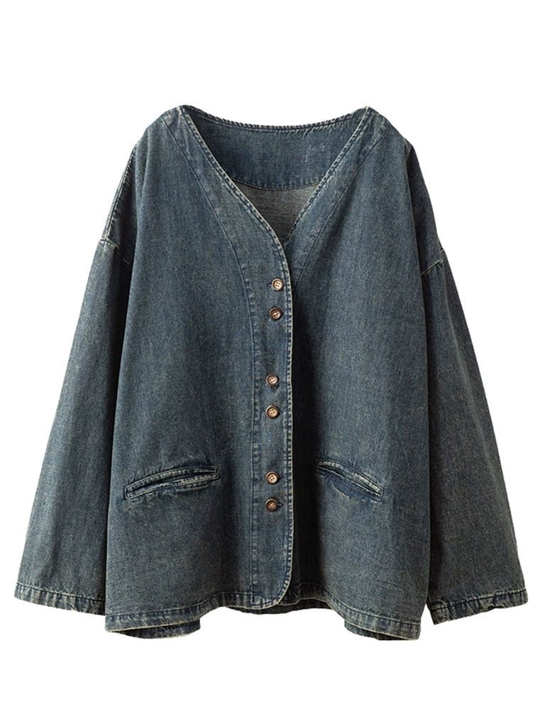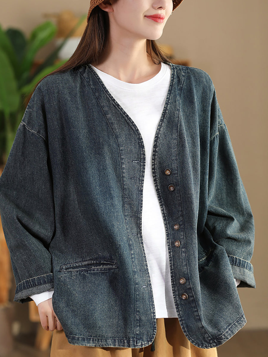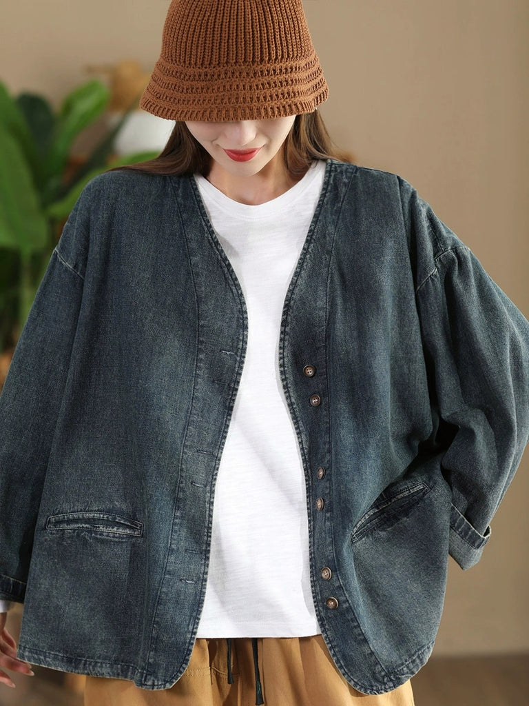 Ženska vintage jesenska traper jakna s V-izrezom u čistoj boji